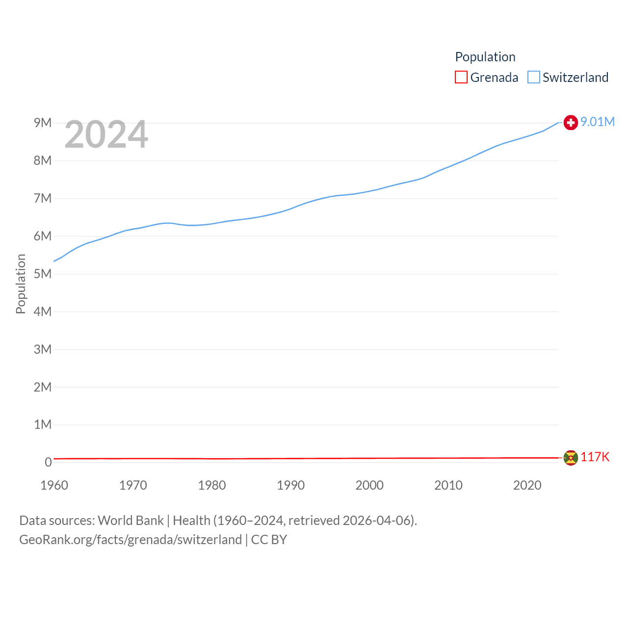 Grenada has a population of 117K (ranked 182/197), compared with 9.01M in Switzerland (ranked 101/197). Grenada's land area is 131.3 sq mi versus 15,255 sq mi for Switzerland (ranked 186th vs. 131st).