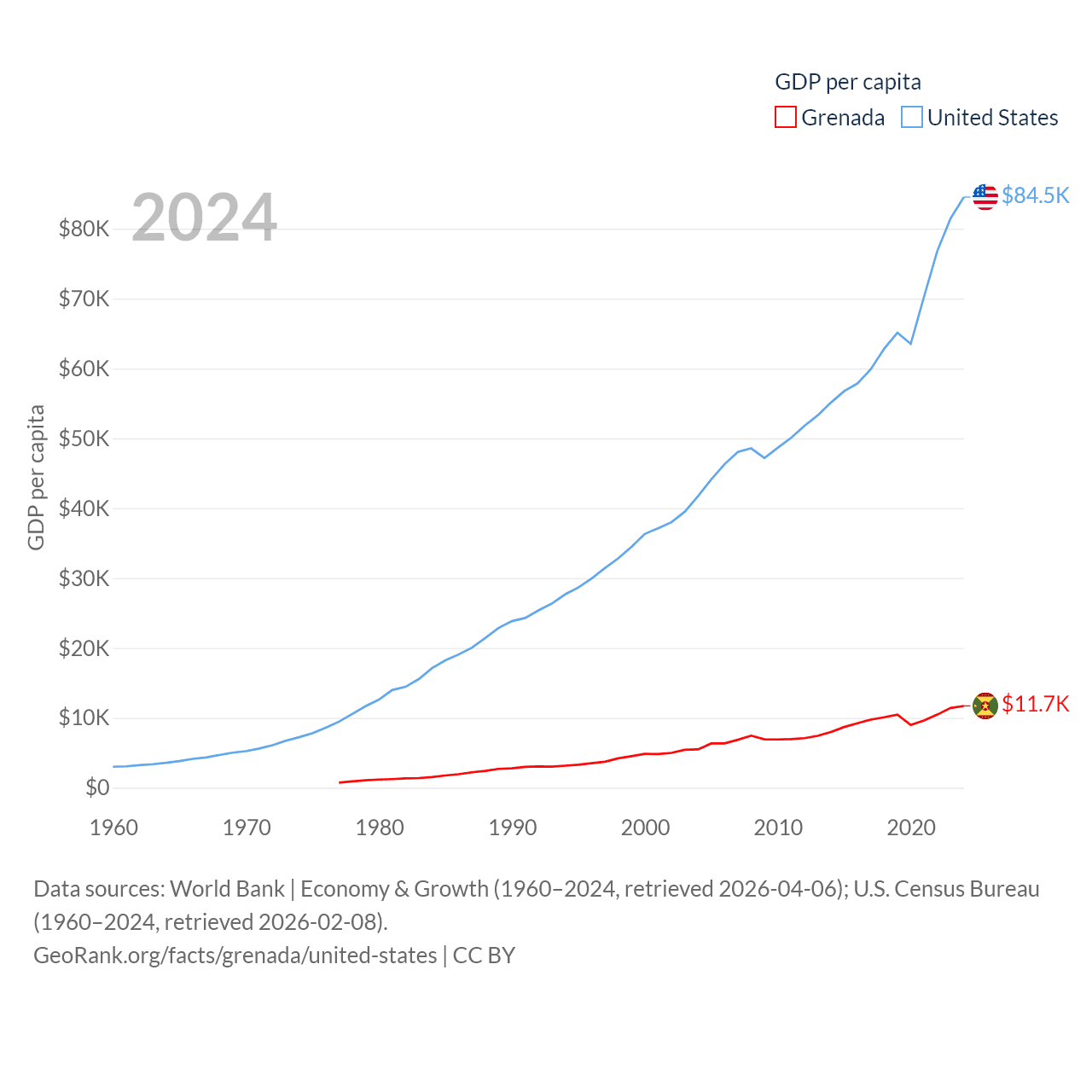 By GDP, Grenada ranks 184/197 ($1.37B) and The United States ranks 1/197 ($28.8T). By GDP per capita, Grenada ranks 80/197 ($11,705), while The United States ranks 10/197 ($84,534).