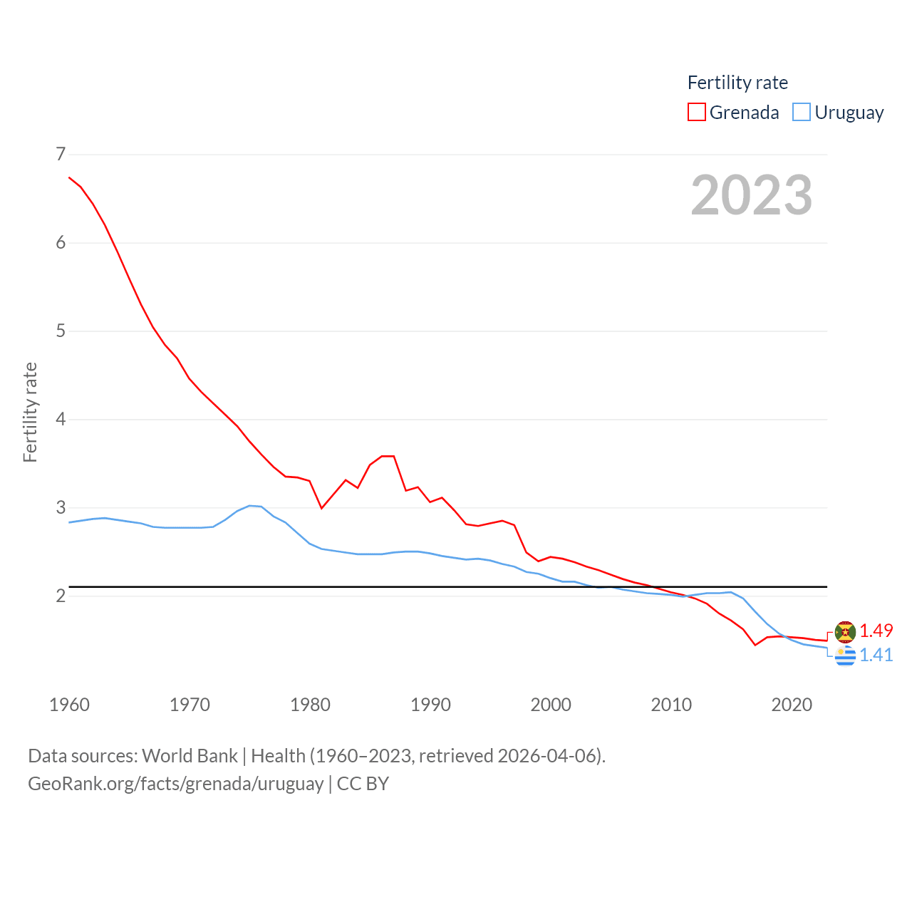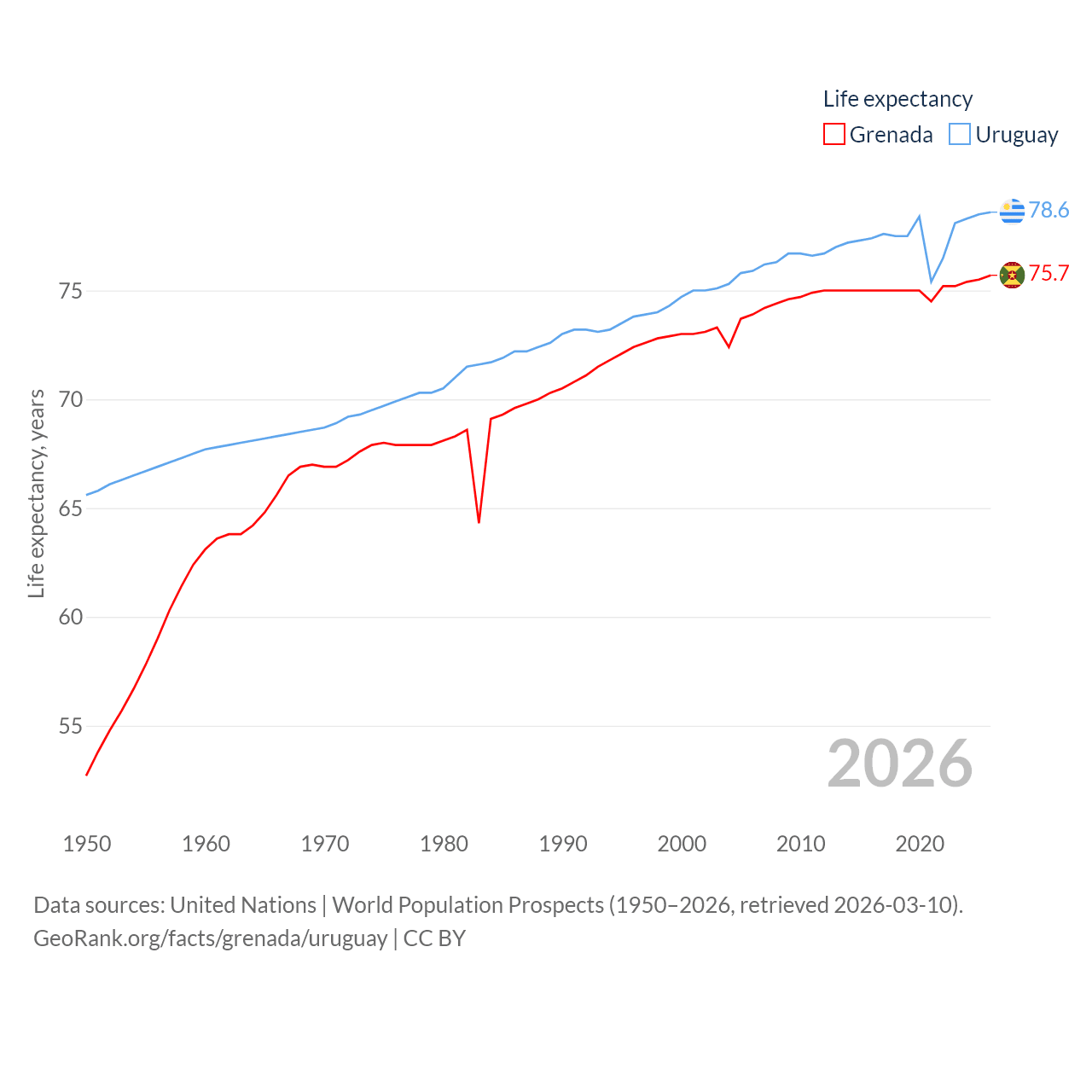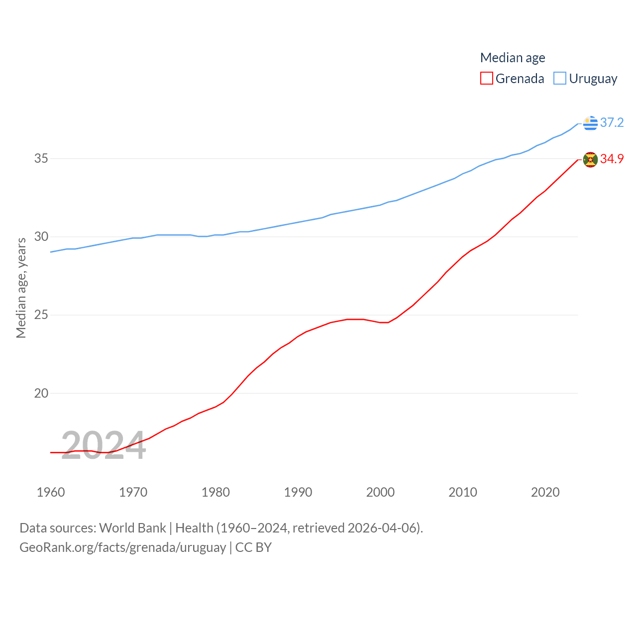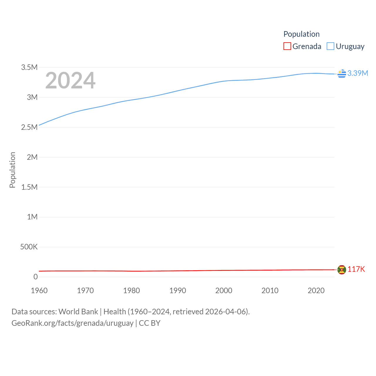Grenada has a population of 117K (ranked 182/197), compared with 3.39M in Uruguay (ranked 133/197). Grenada's land area is 131.3 sq mi versus 67,576 sq mi for Uruguay (ranked 186th vs. 89th).