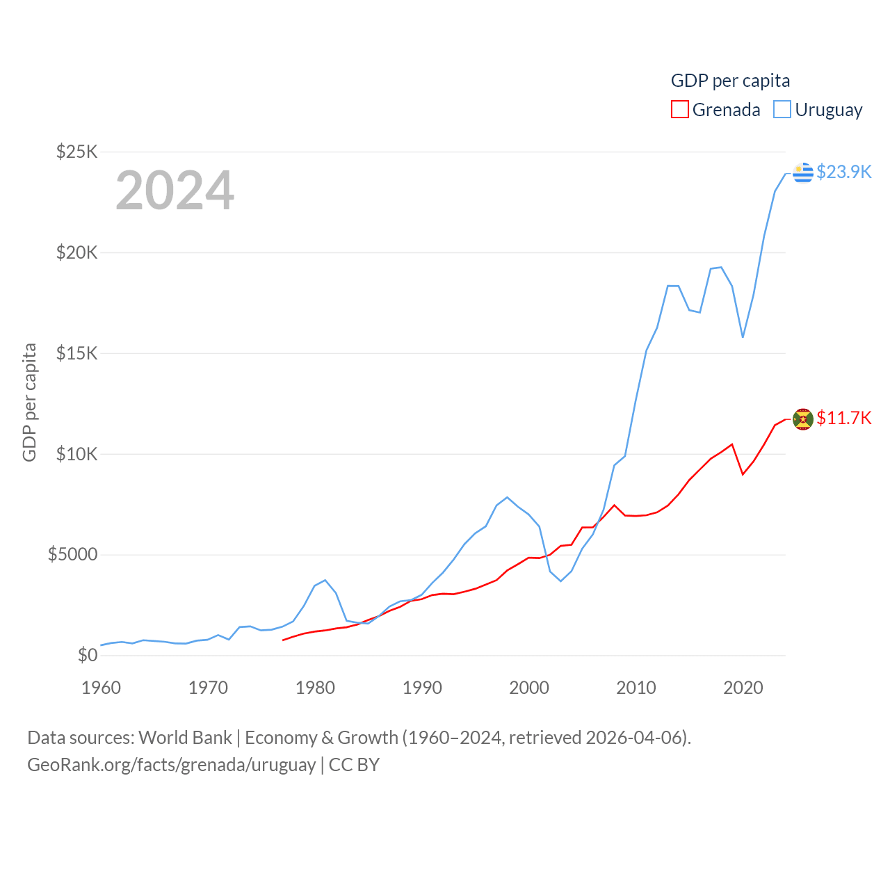 By GDP, Grenada ranks 184/197 ($1.37B) and Uruguay ranks 81/197 ($81B). By GDP per capita, Grenada ranks 80/197 ($11,705), while Uruguay ranks 52/197 ($23,907).