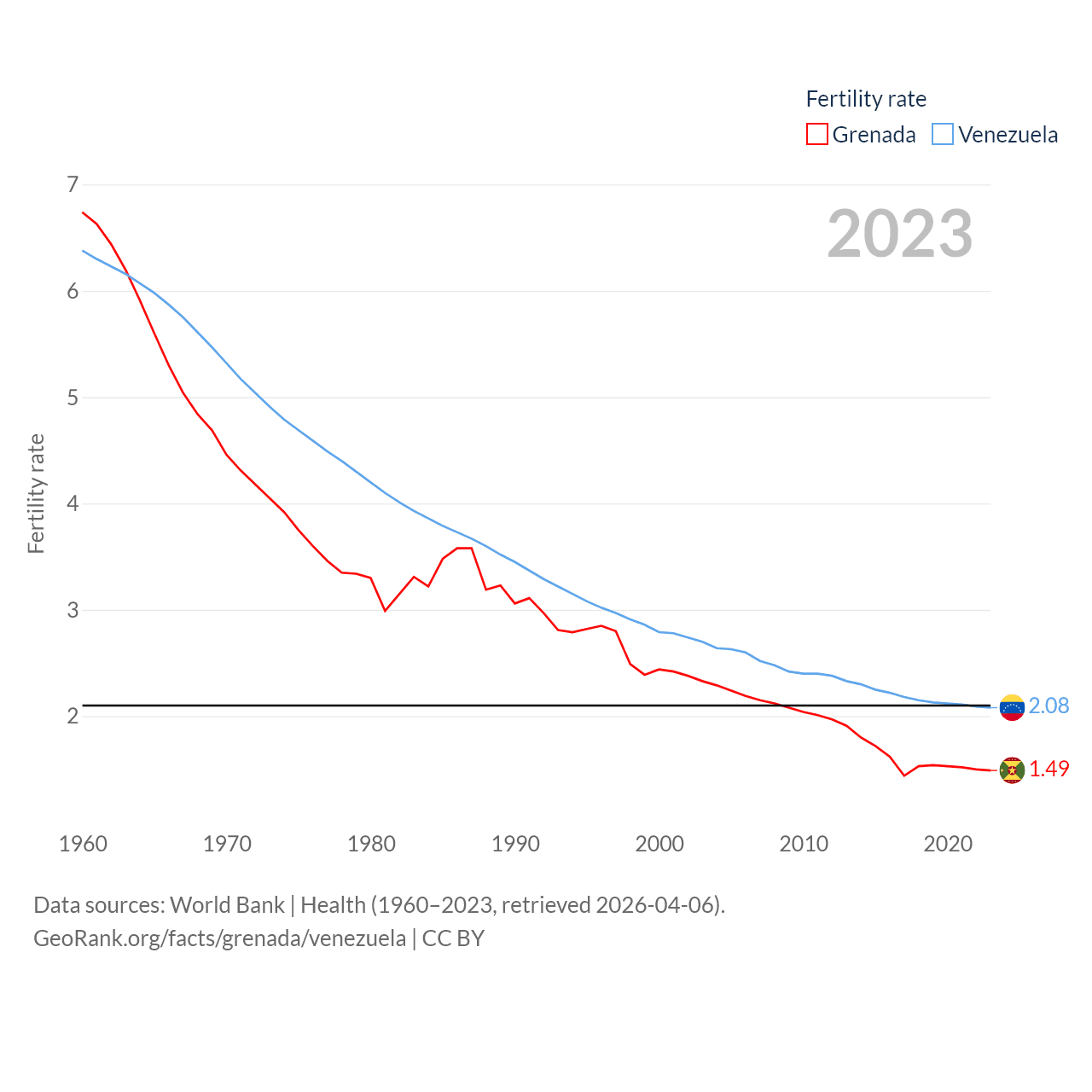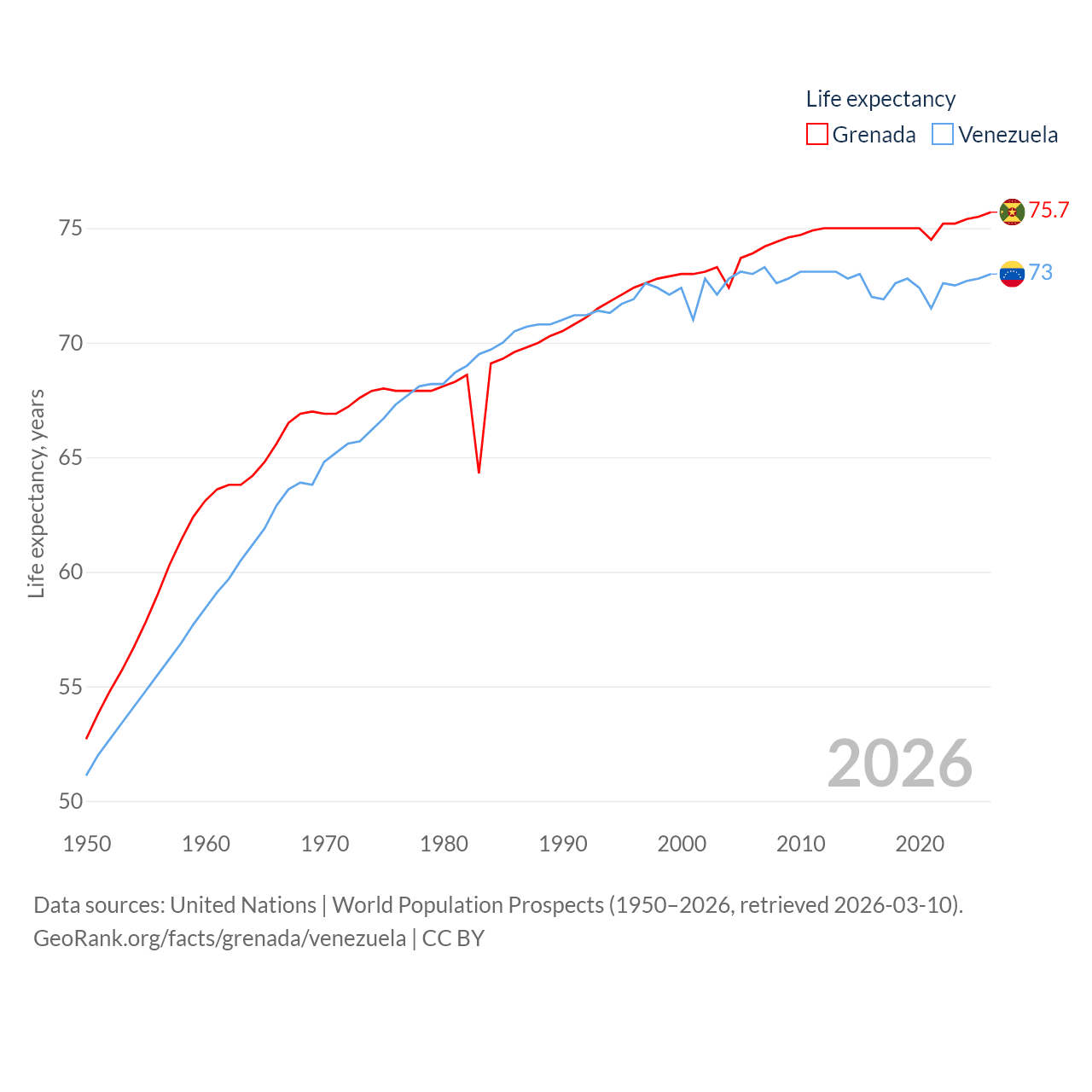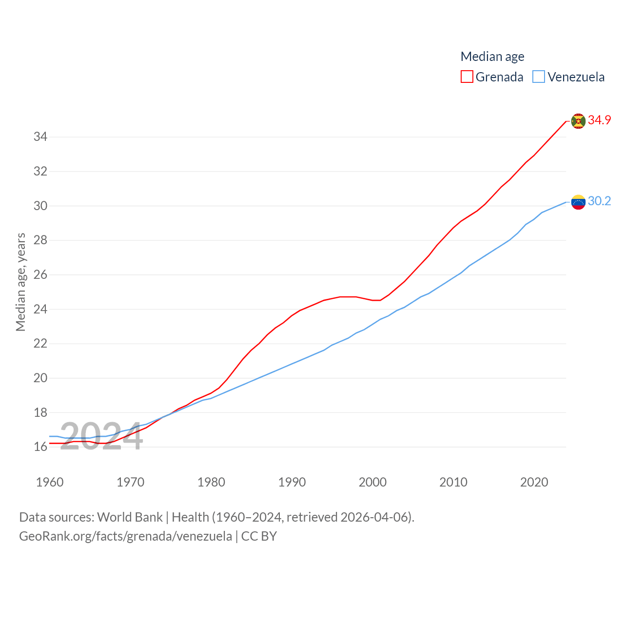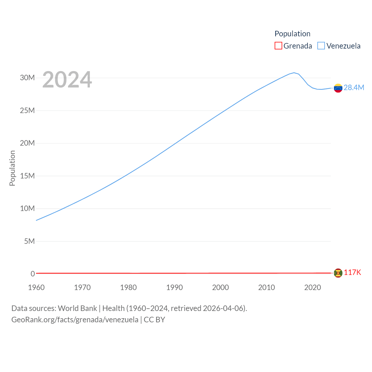Grenada has a population of 117K (ranked 182/197), compared with 28.4M in Venezuela (ranked 53/197). Grenada's land area is 131.3 sq mi versus 340,561 sq mi for Venezuela (ranked 186th vs. 32nd).