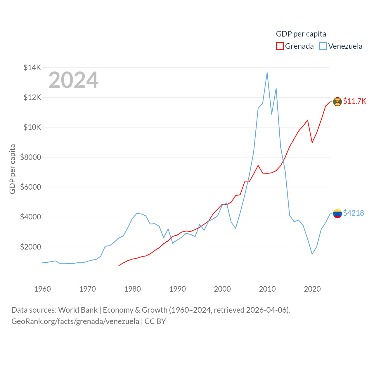 By GDP, Grenada ranks 184/197 ($1.37B) and Venezuela ranks 65/197 ($120B). By GDP per capita, Grenada ranks 80/197 ($11,705), while Venezuela ranks 128/197 ($4,218).