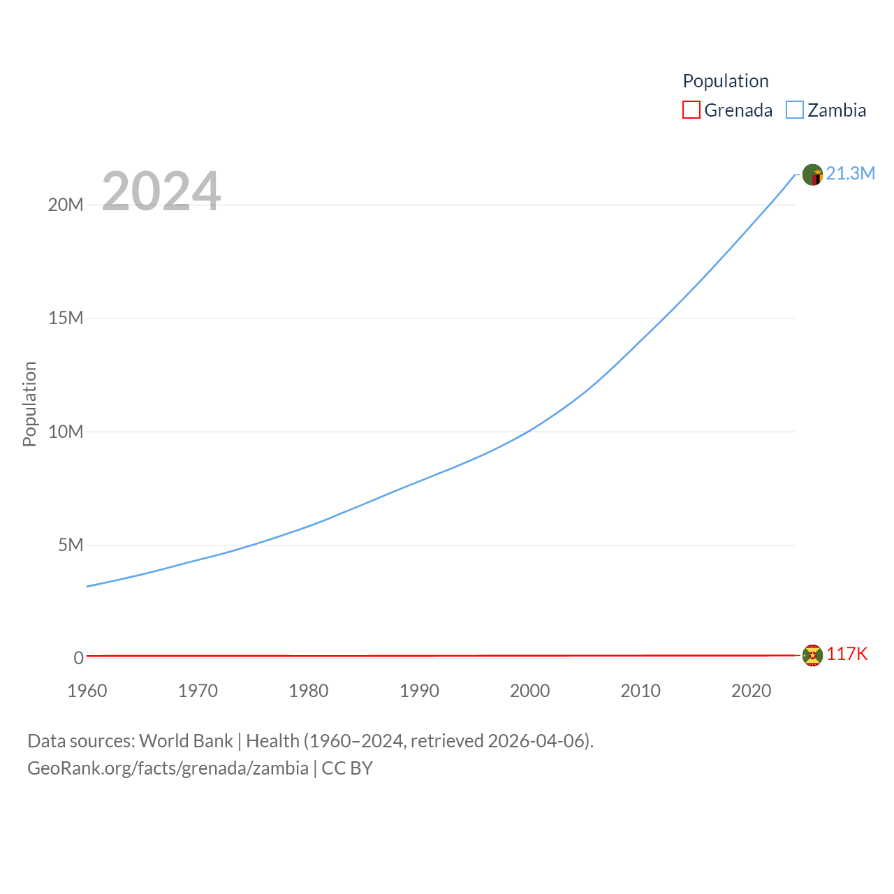 Grenada has a population of 117K (ranked 182/197), compared with 21.3M in Zambia (ranked 63/197). Grenada's land area is 131.3 sq mi versus 287,024 sq mi for Zambia (ranked 186th vs. 37th).