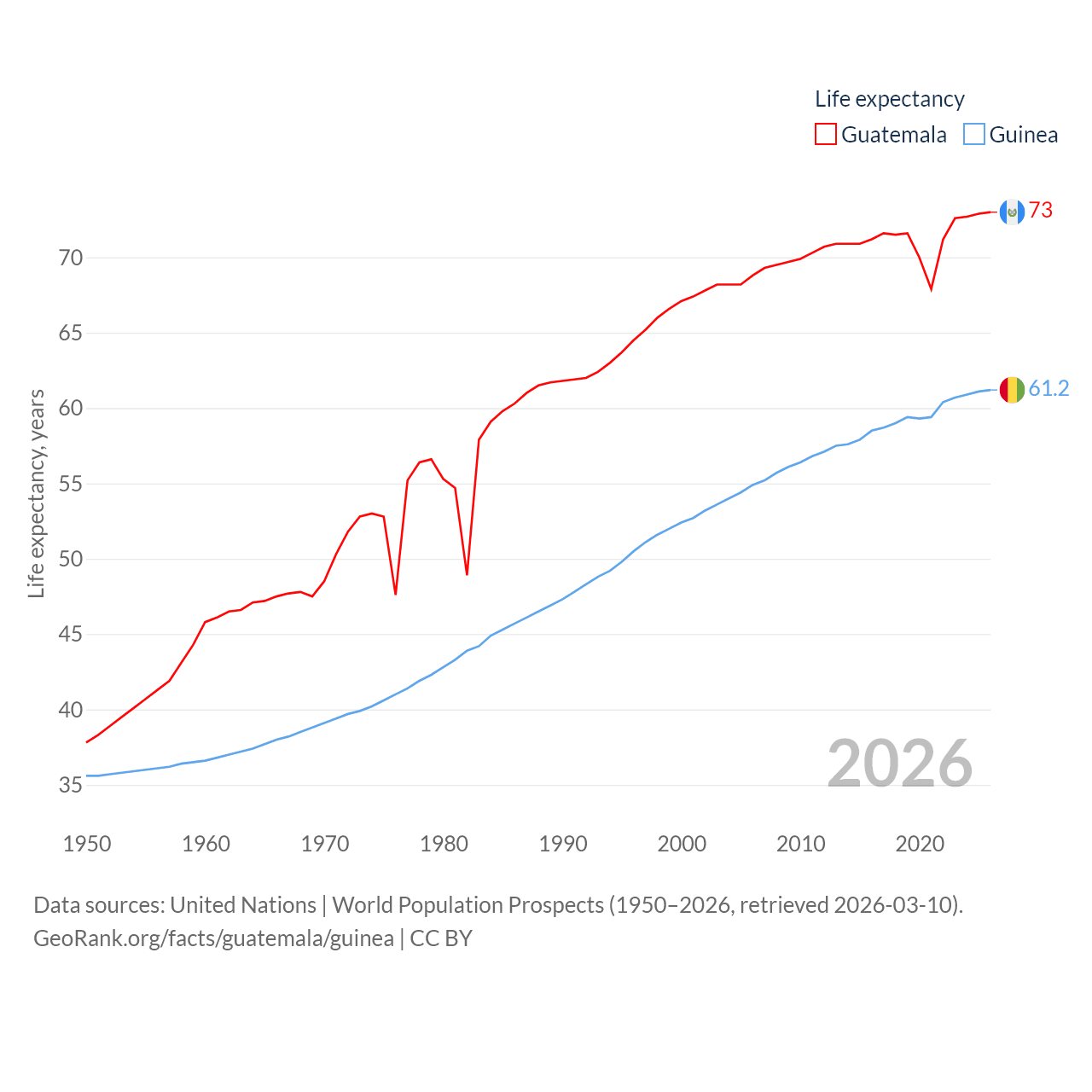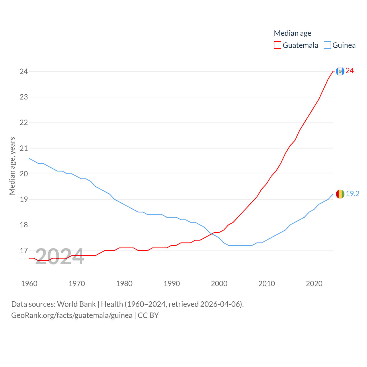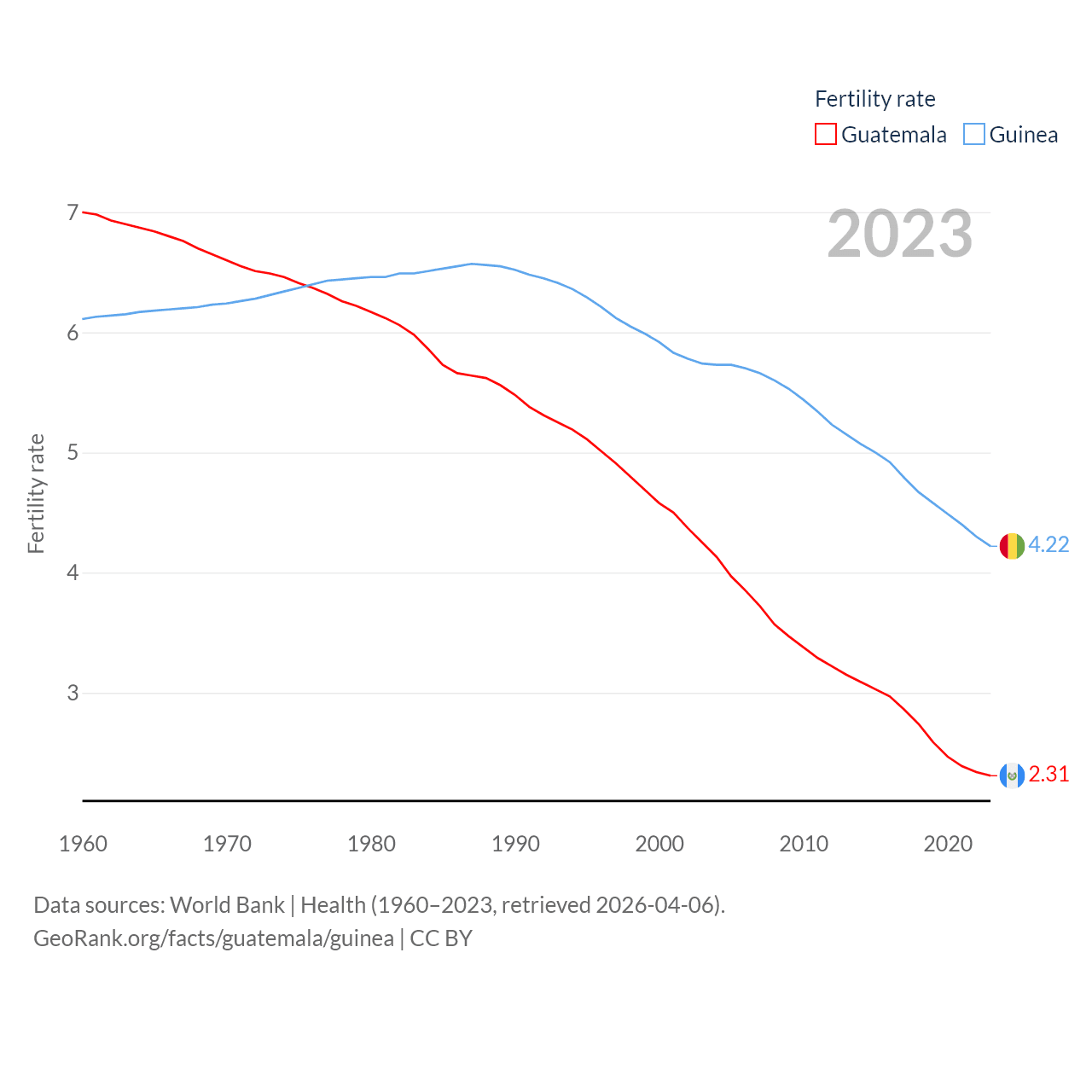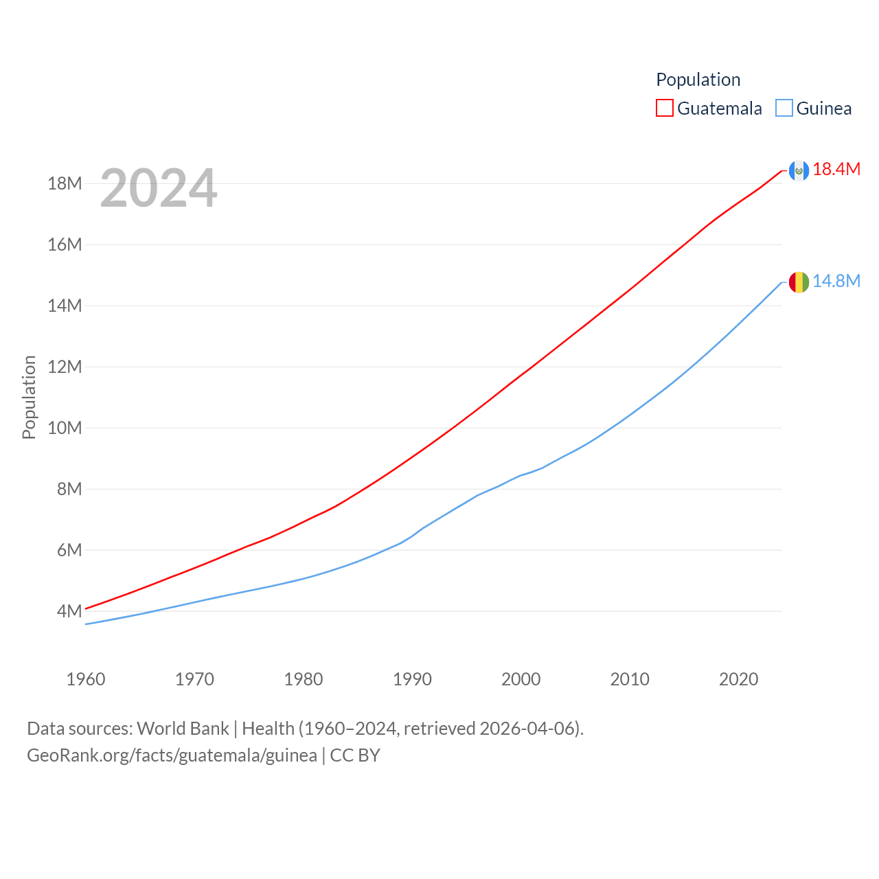 Guatemala has a population of 18.4M (ranked 70/197), compared with 14.8M in Guinea (ranked 75/197). Guatemala's land area is 41,375 sq mi versus 94,873 sq mi for Guinea (ranked 102nd vs. 77th).