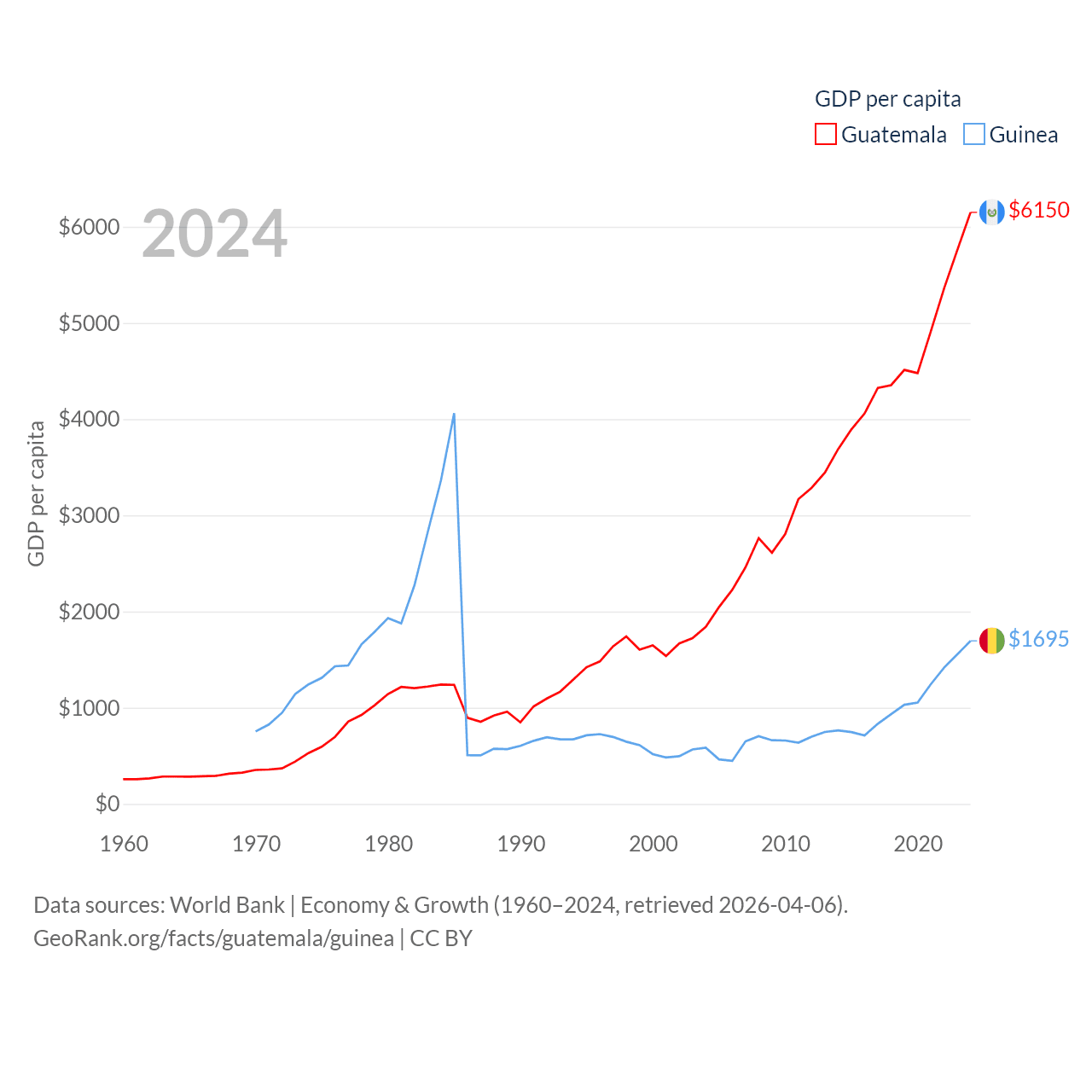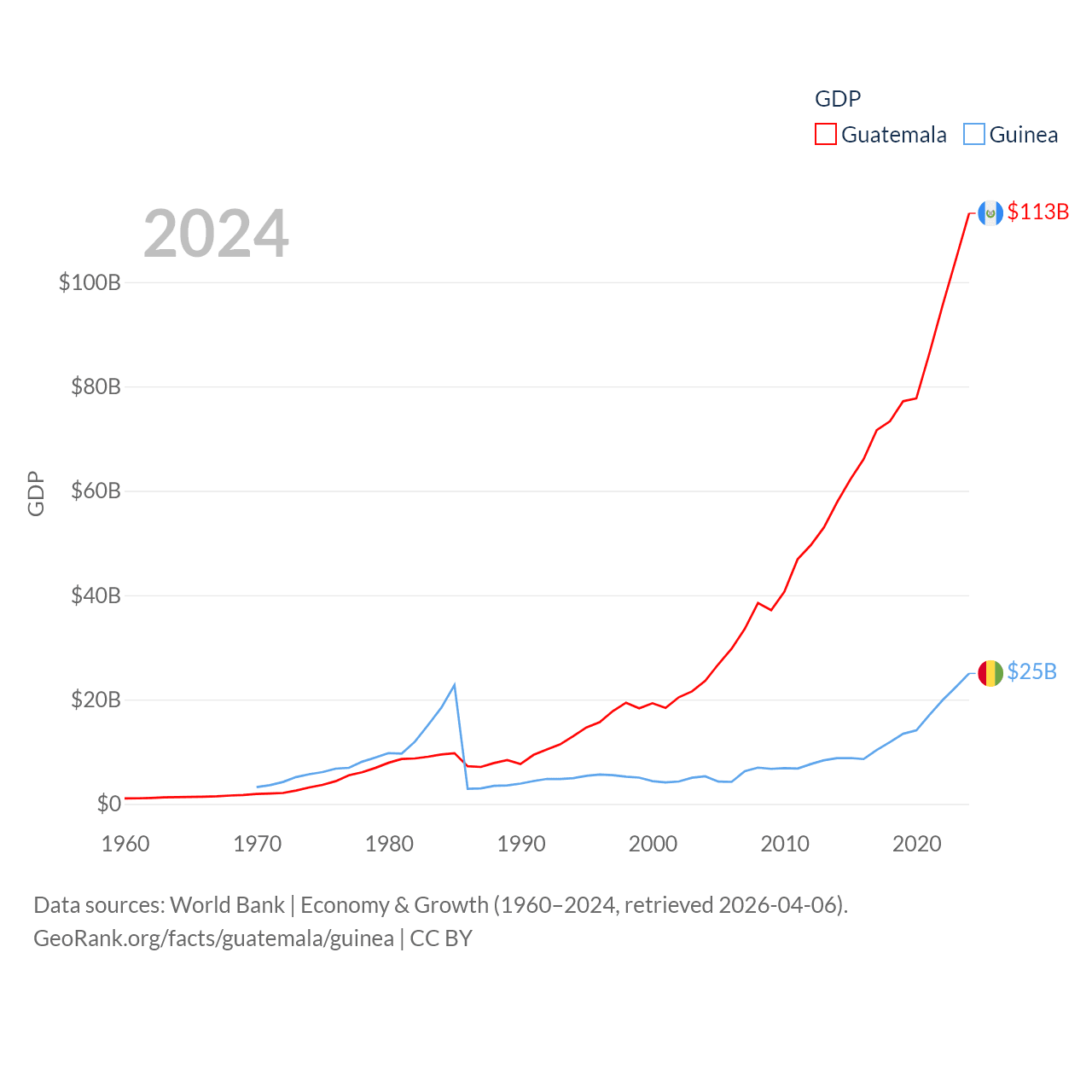 By GDP, Guatemala ranks 68/197 ($113B) and Guinea ranks 118/197 ($25B). By GDP per capita, Guatemala ranks 112/197 ($6,150), while Guinea ranks 160/197 ($1,695).