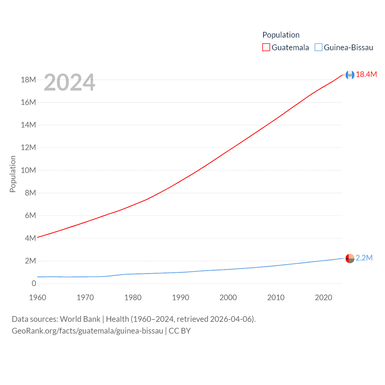 Guatemala has a population of 18.4M (ranked 70/197), compared with 2.2M in Guinea-Bissau (ranked 146/197). Guatemala's land area is 41,375 sq mi versus 10,857 sq mi for Guinea-Bissau (ranked 102nd vs. 139th).