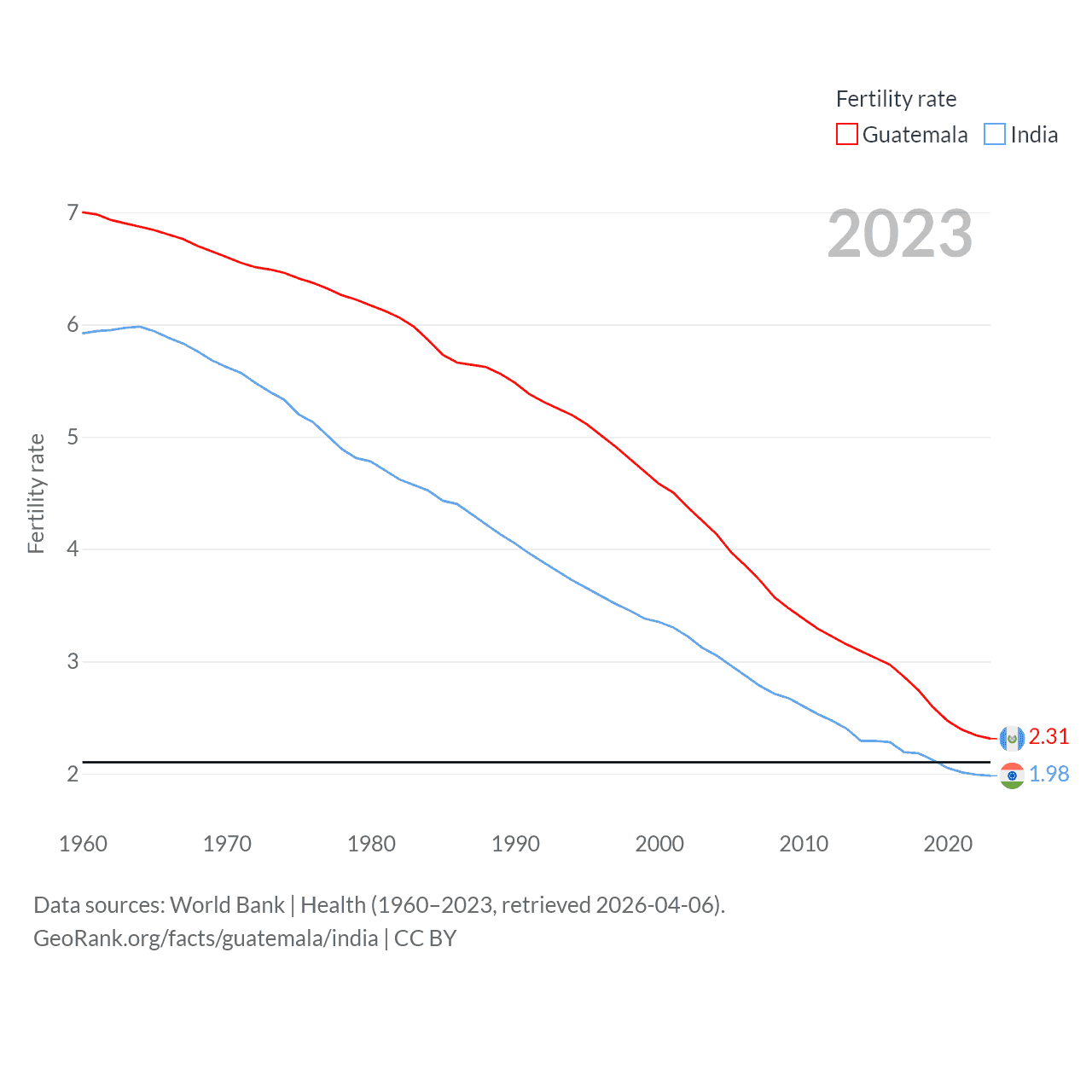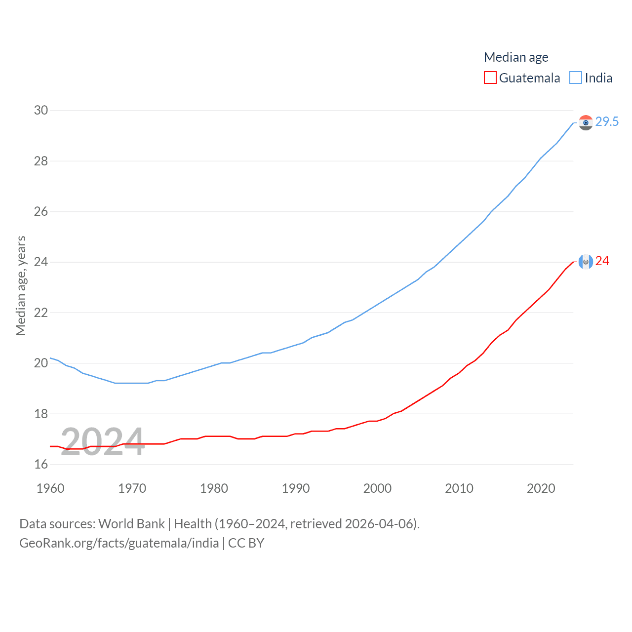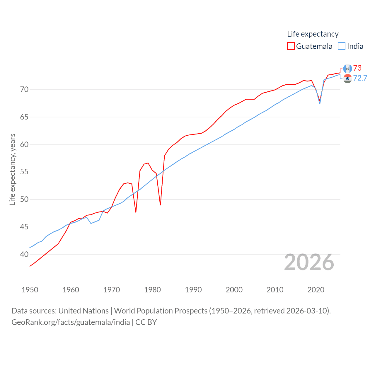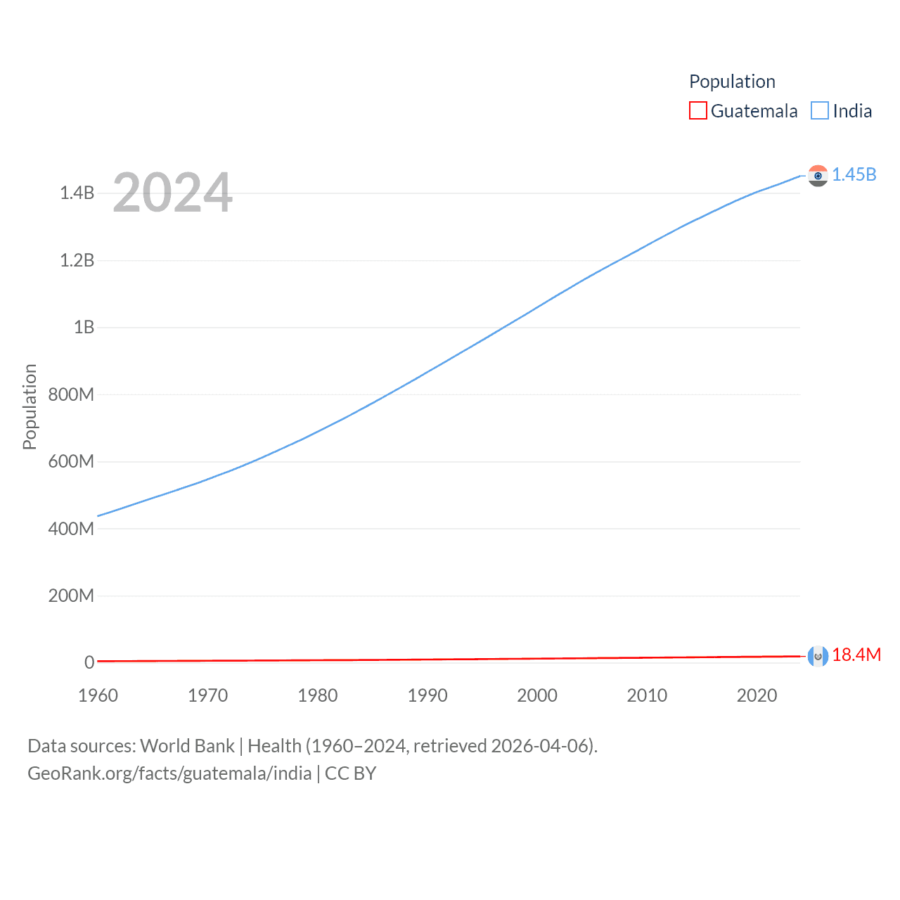 Guatemala has a population of 18.4M (ranked 70/197), compared with 1.45B in India (ranked 1/197). Guatemala's land area is 41,375 sq mi versus 1,147,955 sq mi for India (ranked 102nd vs. 7th).