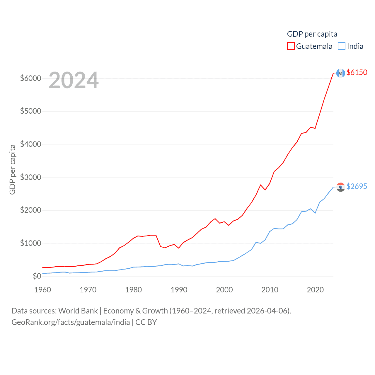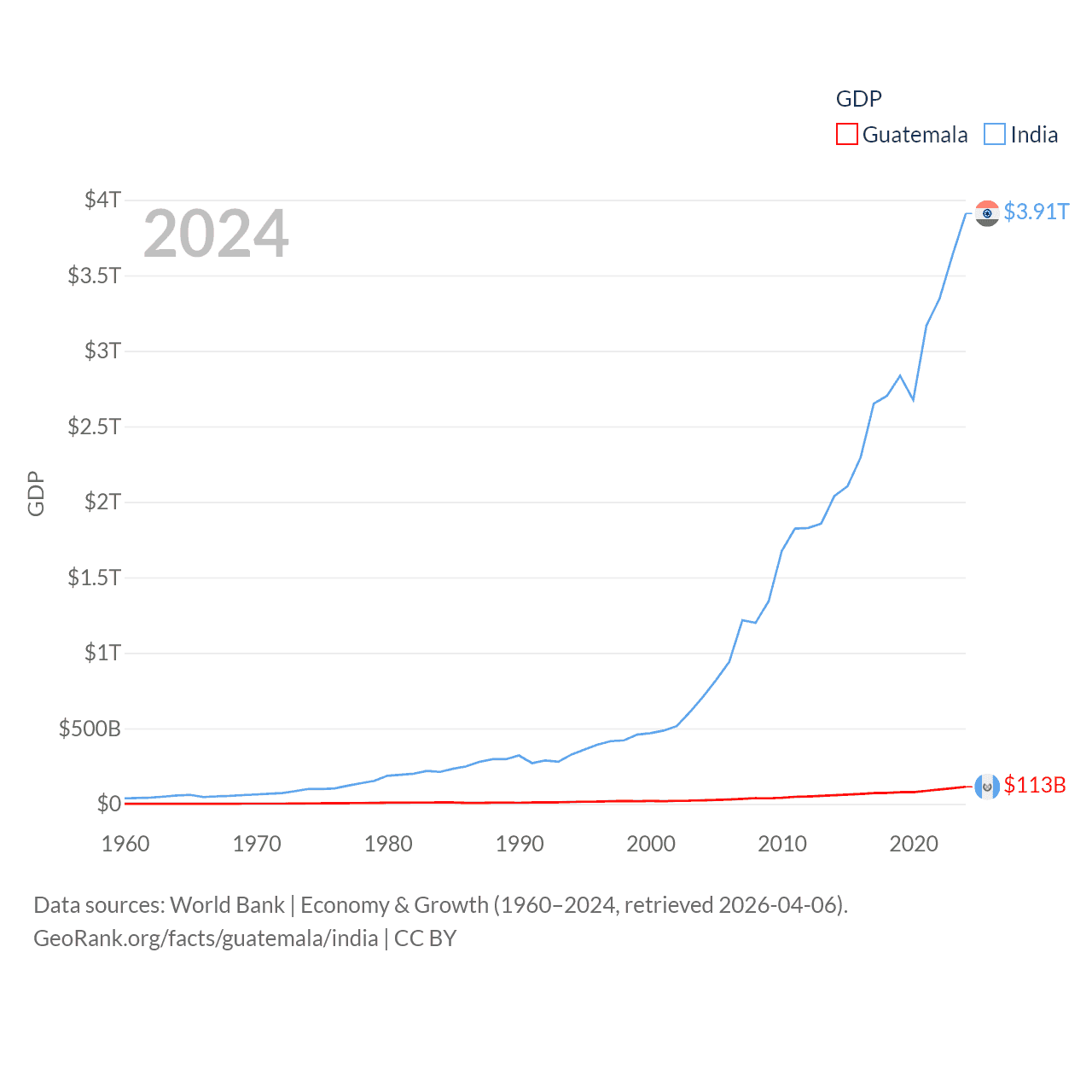 By GDP, Guatemala ranks 68/197 ($113B) and India ranks 5/197 ($3.91T). By GDP per capita, Guatemala ranks 112/197 ($6,150), while India ranks 143/197 ($2,695).