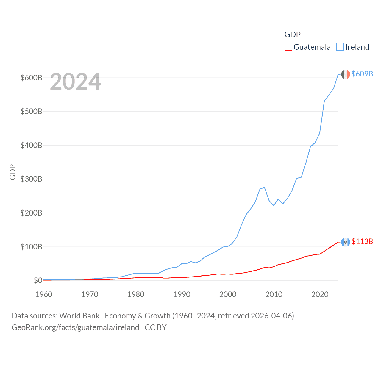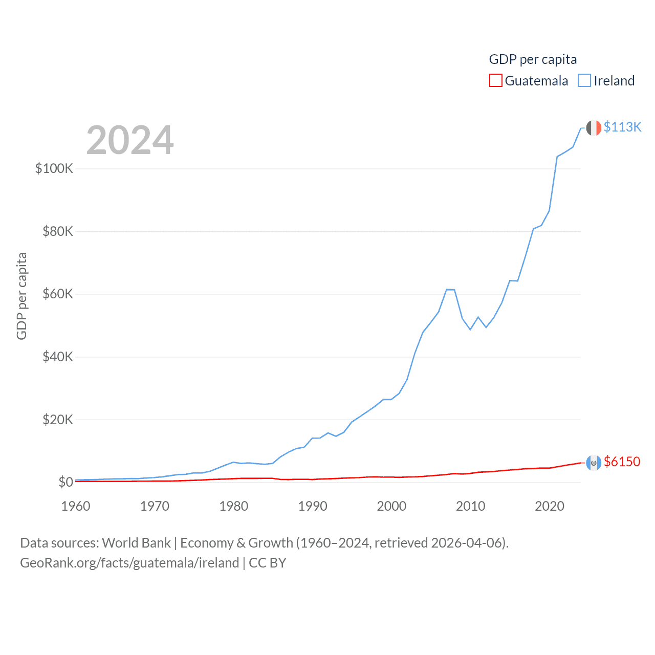 By GDP, Guatemala ranks 68/197 ($113B) and Ireland ranks 25/197 ($609B). By GDP per capita, Guatemala ranks 112/197 ($6,150), while Ireland ranks 4/197 ($112,895).