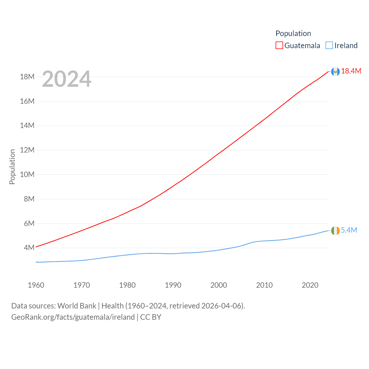 Guatemala has a population of 18.4M (ranked 70/197), compared with 5.4M in Ireland (ranked 120/197). Guatemala's land area is 41,375 sq mi versus 26,599 sq mi for Ireland (ranked 102nd vs. 119th).