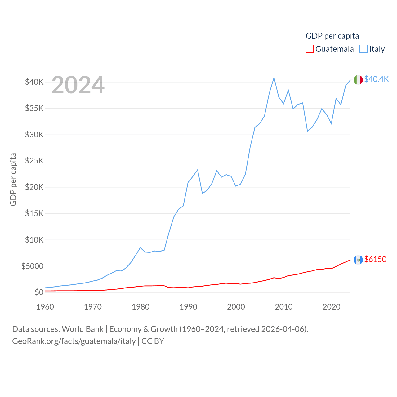 By GDP, Guatemala ranks 68/197 ($113B) and Italy ranks 8/197 ($2.38T). By GDP per capita, Guatemala ranks 112/197 ($6,150), while Italy ranks 29/197 ($40,385).