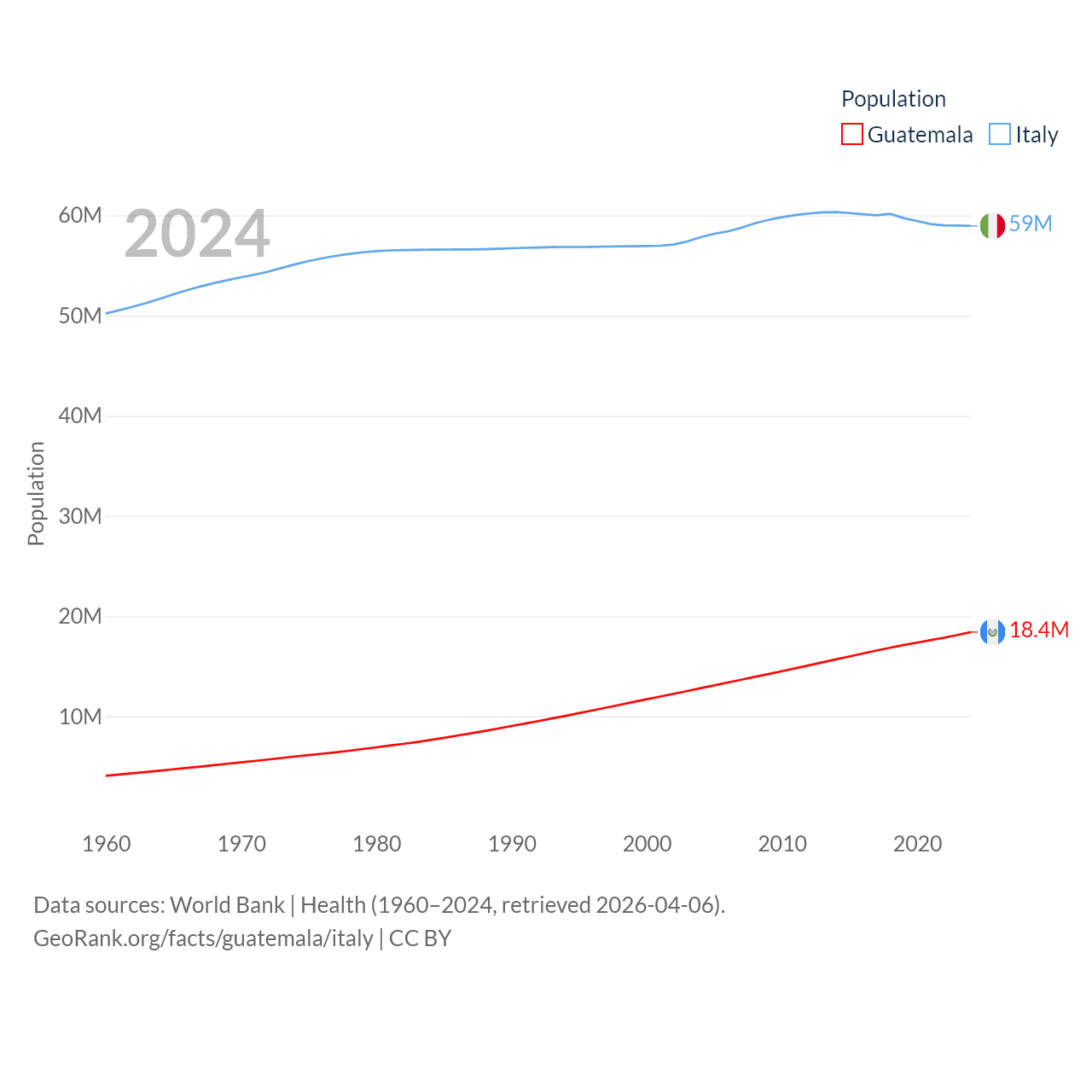Guatemala has a population of 18.4M (ranked 70/197), compared with 59M in Italy (ranked 25/197). Guatemala's land area is 41,375 sq mi versus 114,178 sq mi for Italy (ranked 102nd vs. 72nd).