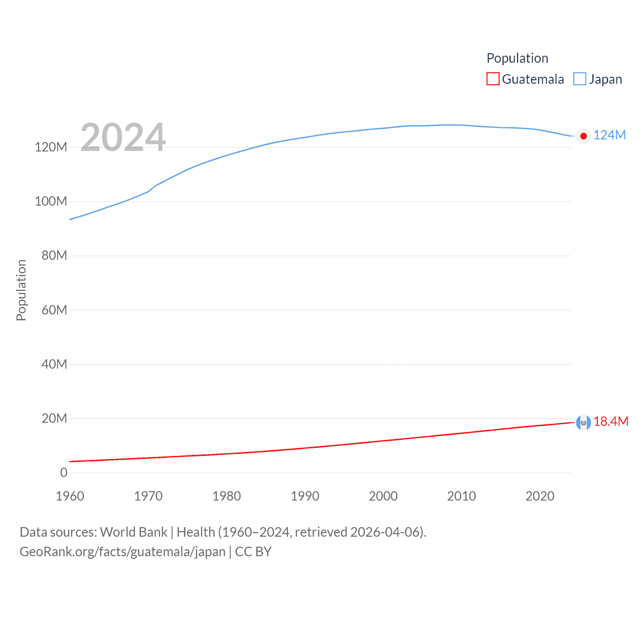 Guatemala has a population of 18.4M (ranked 70/197), compared with 124M in Japan (ranked 12/197). Guatemala's land area is 41,375 sq mi versus 140,761 sq mi for Japan (ranked 102nd vs. 61st).