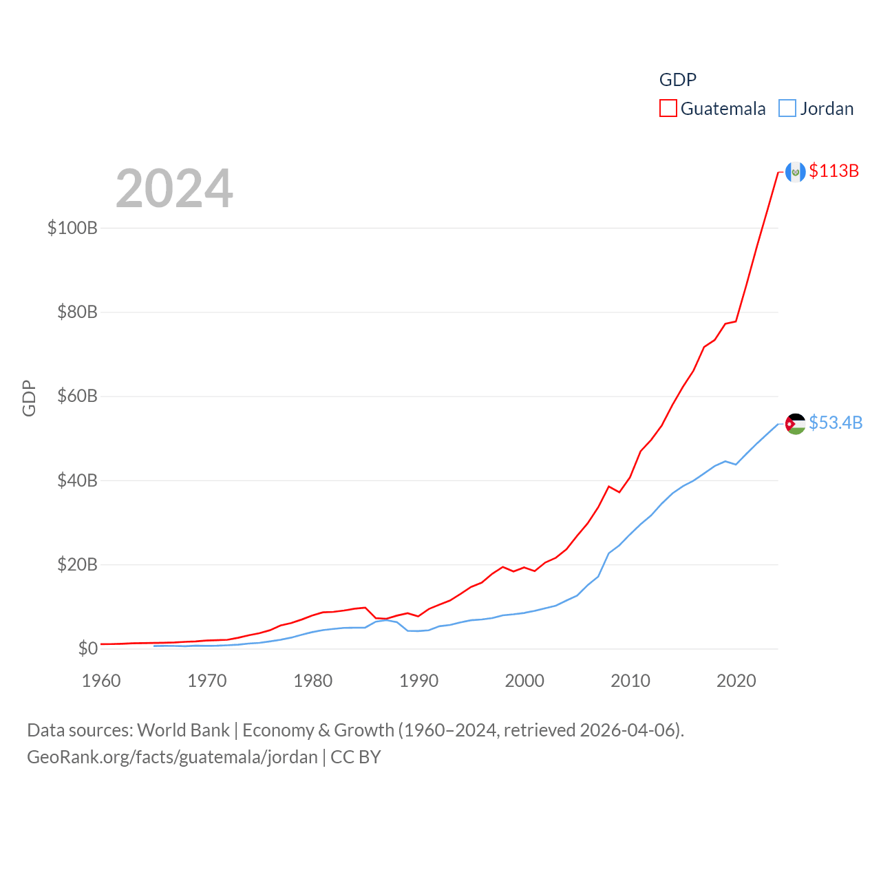 By GDP, Guatemala ranks 68/197 ($113B) and Jordan ranks 90/197 ($53.4B). By GDP per capita, Guatemala ranks 112/197 ($6,150), while Jordan ranks 123/197 ($4,618).