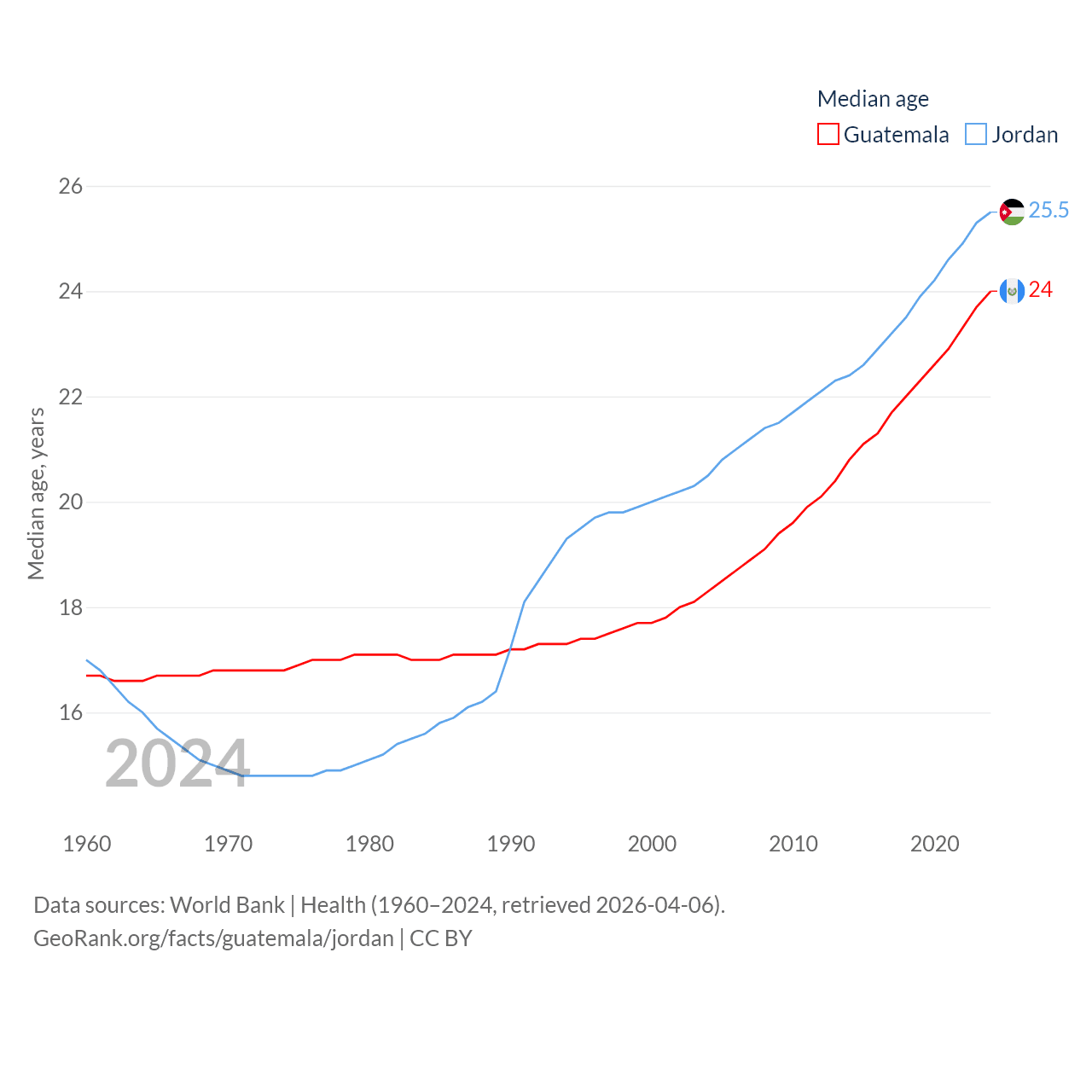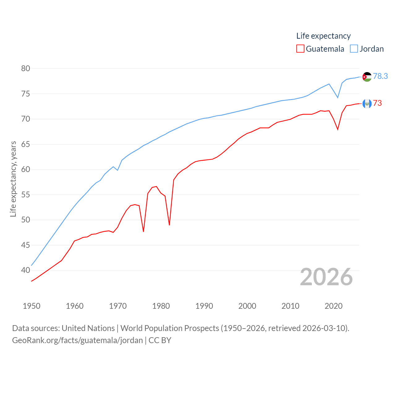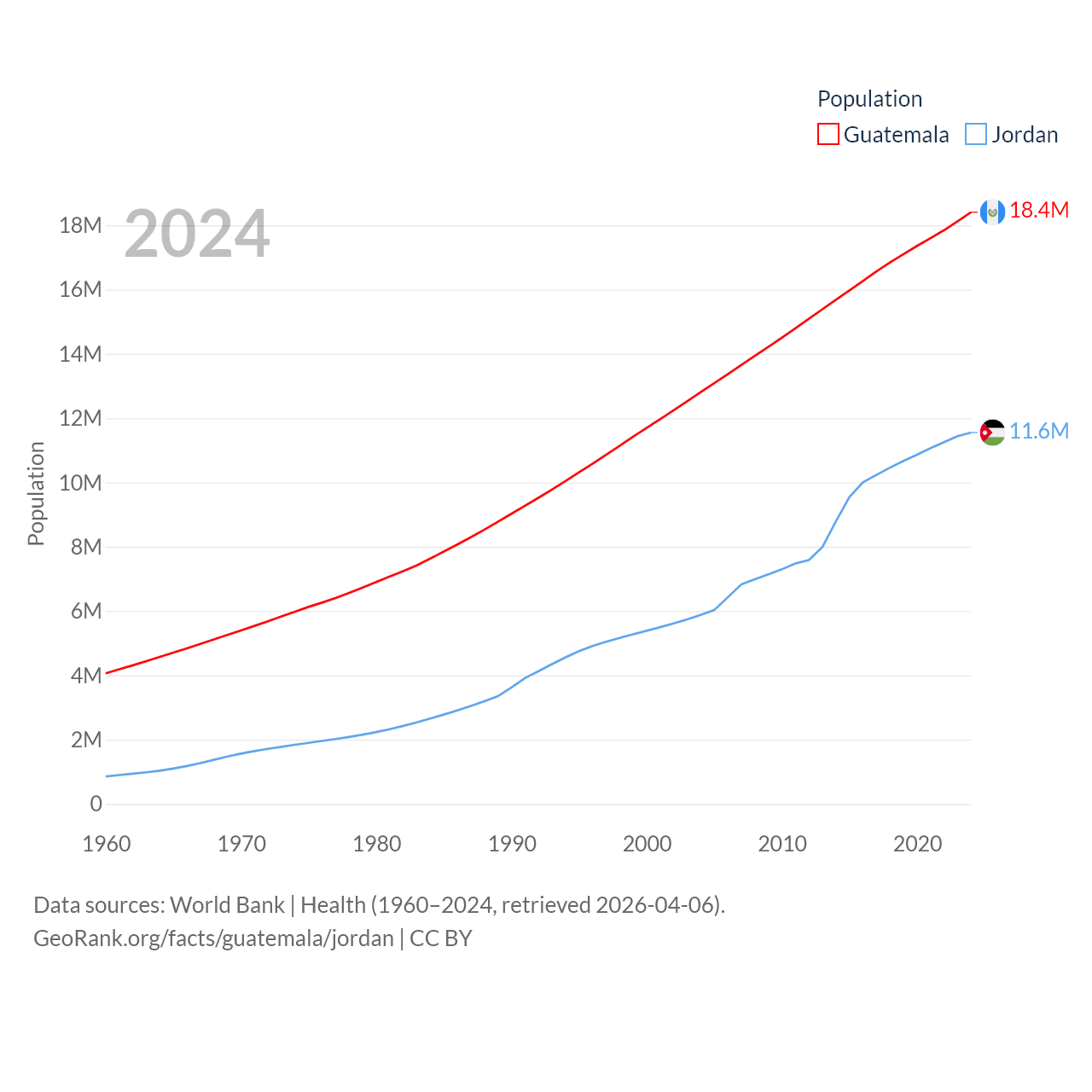 Guatemala has a population of 18.4M (ranked 70/197), compared with 11.6M in Jordan (ranked 84/197). Guatemala's land area is 41,375 sq mi versus 34,284 sq mi for Jordan (ranked 102nd vs. 110th).