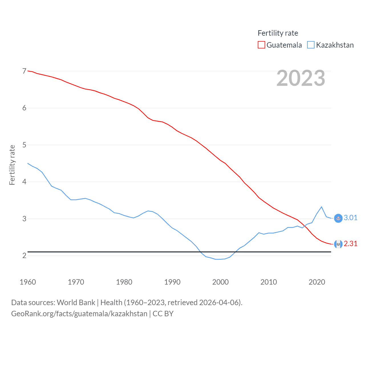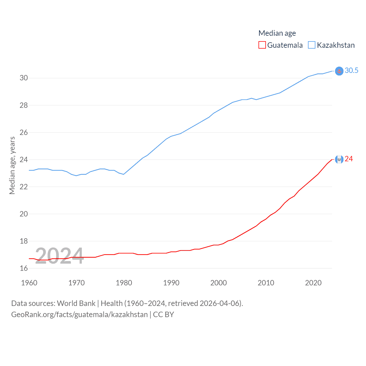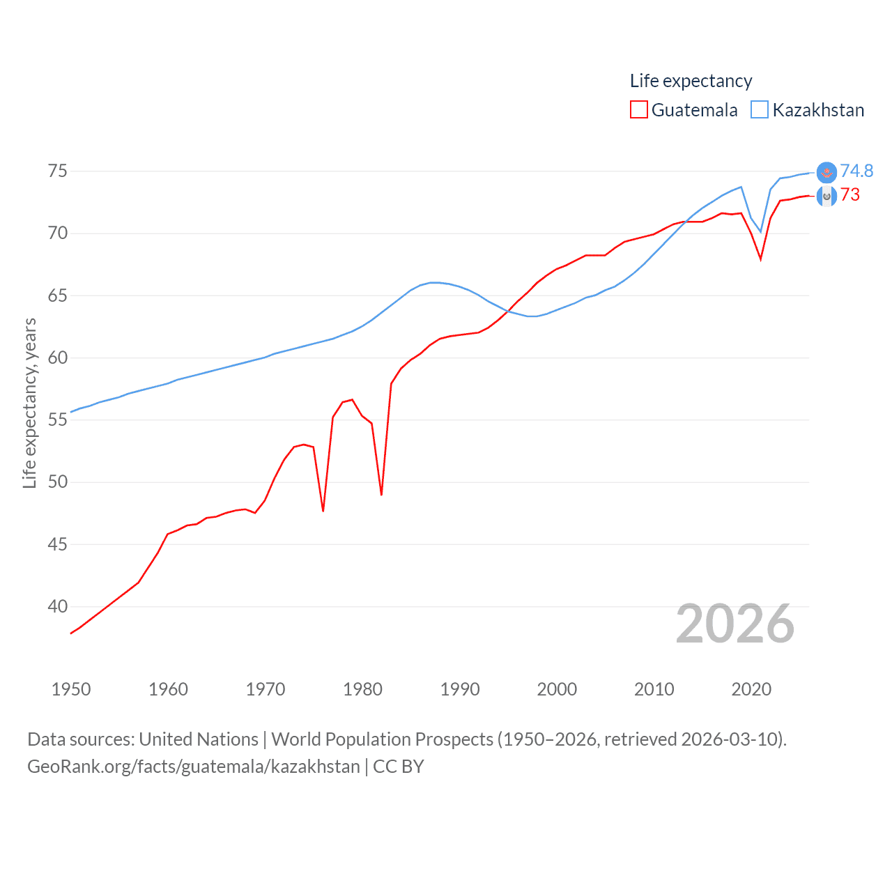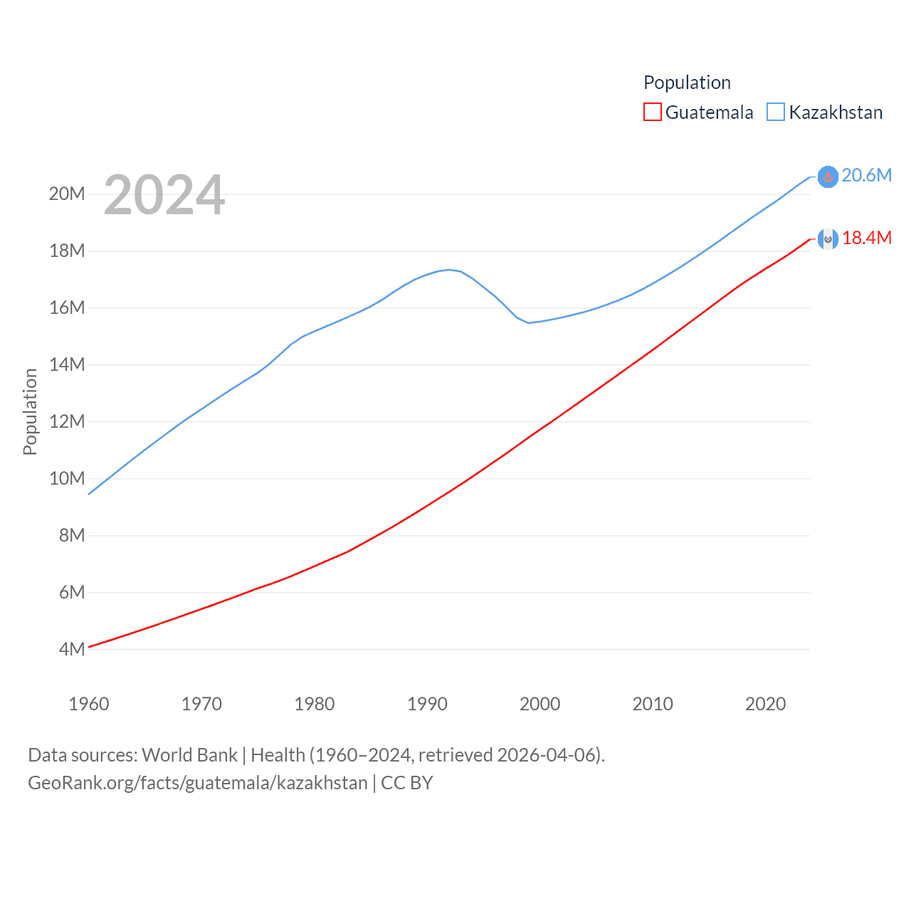 Guatemala has a population of 18.4M (ranked 70/197), compared with 20.6M in Kazakhstan (ranked 64/197). Guatemala's land area is 41,375 sq mi versus 1,042,360 sq mi for Kazakhstan (ranked 102nd vs. 9th).
