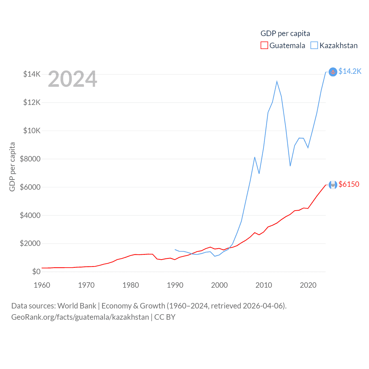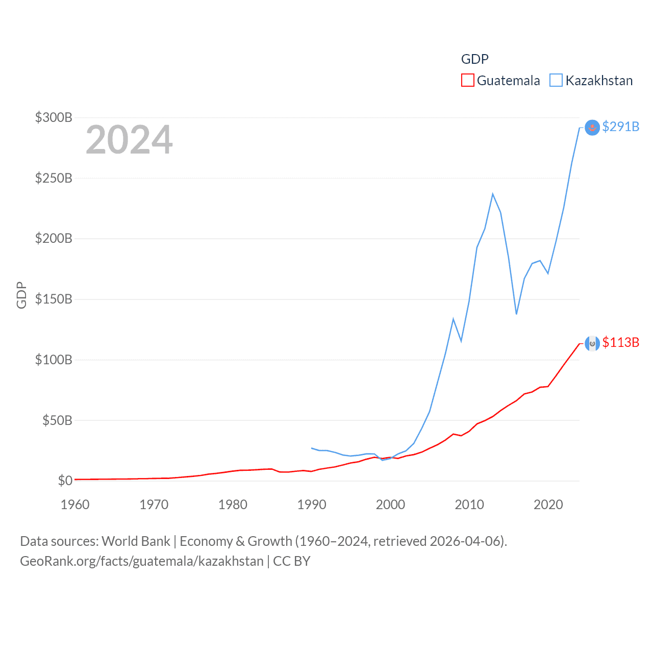 By GDP, Guatemala ranks 68/197 ($113B) and Kazakhstan ranks 48/197 ($291B). By GDP per capita, Guatemala ranks 112/197 ($6,150), while Kazakhstan ranks 71/197 ($14,155).