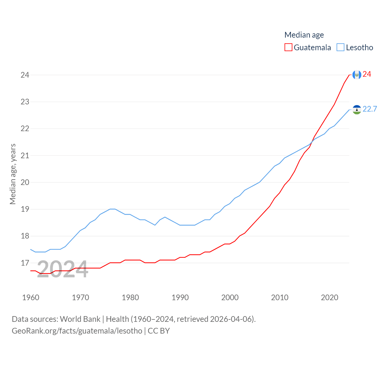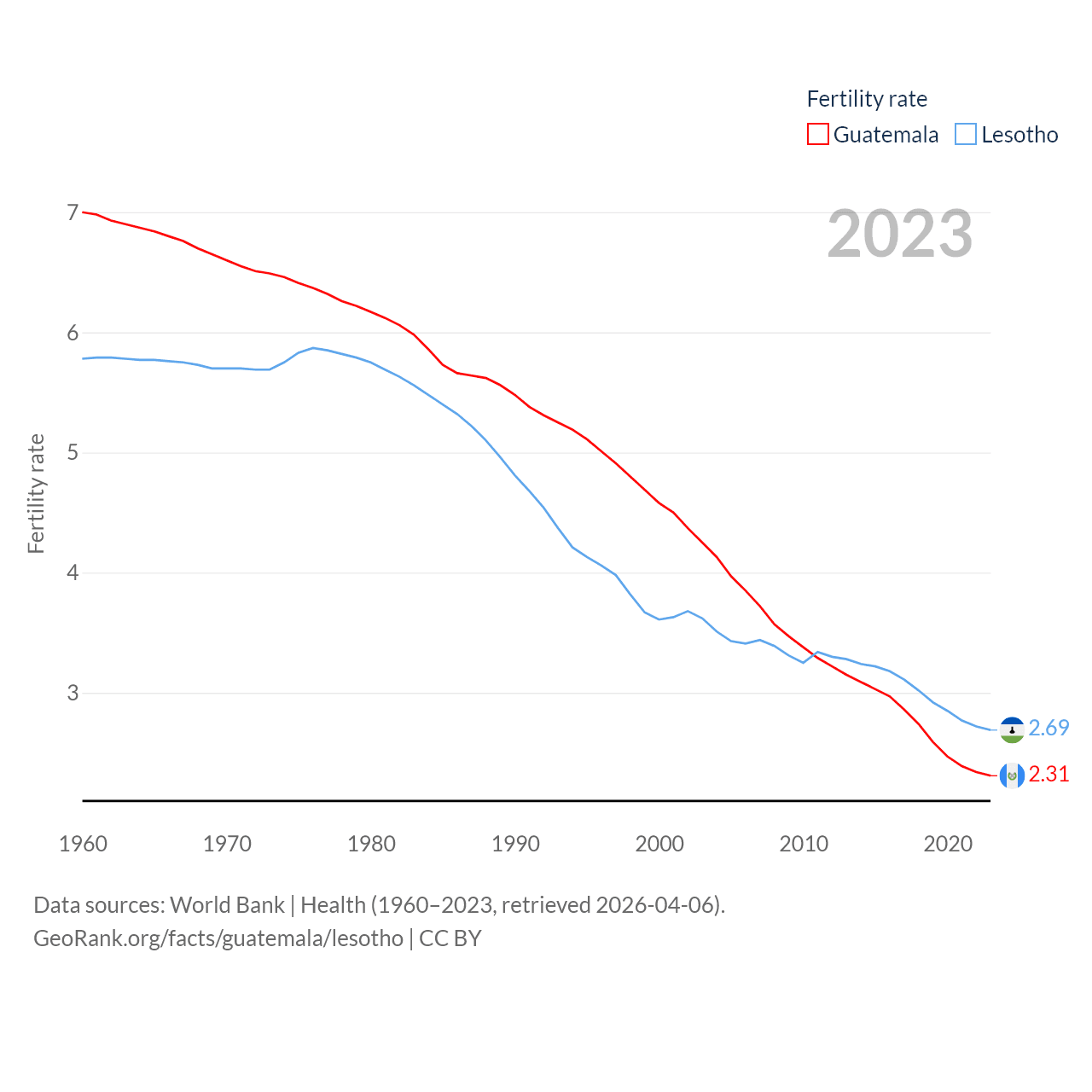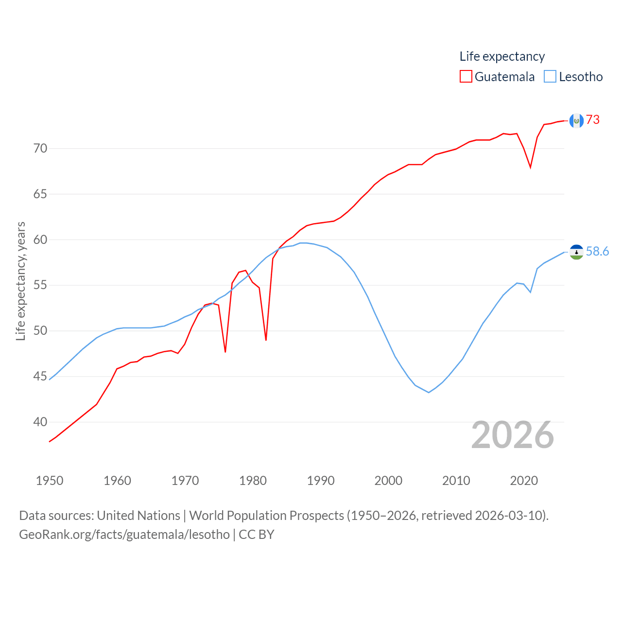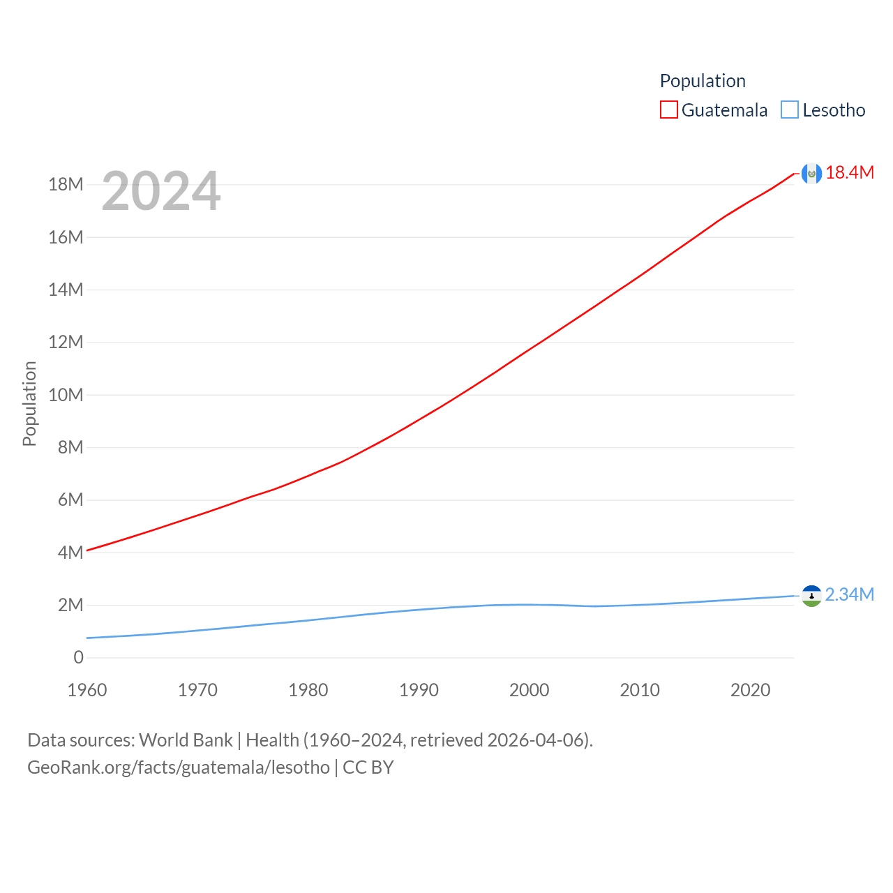 Guatemala has a population of 18.4M (ranked 70/197), compared with 2.34M in Lesotho (ranked 145/197). Guatemala's land area is 41,375 sq mi versus 11,722 sq mi for Lesotho (ranked 102nd vs. 137th).