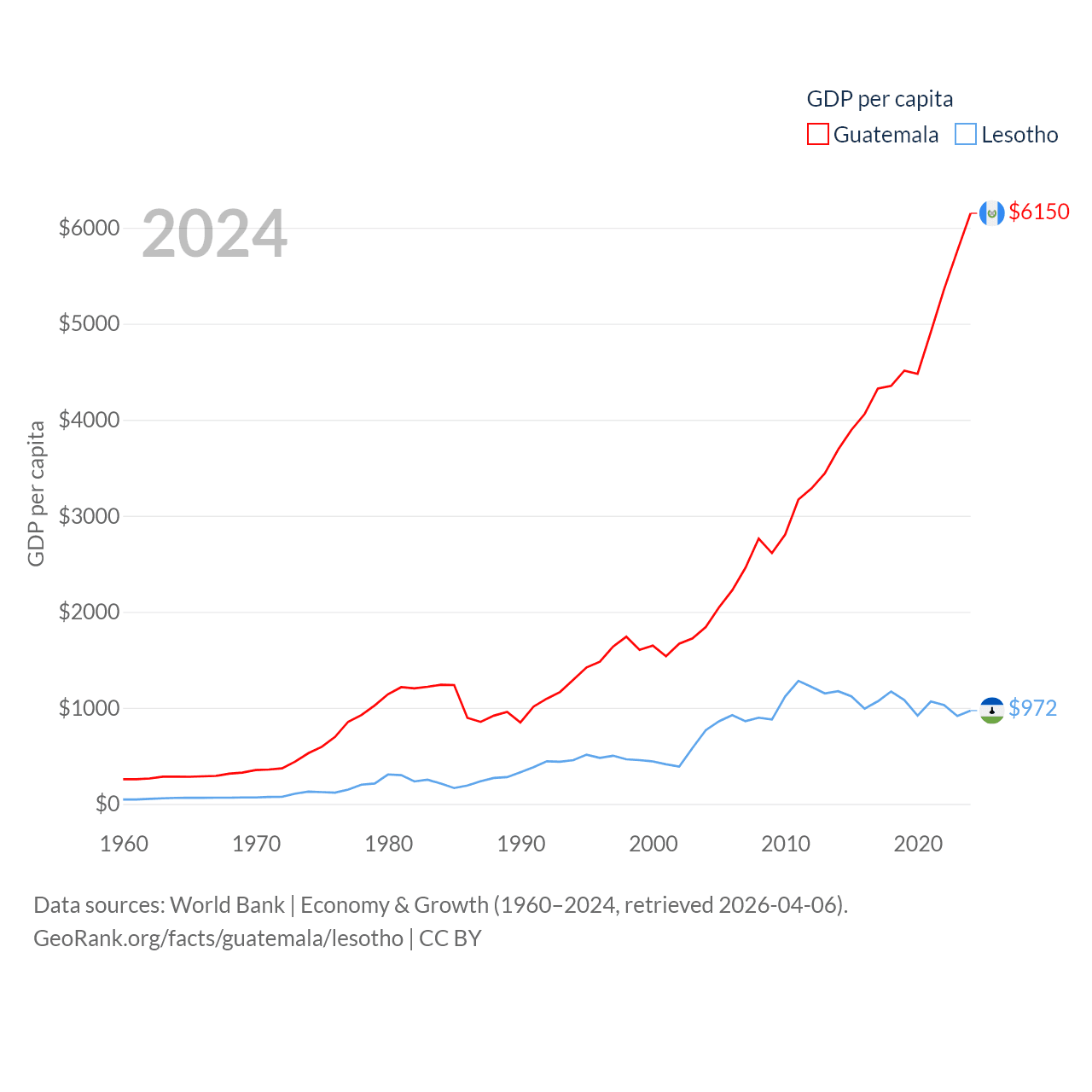By GDP, Guatemala ranks 68/197 ($113B) and Lesotho ranks 175/197 ($2.27B). By GDP per capita, Guatemala ranks 112/197 ($6,150), while Lesotho ranks 181/197 ($972).