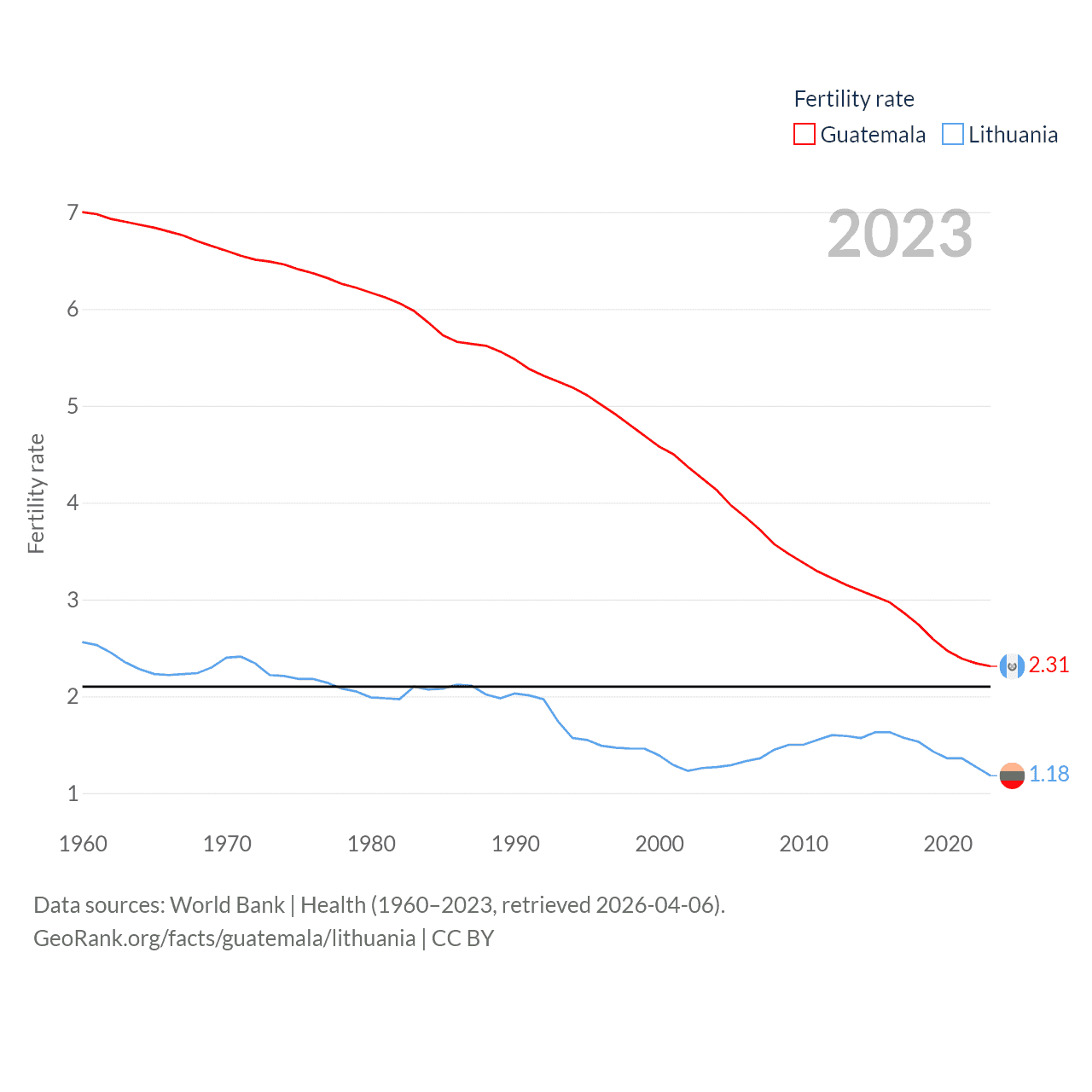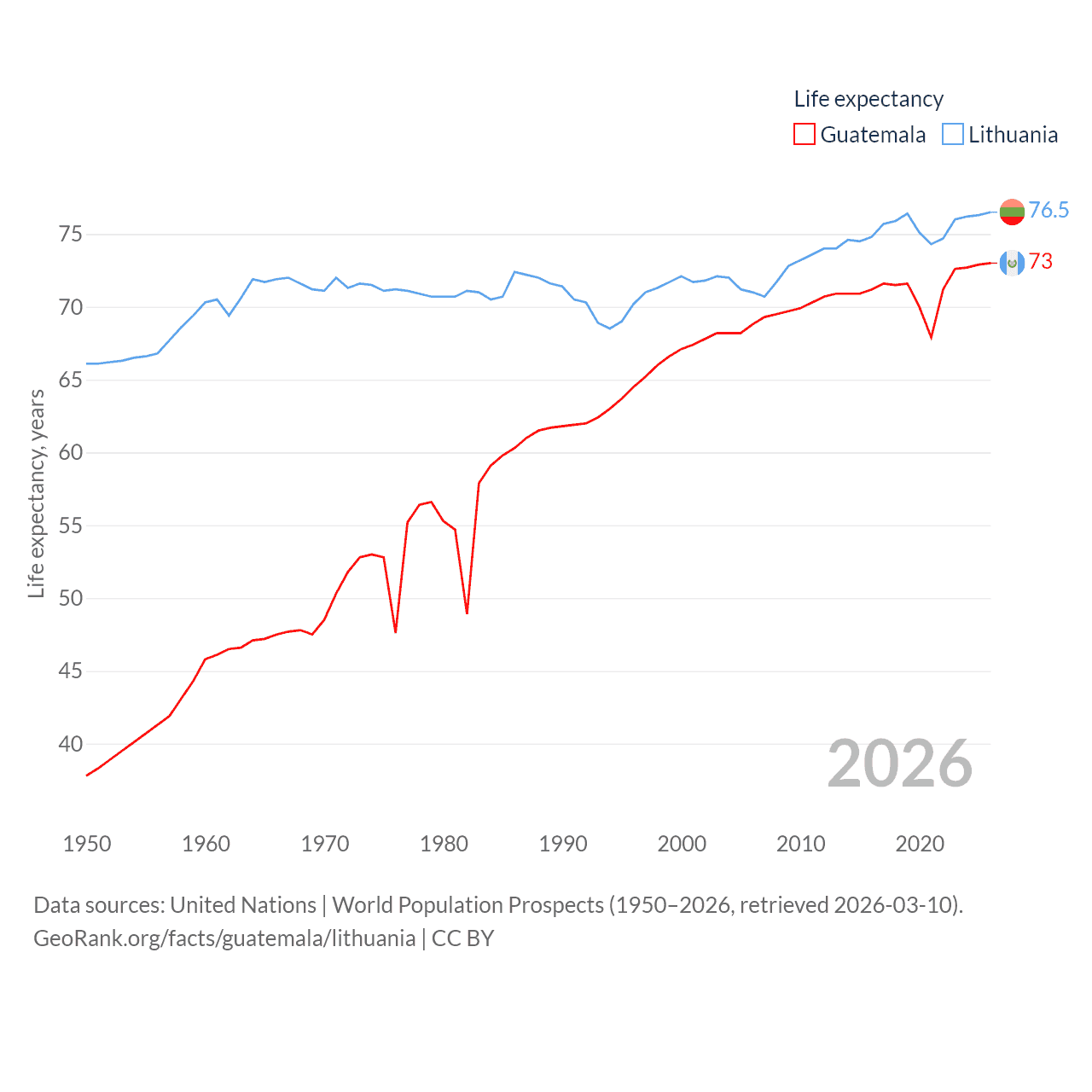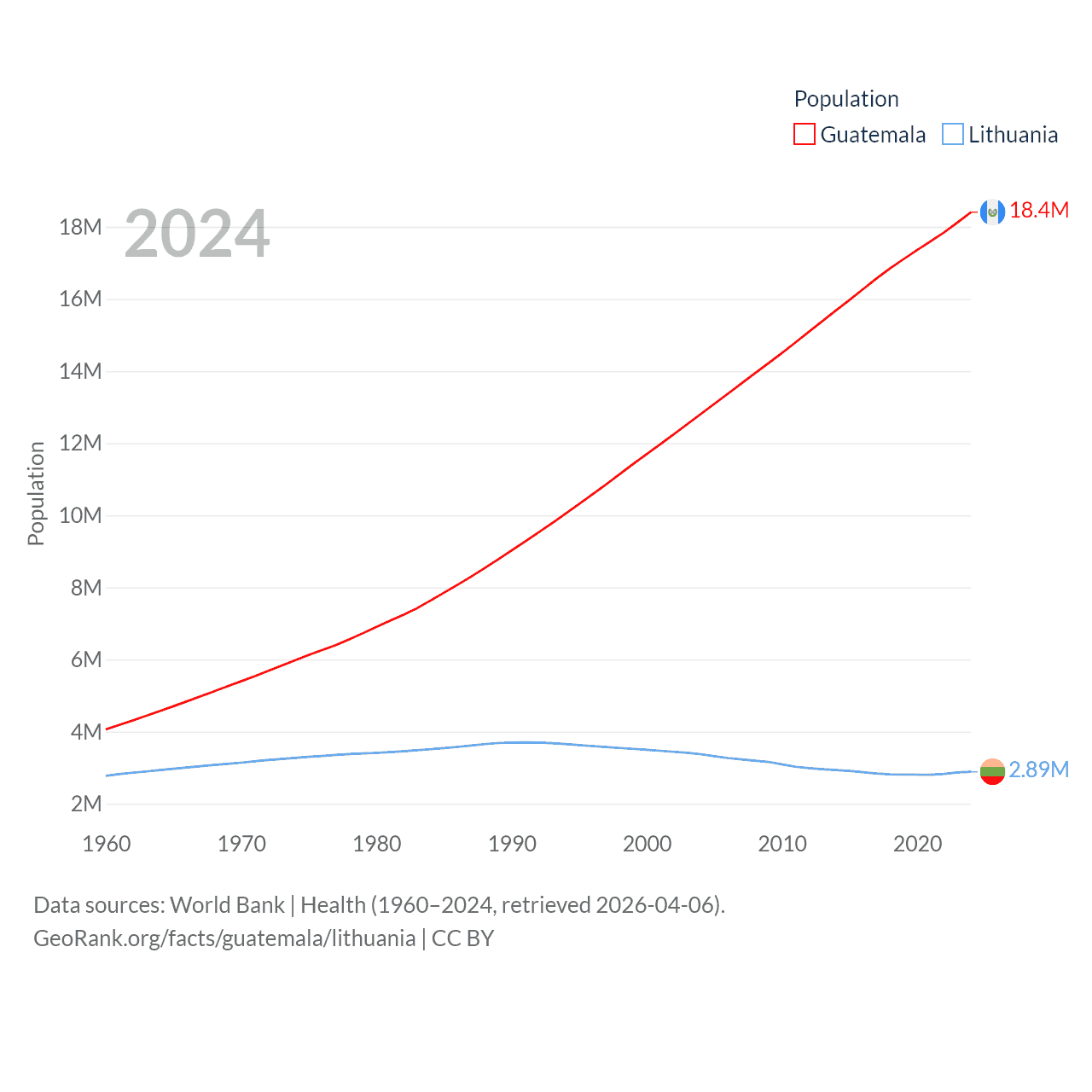 Guatemala has a population of 18.4M (ranked 70/197), compared with 2.89M in Lithuania (ranked 137/197). Guatemala's land area is 41,375 sq mi versus 24,170 sq mi for Lithuania (ranked 102nd vs. 120th).