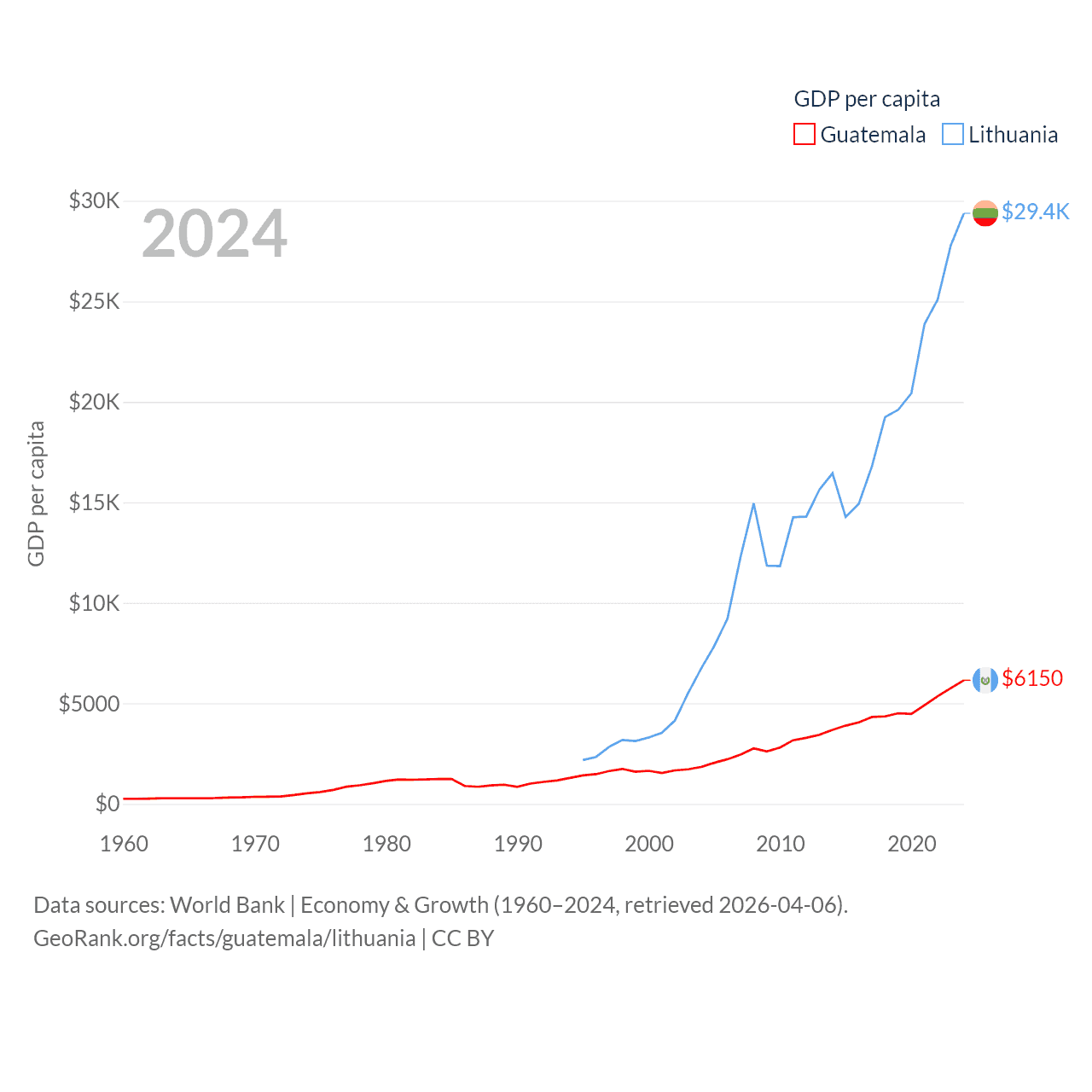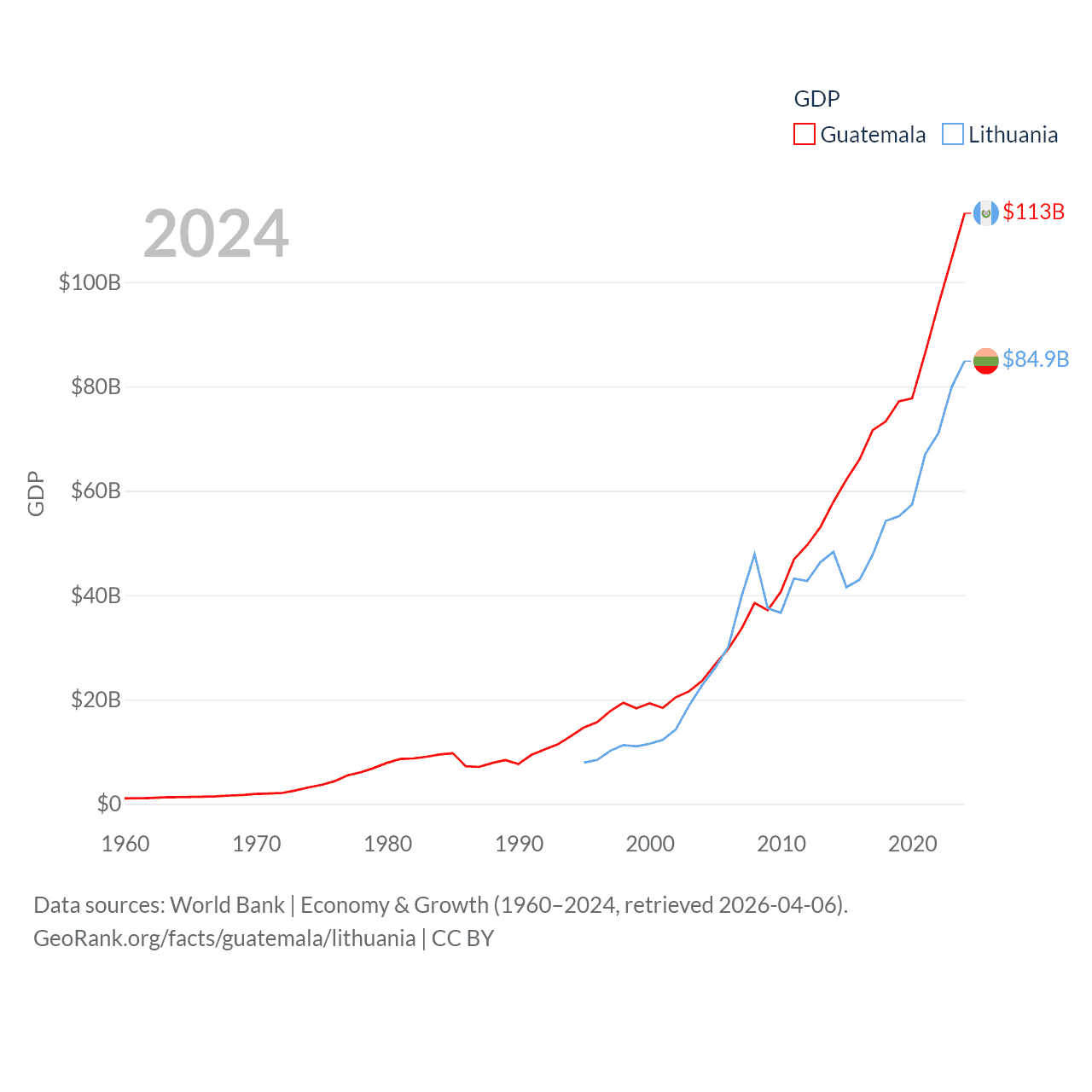 By GDP, Guatemala ranks 68/197 ($113B) and Lithuania ranks 79/197 ($84.9B). By GDP per capita, Guatemala ranks 112/197 ($6,150), while Lithuania ranks 43/197 ($29,384).