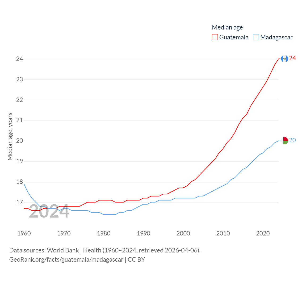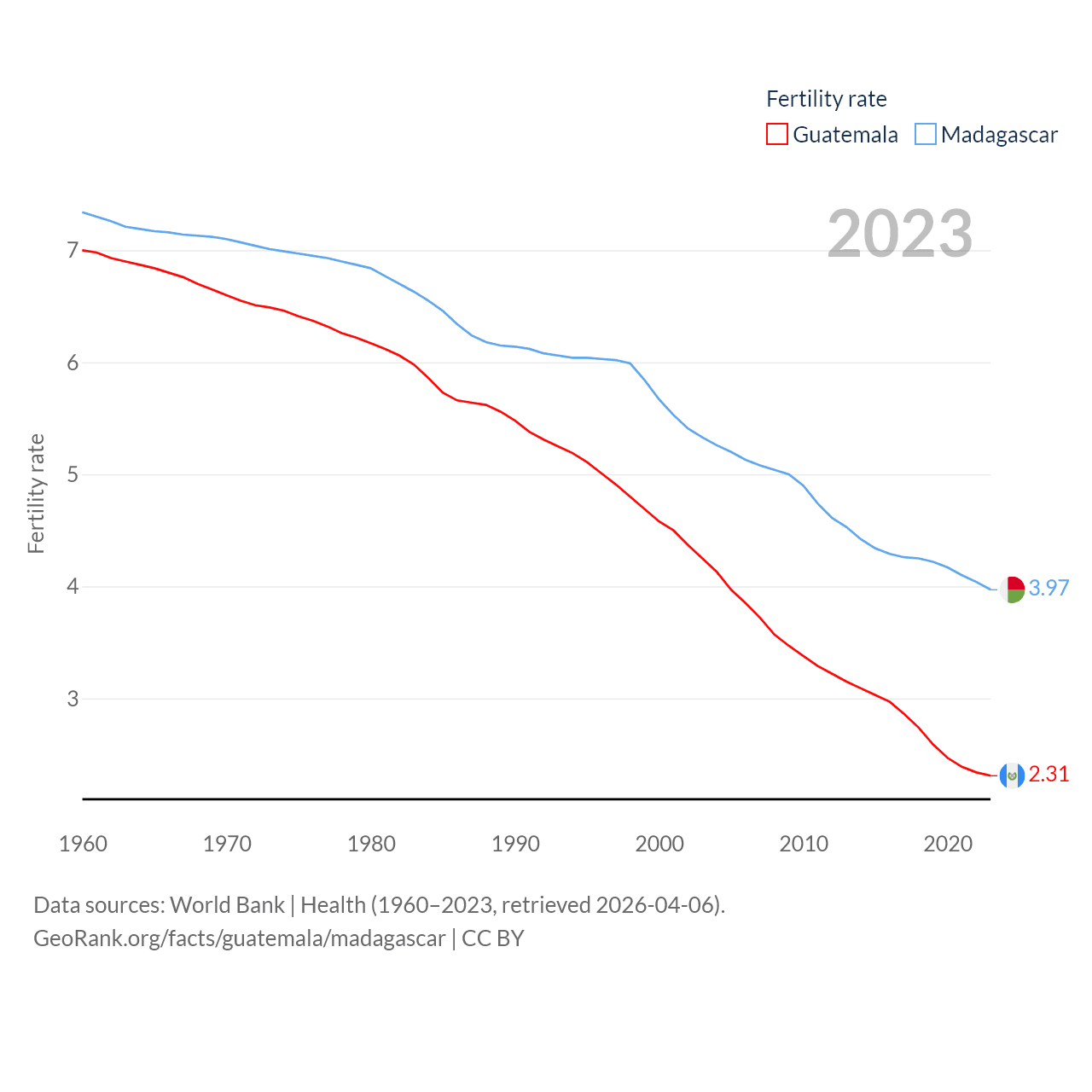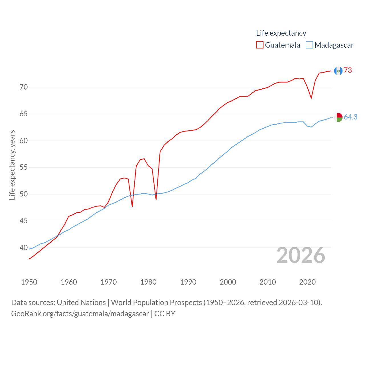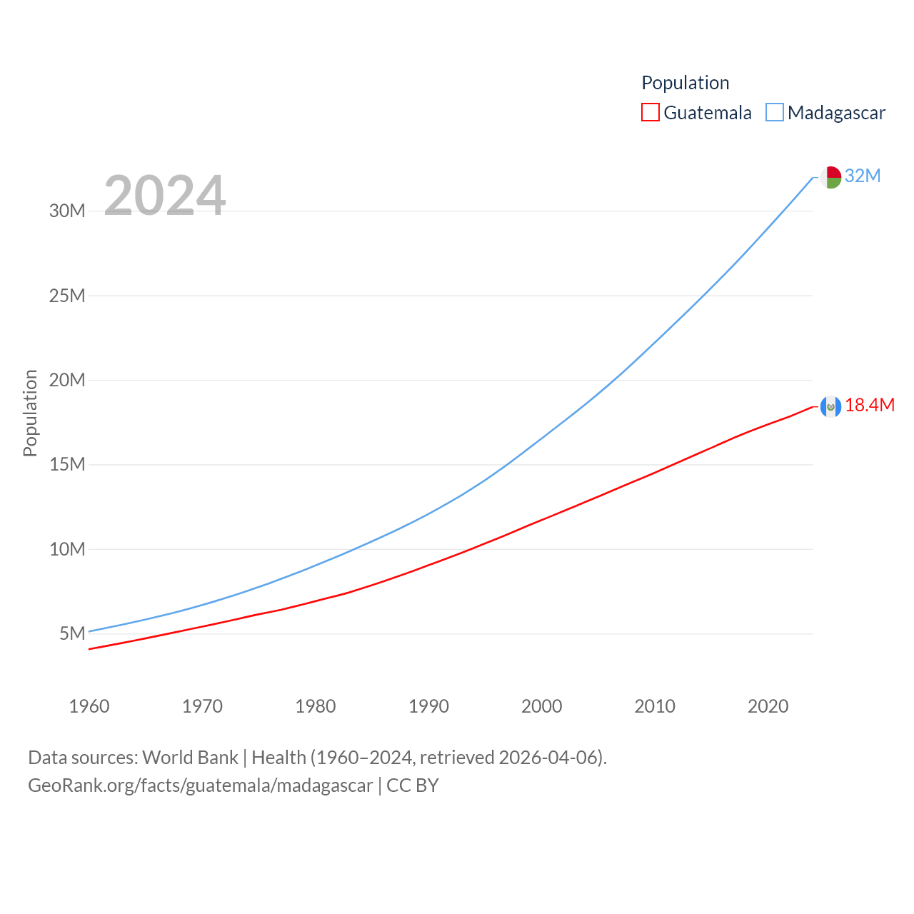 Guatemala has a population of 18.4M (ranked 70/197), compared with 32M in Madagascar (ranked 49/197). Guatemala's land area is 41,375 sq mi versus 224,634 sq mi for Madagascar (ranked 102nd vs. 44th).