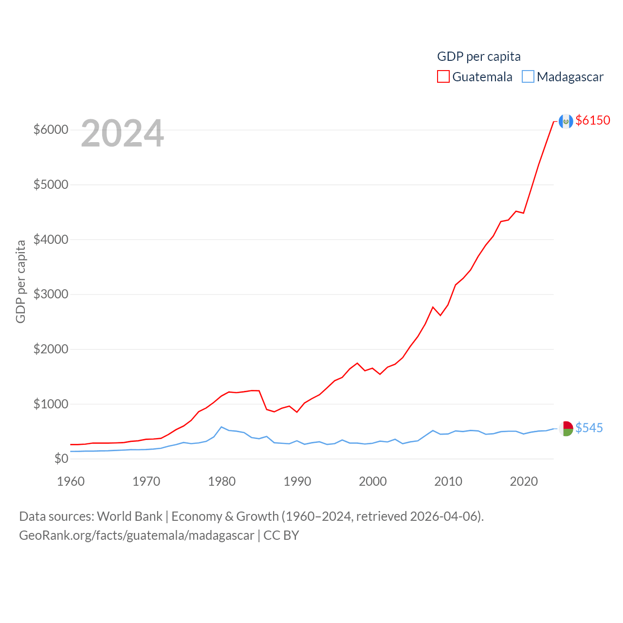 By GDP, Guatemala ranks 68/197 ($113B) and Madagascar ranks 136/197 ($17.4B). By GDP per capita, Guatemala ranks 112/197 ($6,150), while Madagascar ranks 193/197 ($545).