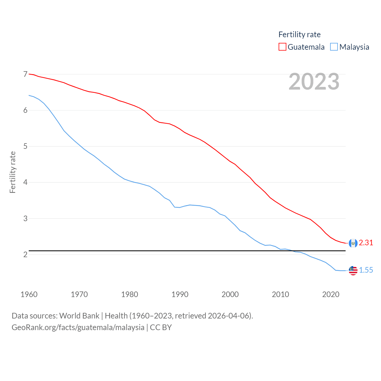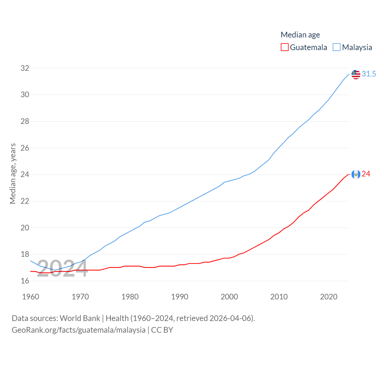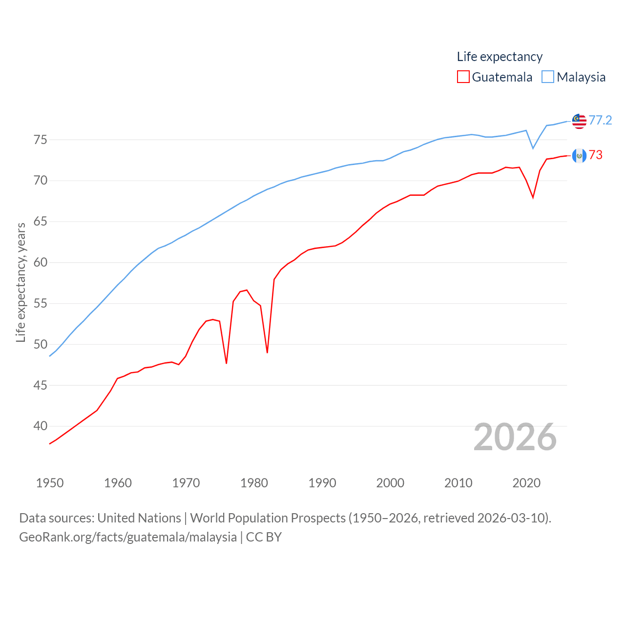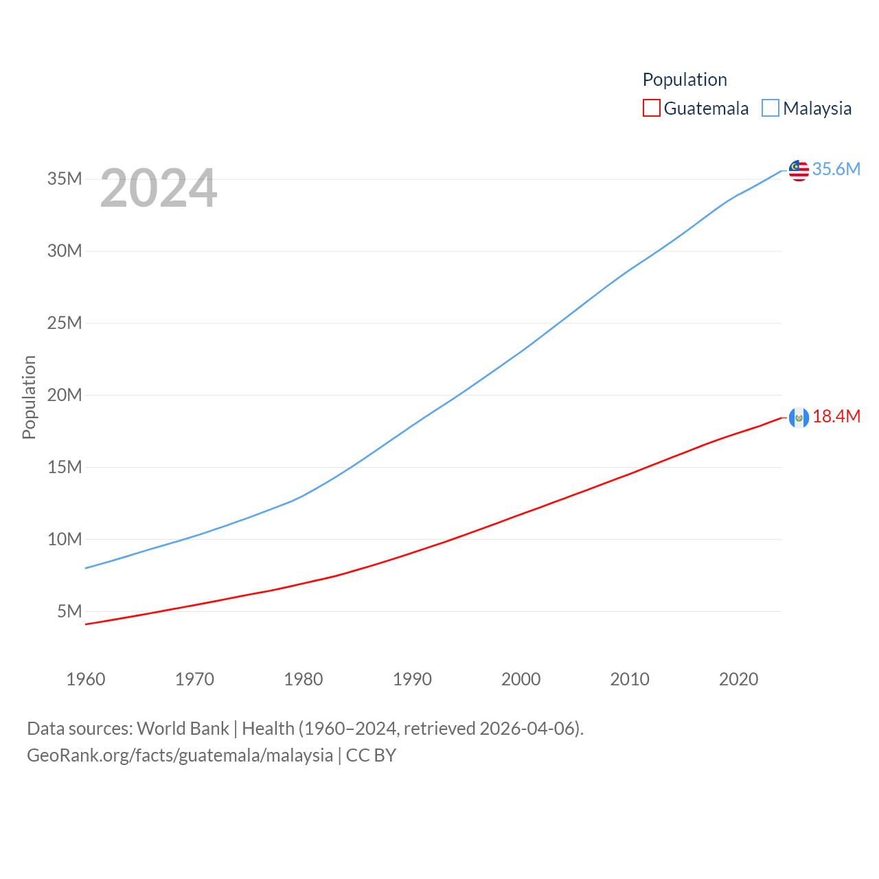 Guatemala has a population of 18.4M (ranked 70/197), compared with 35.6M in Malaysia (ranked 44/197). Guatemala's land area is 41,375 sq mi versus 126,854 sq mi for Malaysia (ranked 102nd vs. 65th).