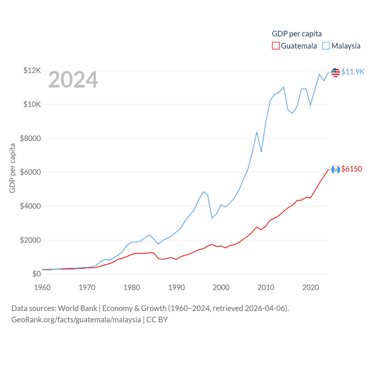 By GDP, Guatemala ranks 68/197 ($113B) and Malaysia ranks 38/197 ($422B). By GDP per capita, Guatemala ranks 112/197 ($6,150), while Malaysia ranks 79/197 ($11,874).