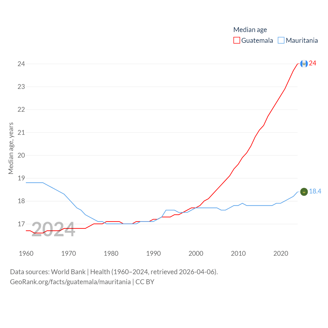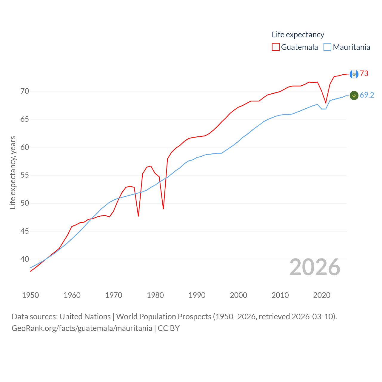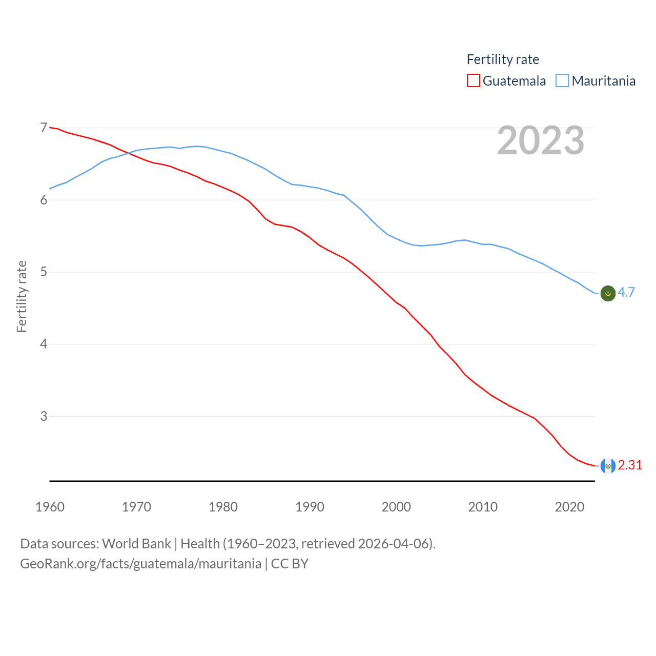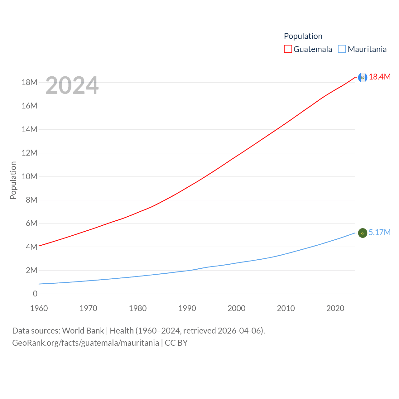 Guatemala has a population of 18.4M (ranked 70/197), compared with 5.17M in Mauritania (ranked 125/197). Guatemala's land area is 41,375 sq mi versus 397,955 sq mi for Mauritania (ranked 102nd vs. 28th).