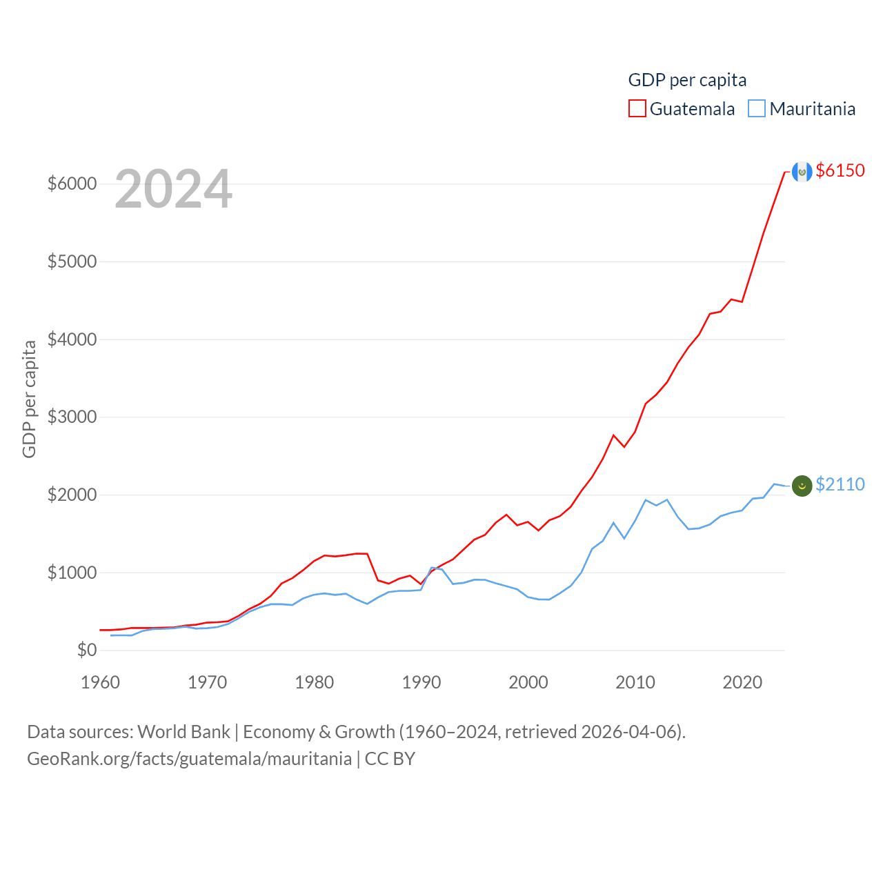 By GDP, Guatemala ranks 68/197 ($113B) and Mauritania ranks 153/197 ($10.9B). By GDP per capita, Guatemala ranks 112/197 ($6,150), while Mauritania ranks 156/197 ($2,110).