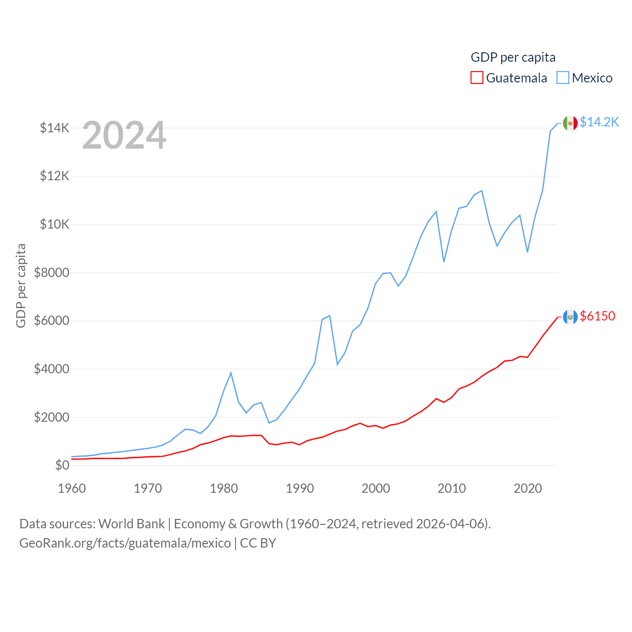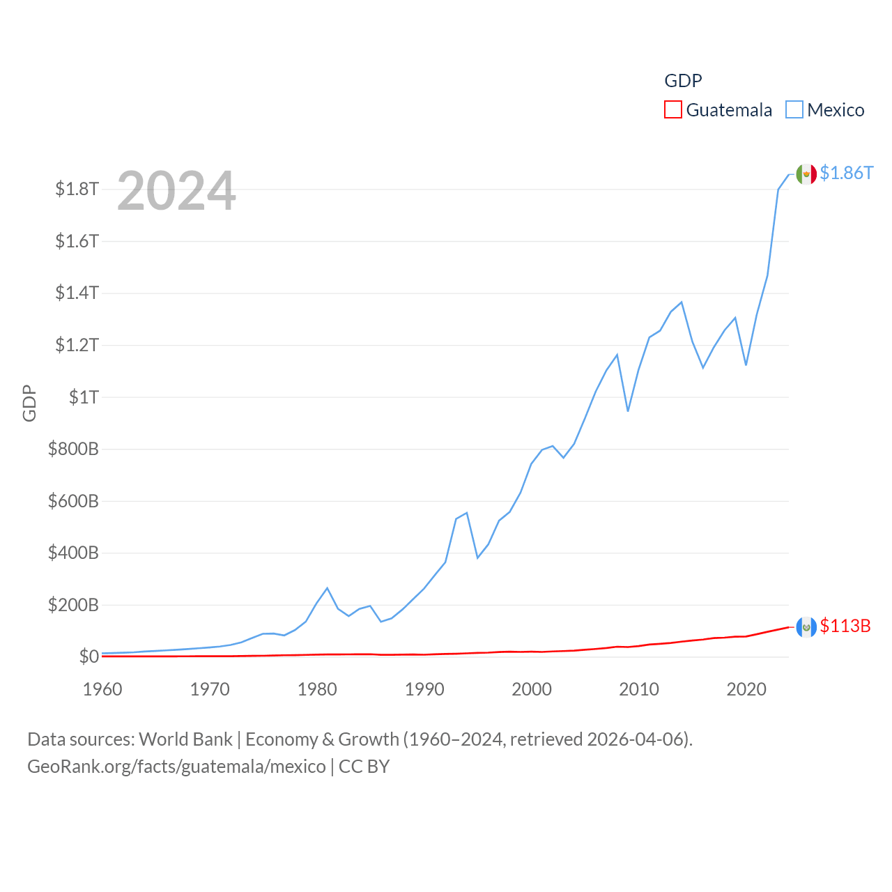 By GDP, Guatemala ranks 68/197 ($113B) and Mexico ranks 13/197 ($1.86T). By GDP per capita, Guatemala ranks 112/197 ($6,150), while Mexico ranks 69/197 ($14,186).