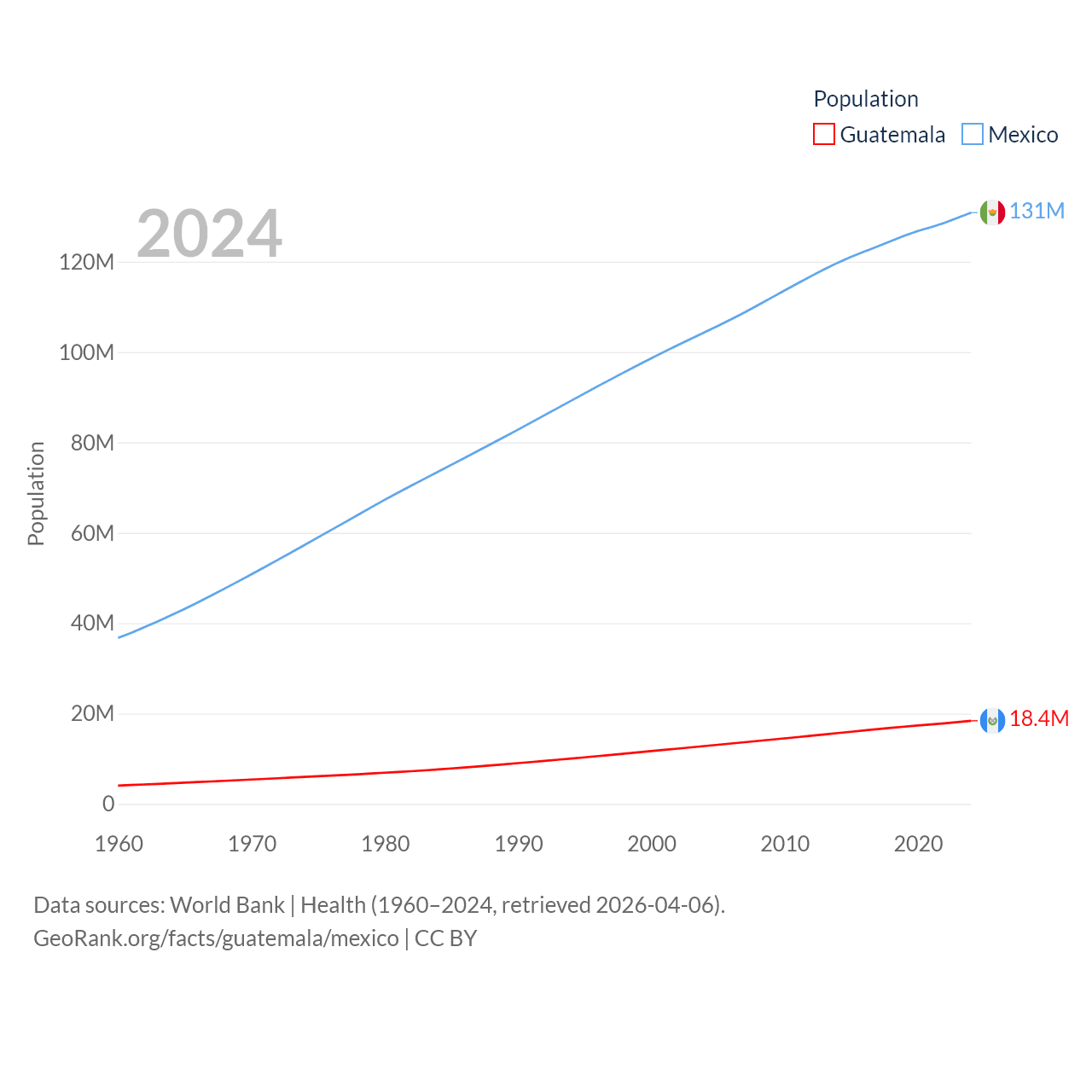 Guatemala has a population of 18.4M (ranked 70/197), compared with 131M in Mexico (ranked 11/197). Guatemala's land area is 41,375 sq mi versus 750,563 sq mi for Mexico (ranked 102nd vs. 13th).