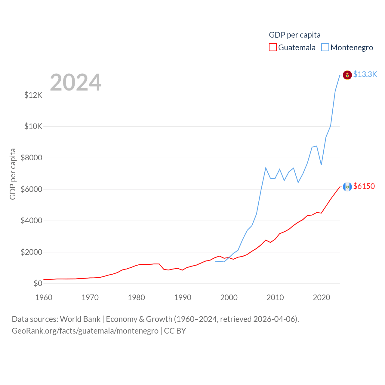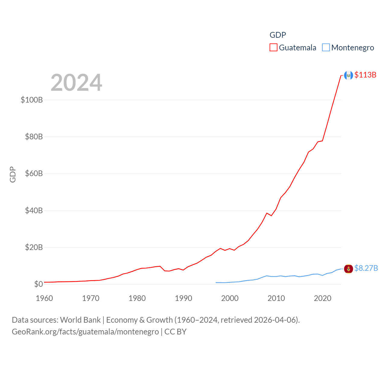 By GDP, Guatemala ranks 68/197 ($113B) and Montenegro ranks 155/197 ($8.27B). By GDP per capita, Guatemala ranks 112/197 ($6,150), while Montenegro ranks 77/197 ($13,263).