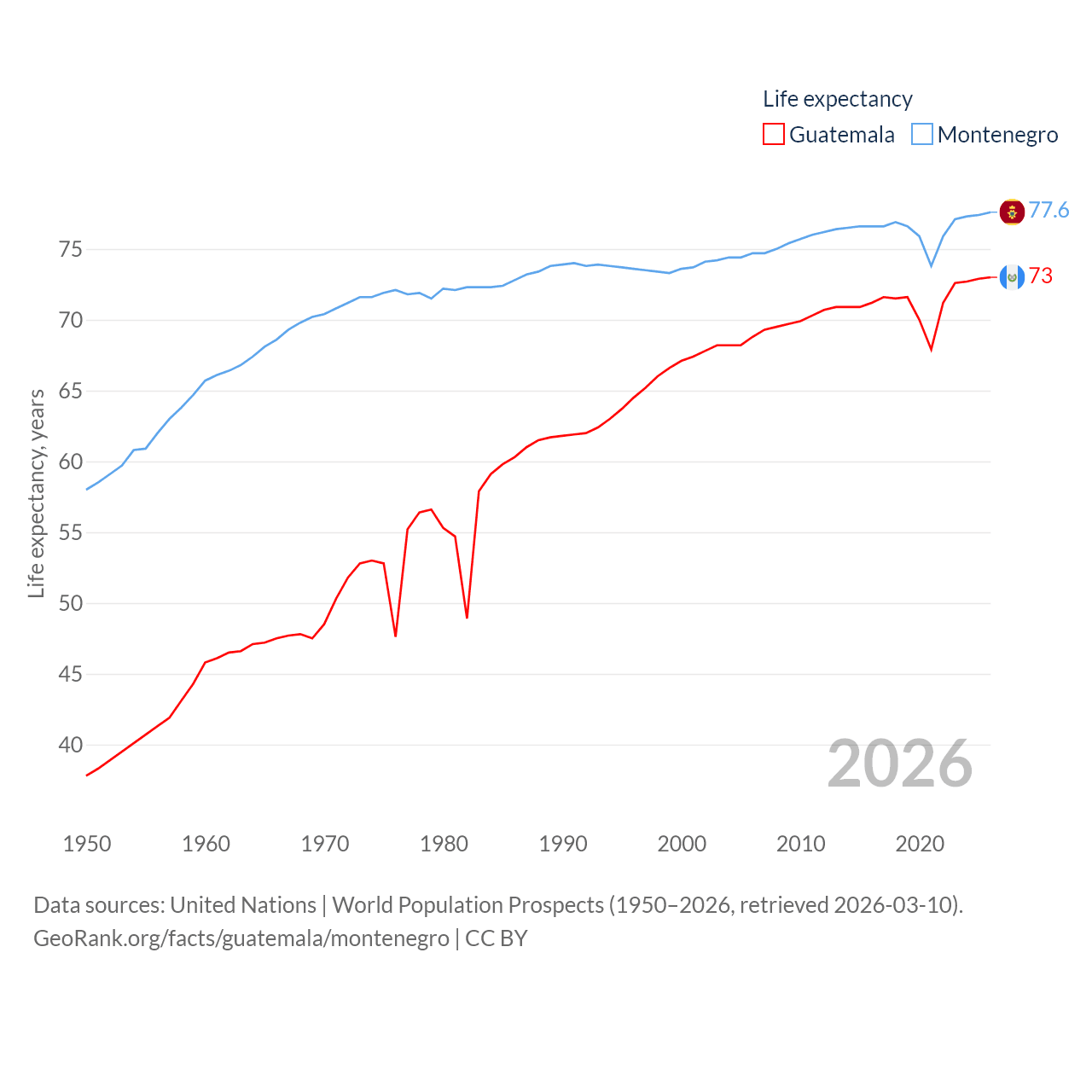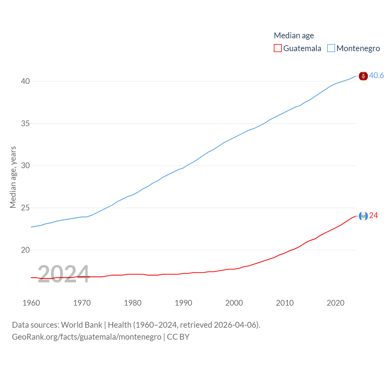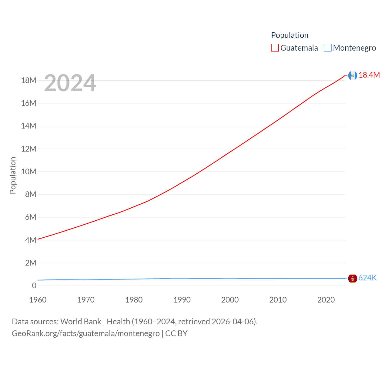 Guatemala has a population of 18.4M (ranked 70/197), compared with 624K in Montenegro (ranked 166/197). Guatemala's land area is 41,375 sq mi versus 5,193 sq mi for Montenegro (ranked 102nd vs. 156th).