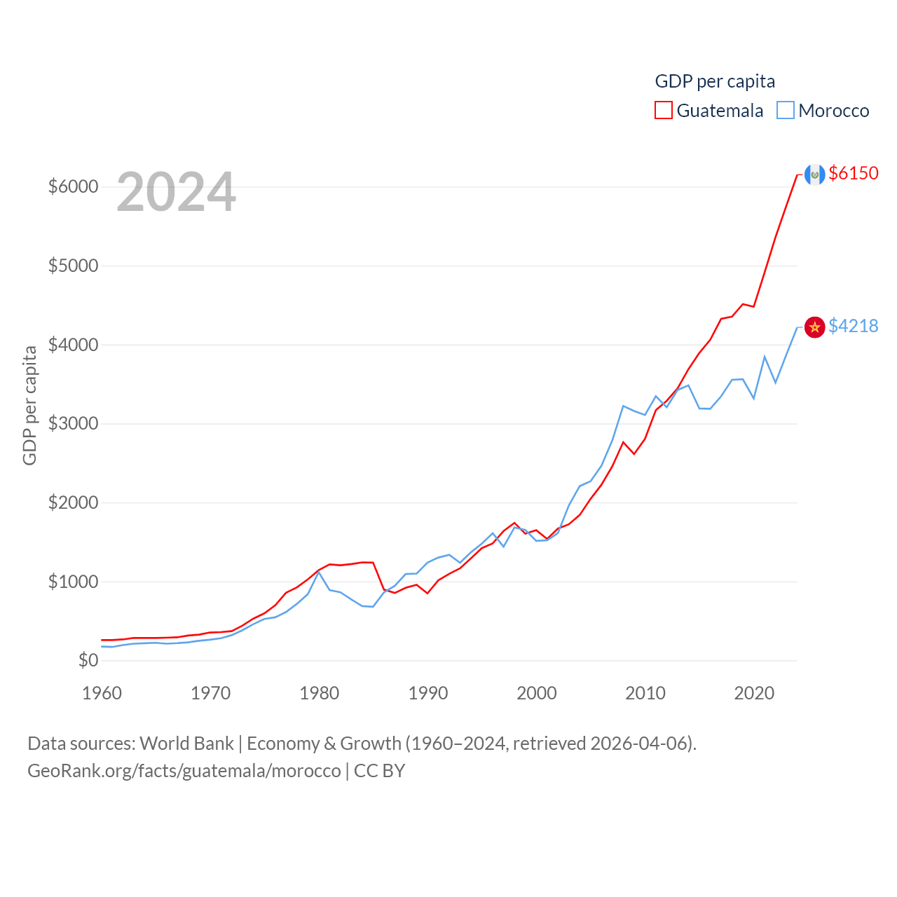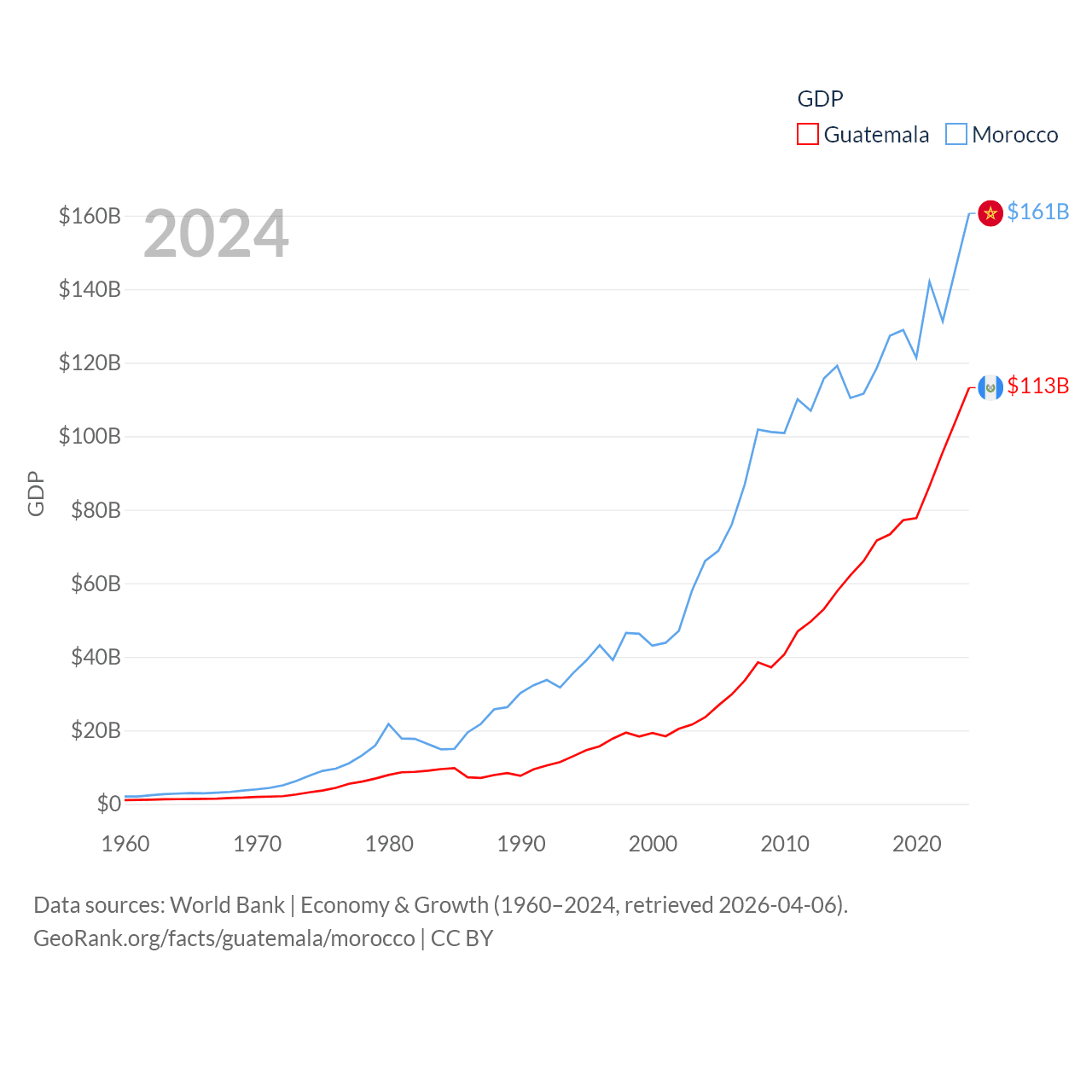 By GDP, Guatemala ranks 68/197 ($113B) and Morocco ranks 58/197 ($161B). By GDP per capita, Guatemala ranks 112/197 ($6,150), while Morocco ranks 127/197 ($4,218).