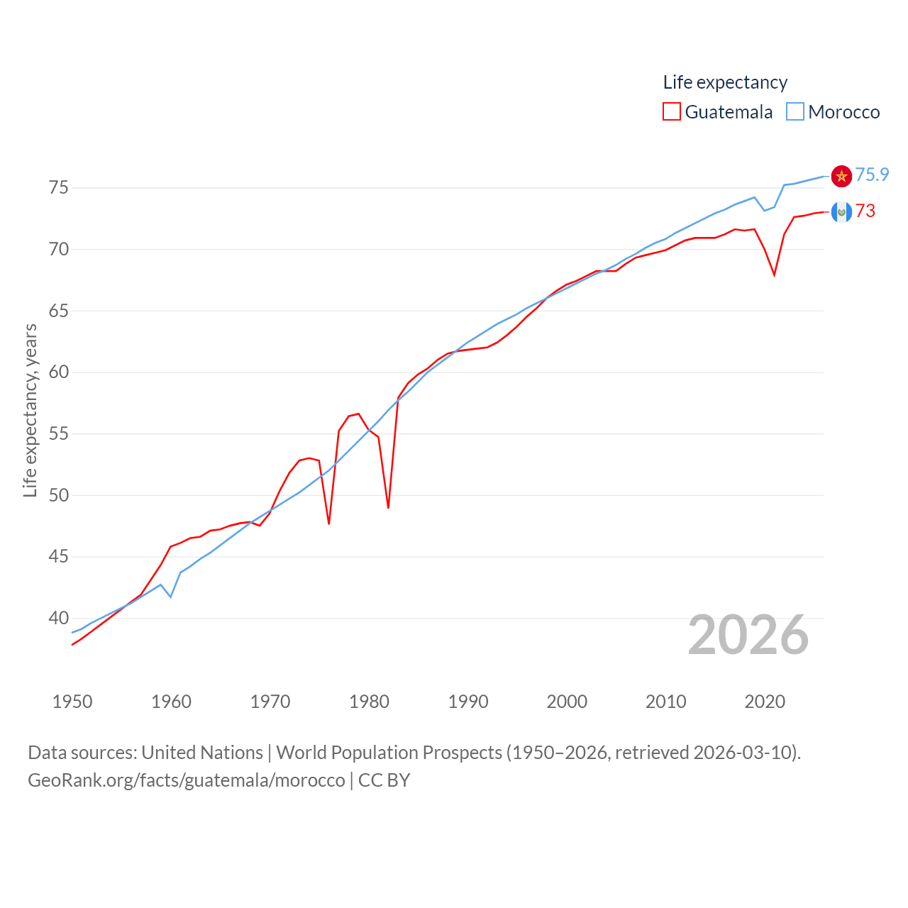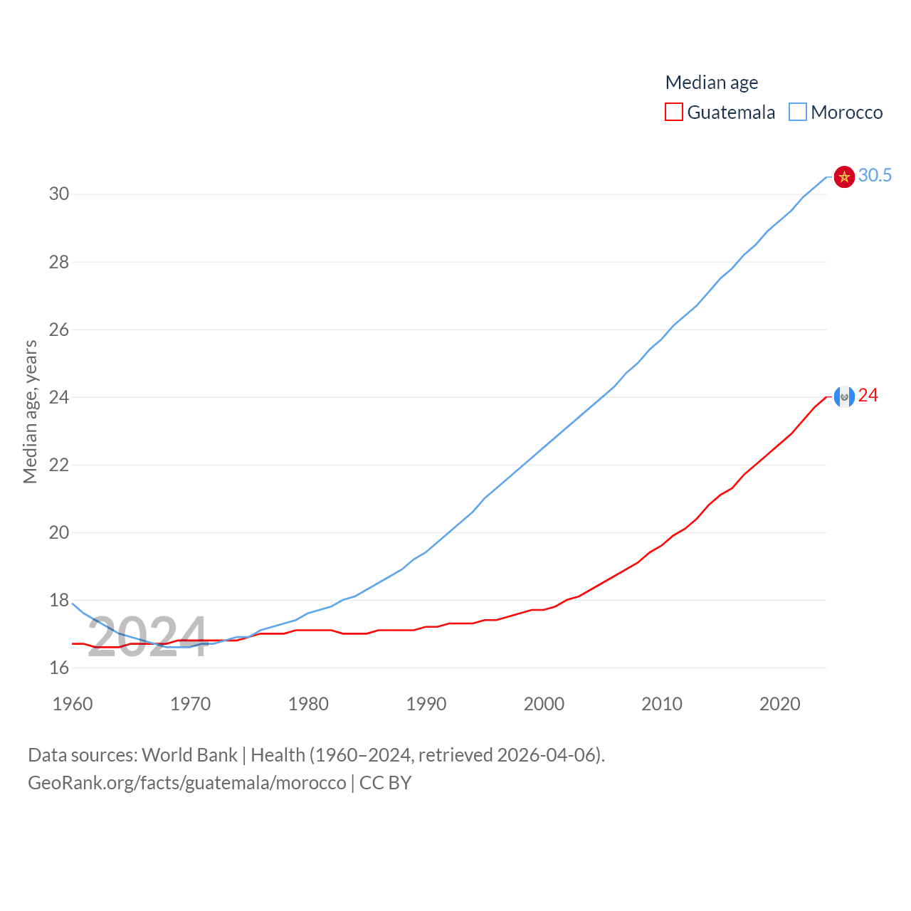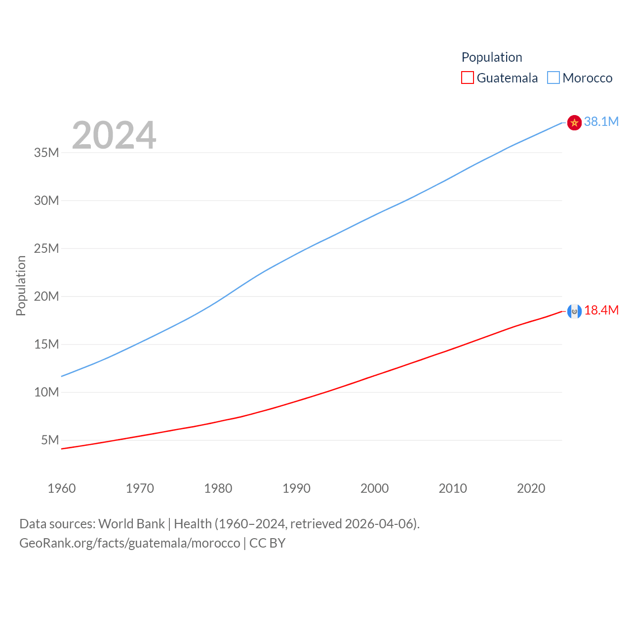 Guatemala has a population of 18.4M (ranked 70/197), compared with 38.1M in Morocco (ranked 39/197). Guatemala's land area is 41,375 sq mi versus 172,317 sq mi for Morocco (ranked 102nd vs. 55th).