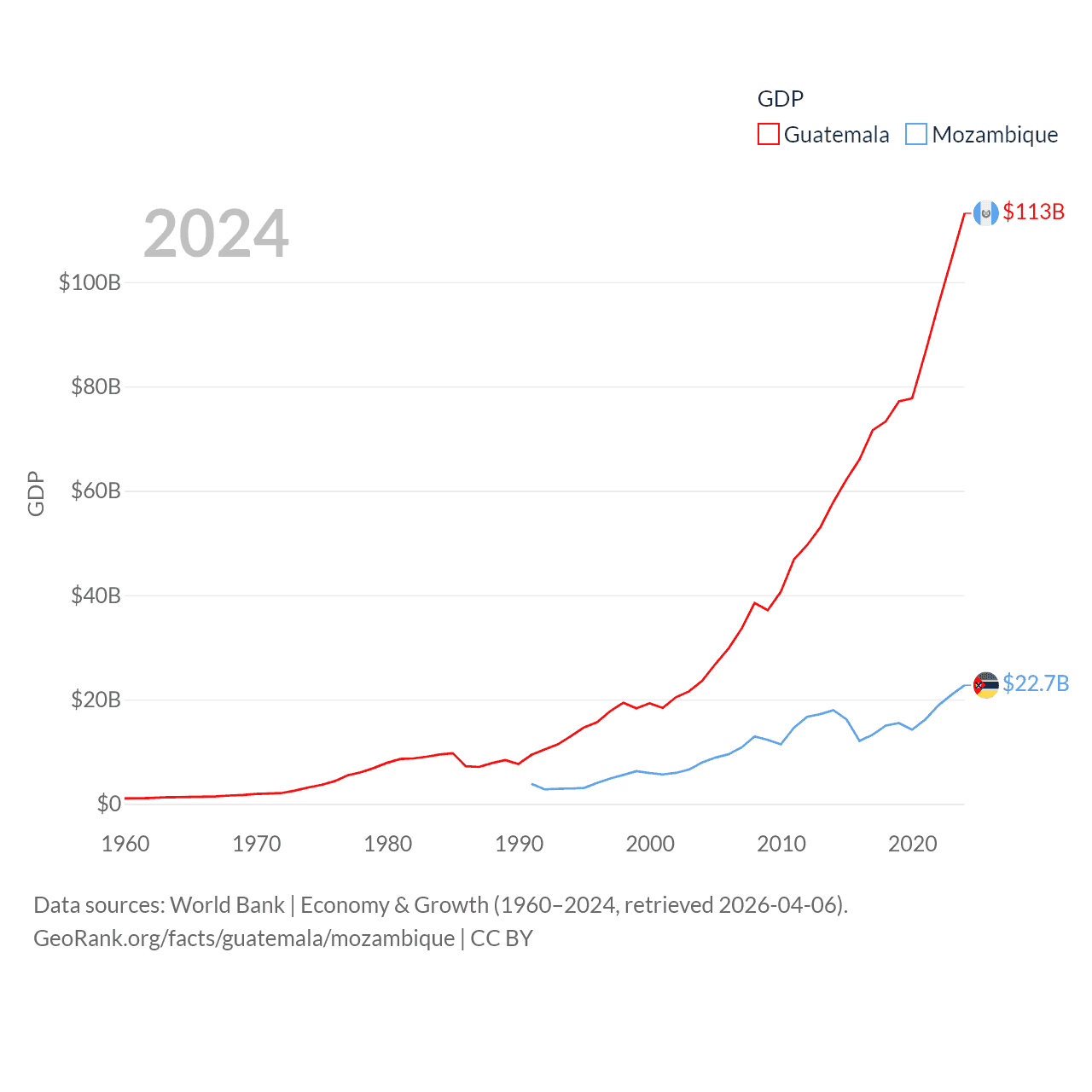 By GDP, Guatemala ranks 68/197 ($113B) and Mozambique ranks 123/197 ($22.7B). By GDP per capita, Guatemala ranks 112/197 ($6,150), while Mozambique ranks 189/197 ($657).