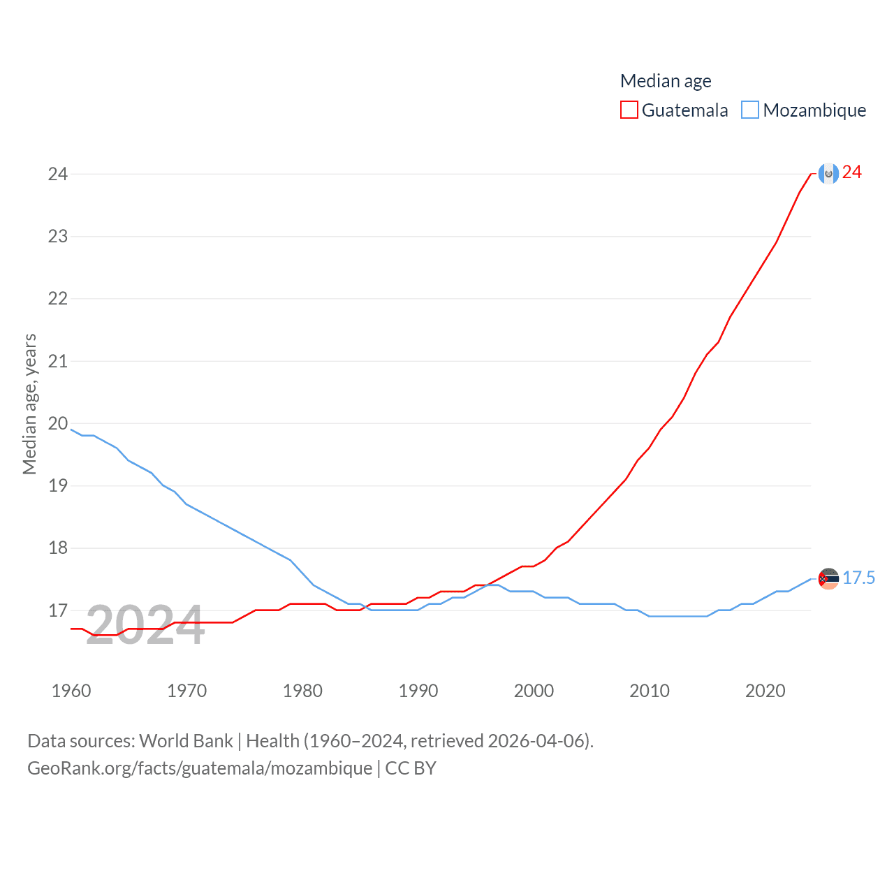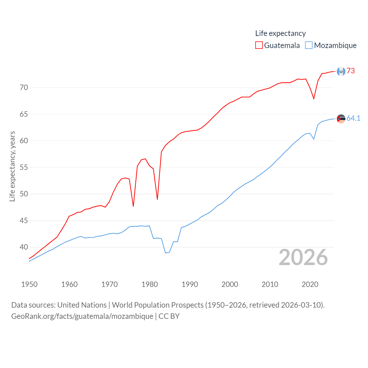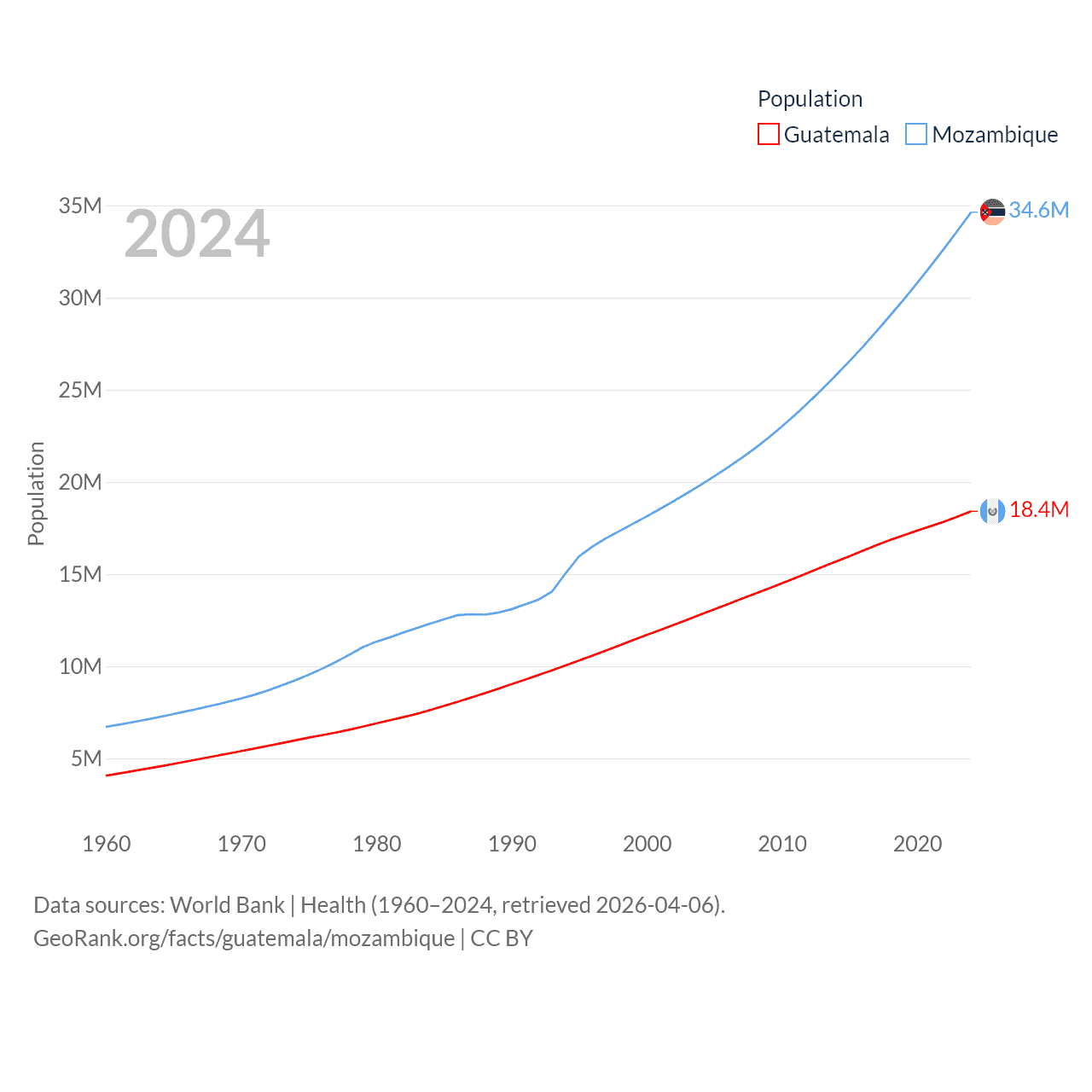 Guatemala has a population of 18.4M (ranked 70/197), compared with 34.6M in Mozambique (ranked 46/197). Guatemala's land area is 41,375 sq mi versus 303,623 sq mi for Mozambique (ranked 102nd vs. 34th).