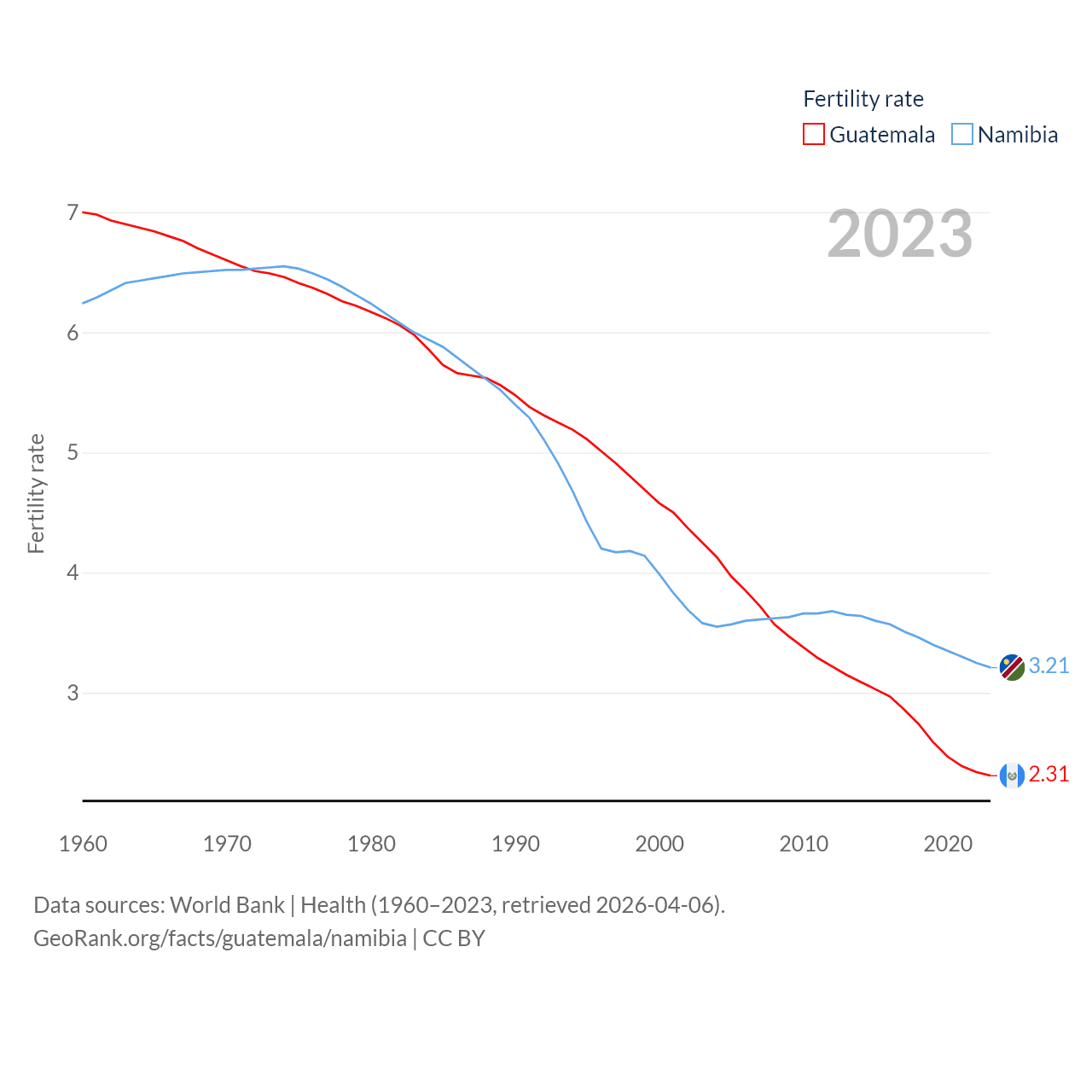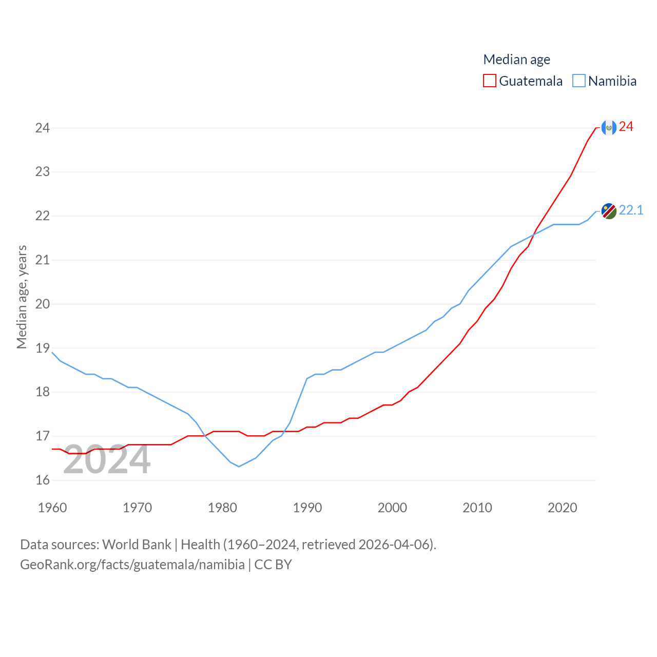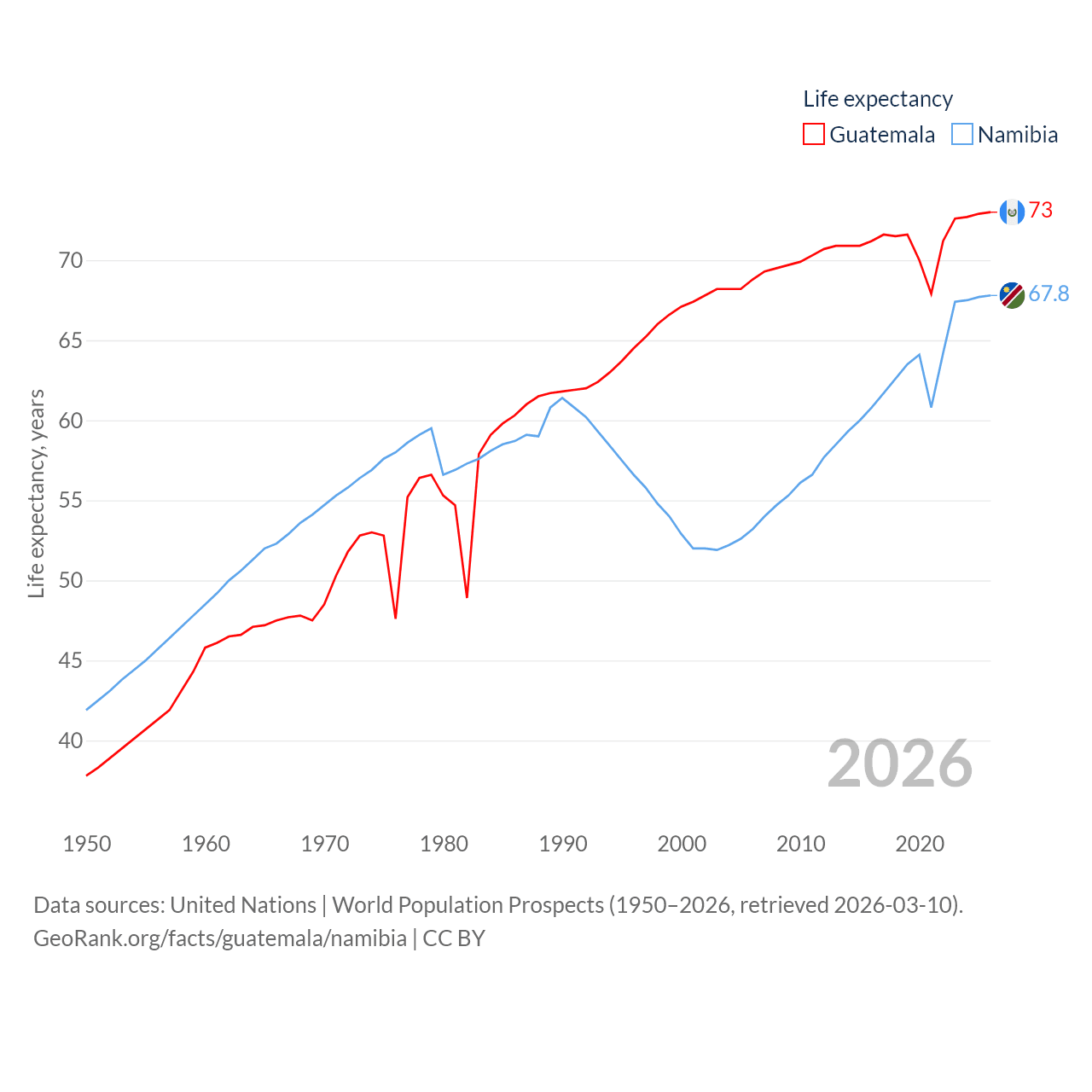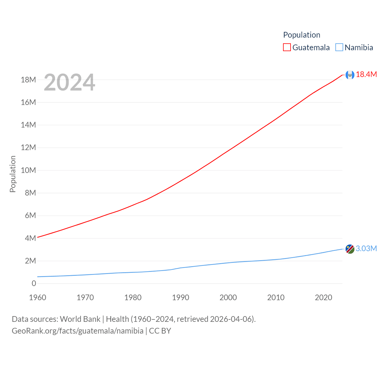 Guatemala has a population of 18.4M (ranked 70/197), compared with 3.03M in Namibia (ranked 136/197). Guatemala's land area is 41,375 sq mi versus 317,874 sq mi for Namibia (ranked 102nd vs. 33rd).