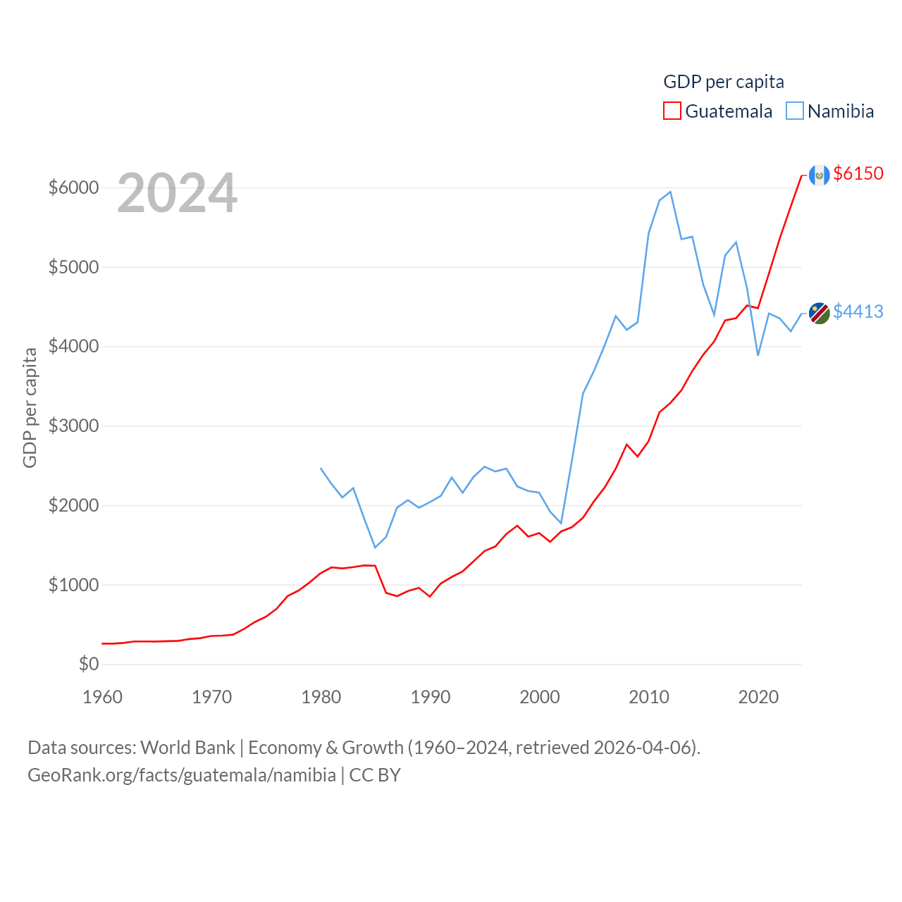 By GDP, Guatemala ranks 68/197 ($113B) and Namibia ranks 147/197 ($13.4B). By GDP per capita, Guatemala ranks 112/197 ($6,150), while Namibia ranks 126/197 ($4,413).