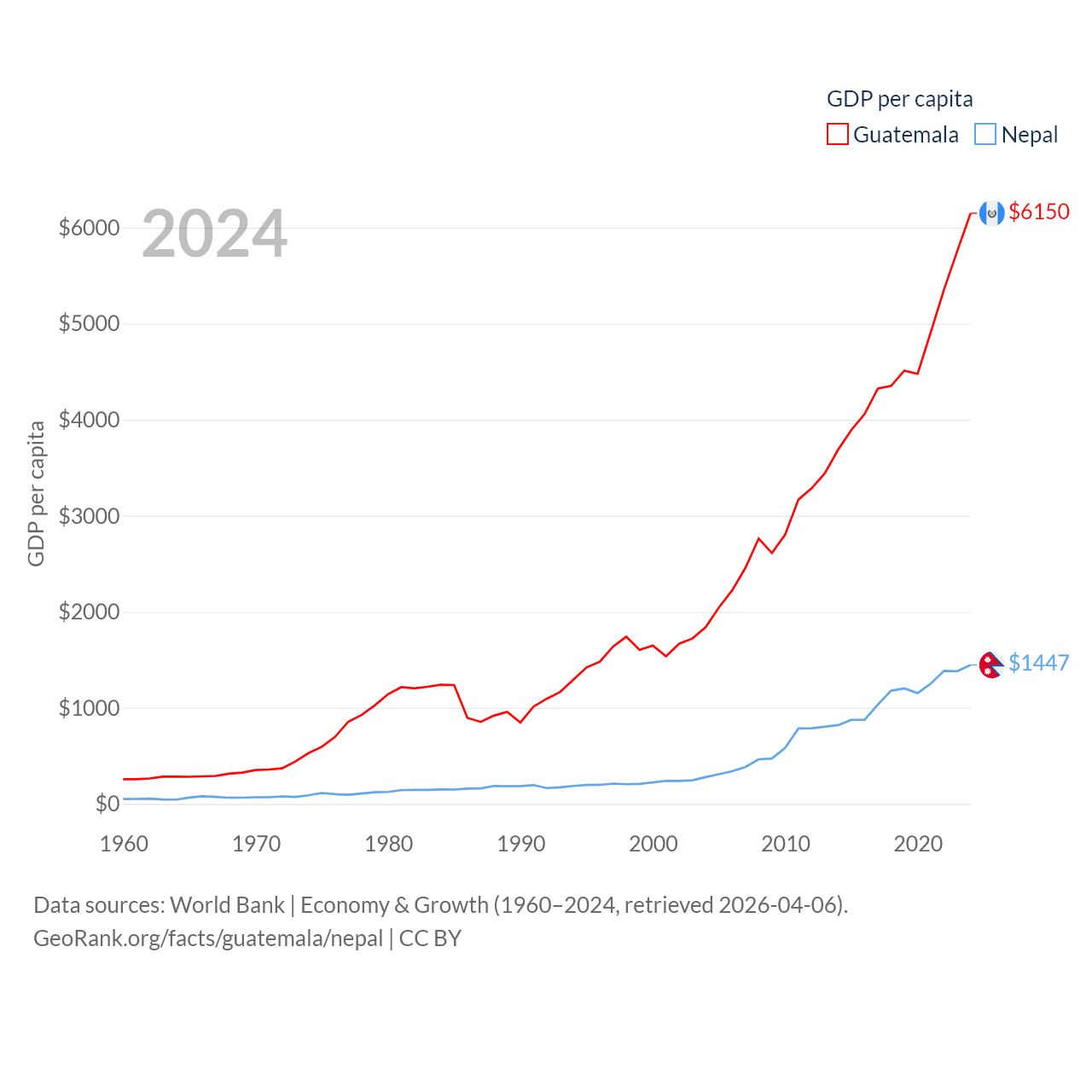 By GDP, Guatemala ranks 68/197 ($113B) and Nepal ranks 101/197 ($42.9B). By GDP per capita, Guatemala ranks 112/197 ($6,150), while Nepal ranks 164/197 ($1,447).
