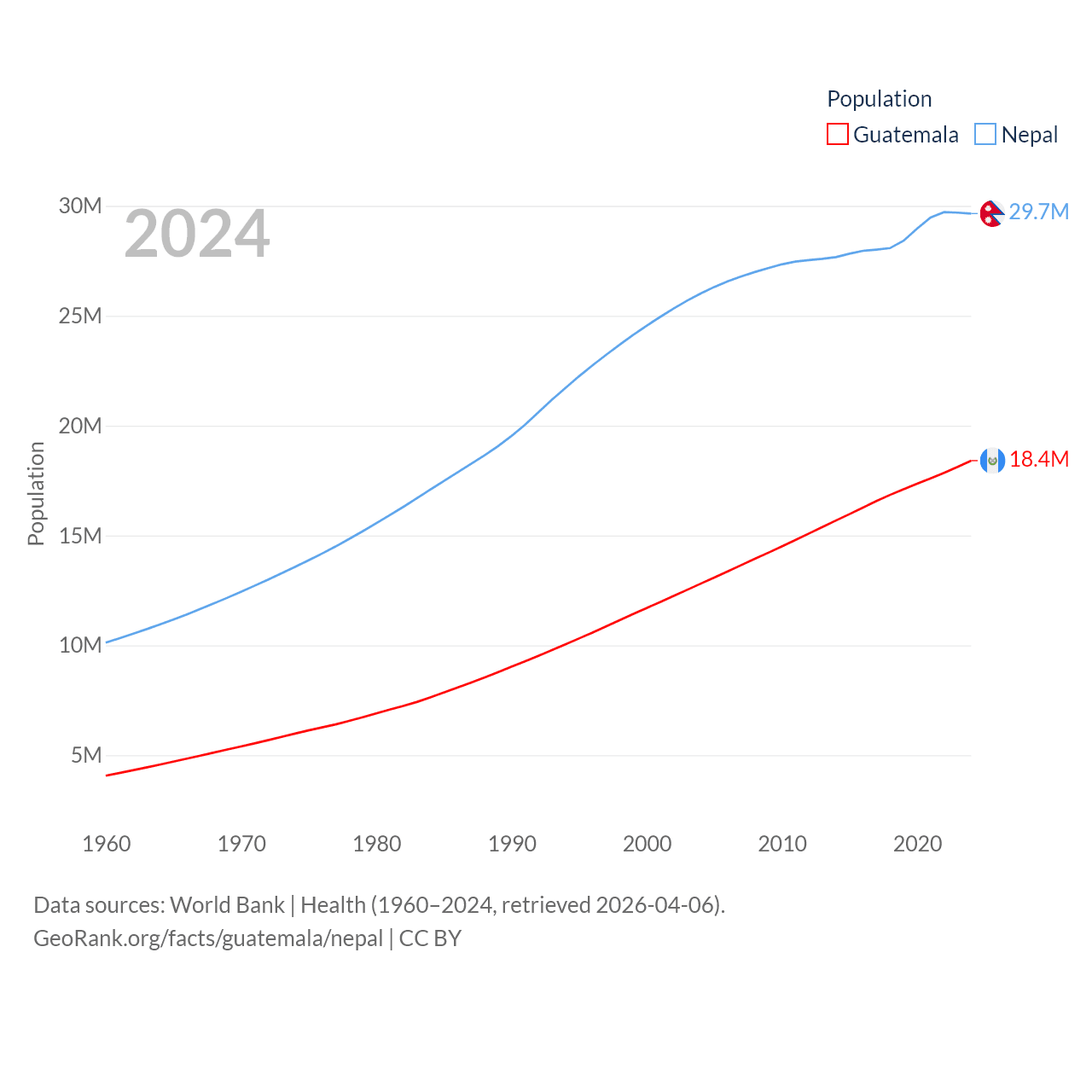 Guatemala has a population of 18.4M (ranked 70/197), compared with 29.7M in Nepal (ranked 51/197). Guatemala's land area is 41,375 sq mi versus 55,348 sq mi for Nepal (ranked 102nd vs. 92nd).
