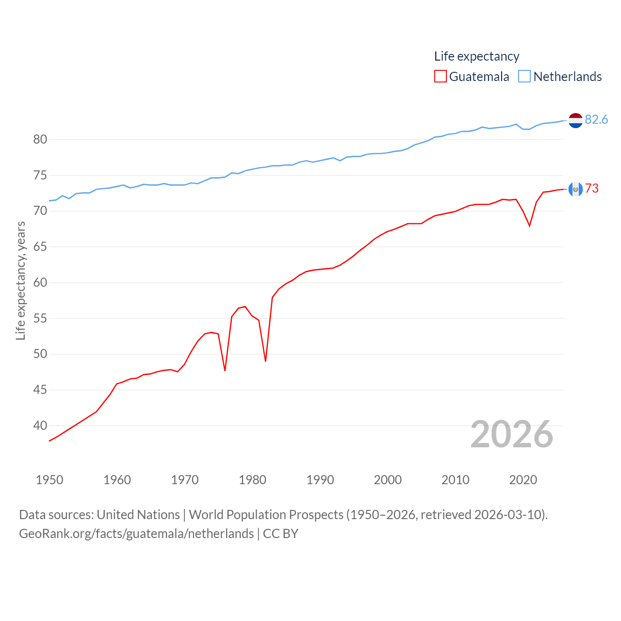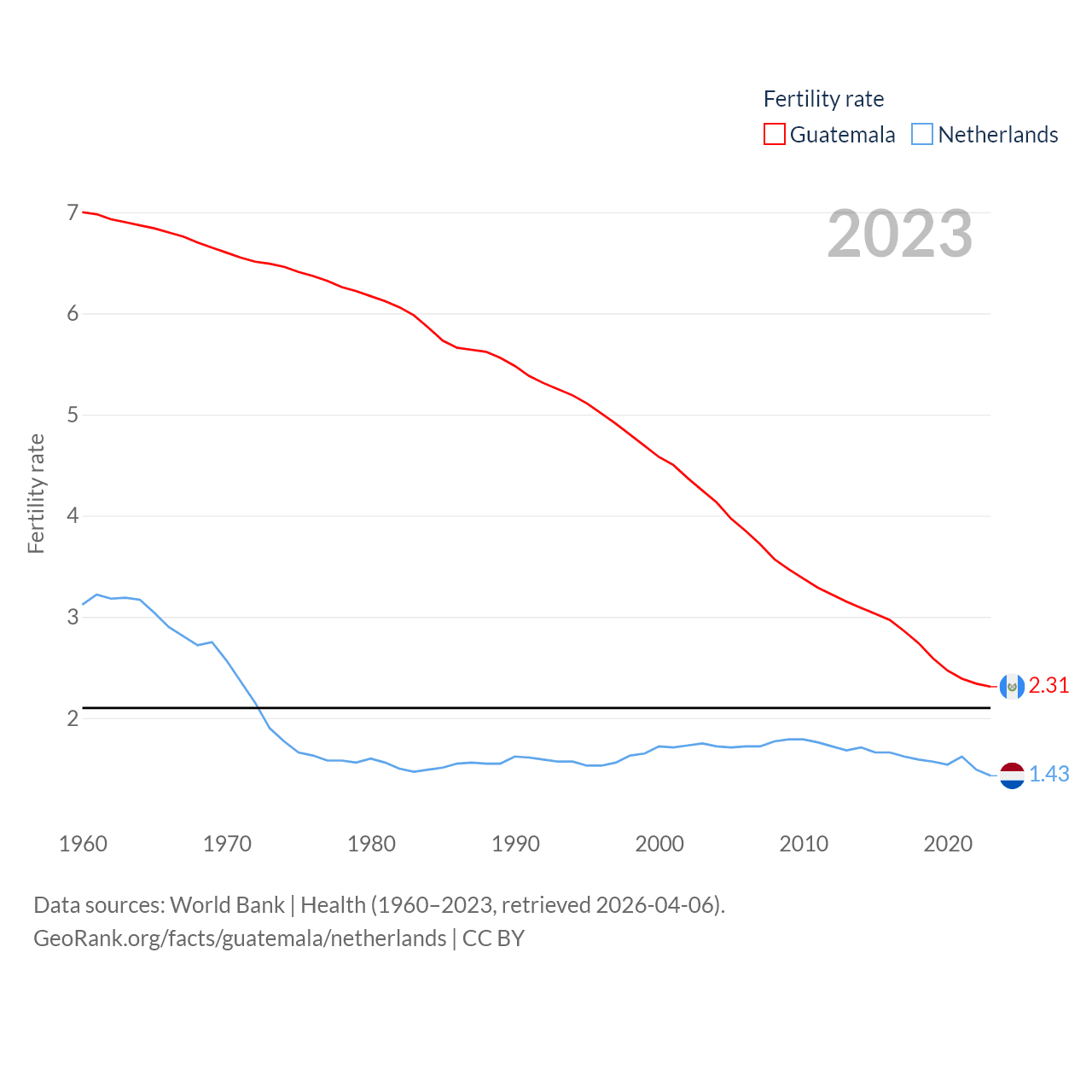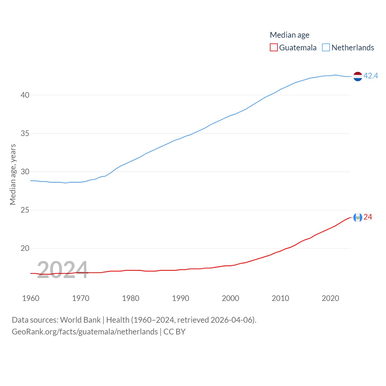 Guatemala has a population of 18.4M (ranked 70/197), compared with 18M in The Netherlands (ranked 72/197). Guatemala's land area is 41,375 sq mi versus 13,000 sq mi for The Netherlands (ranked 102nd vs. 134th).
