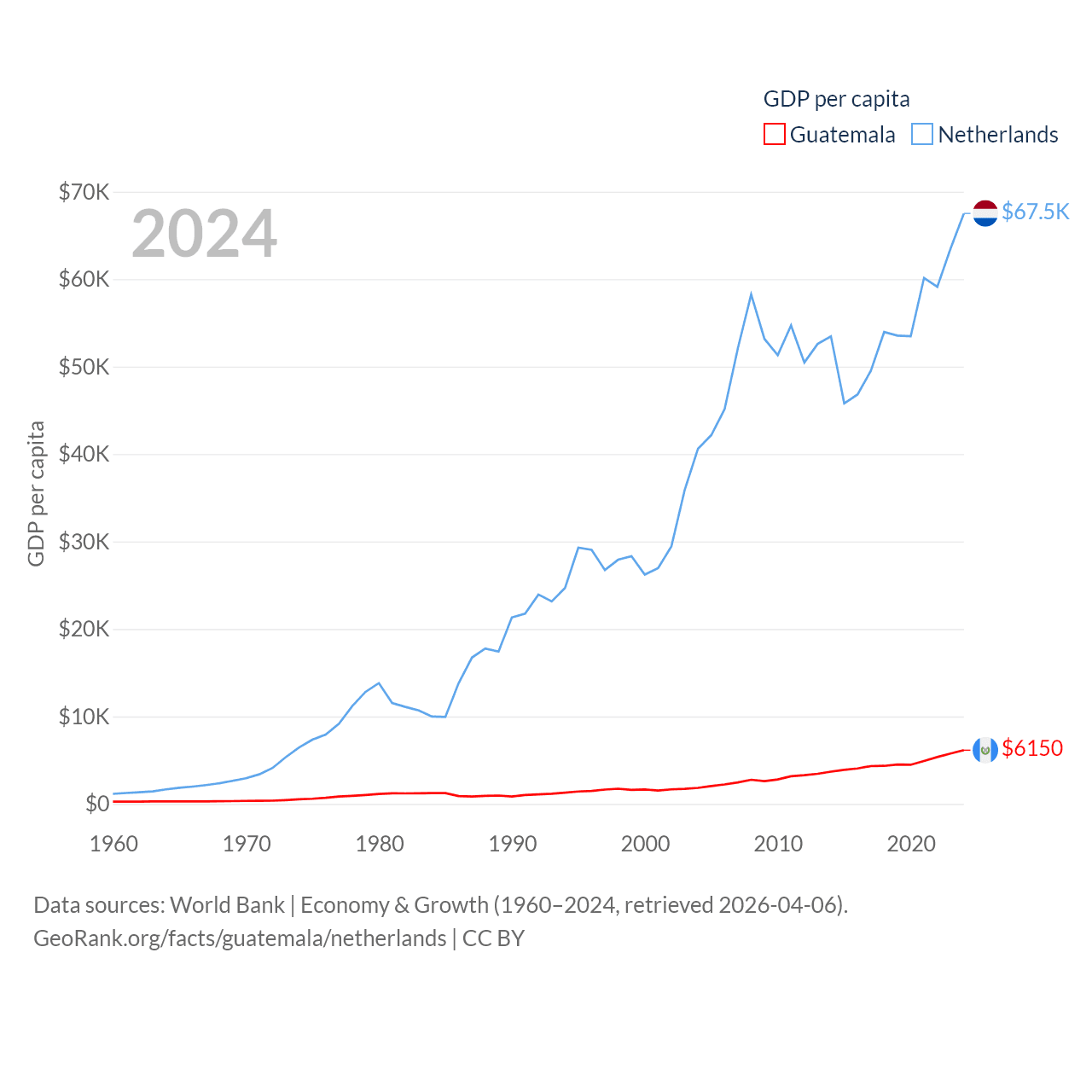 By GDP, Guatemala ranks 68/197 ($113B) and The Netherlands ranks 19/197 ($1.21T). By GDP per capita, Guatemala ranks 112/197 ($6,150), while The Netherlands ranks 13/197 ($67,520).