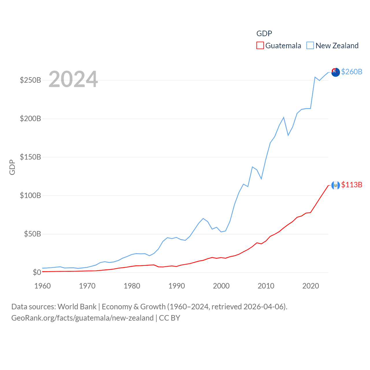By GDP, Guatemala ranks 68/197 ($113B) and New Zealand ranks 52/197 ($260B). By GDP per capita, Guatemala ranks 112/197 ($6,150), while New Zealand ranks 26/197 ($49,205).