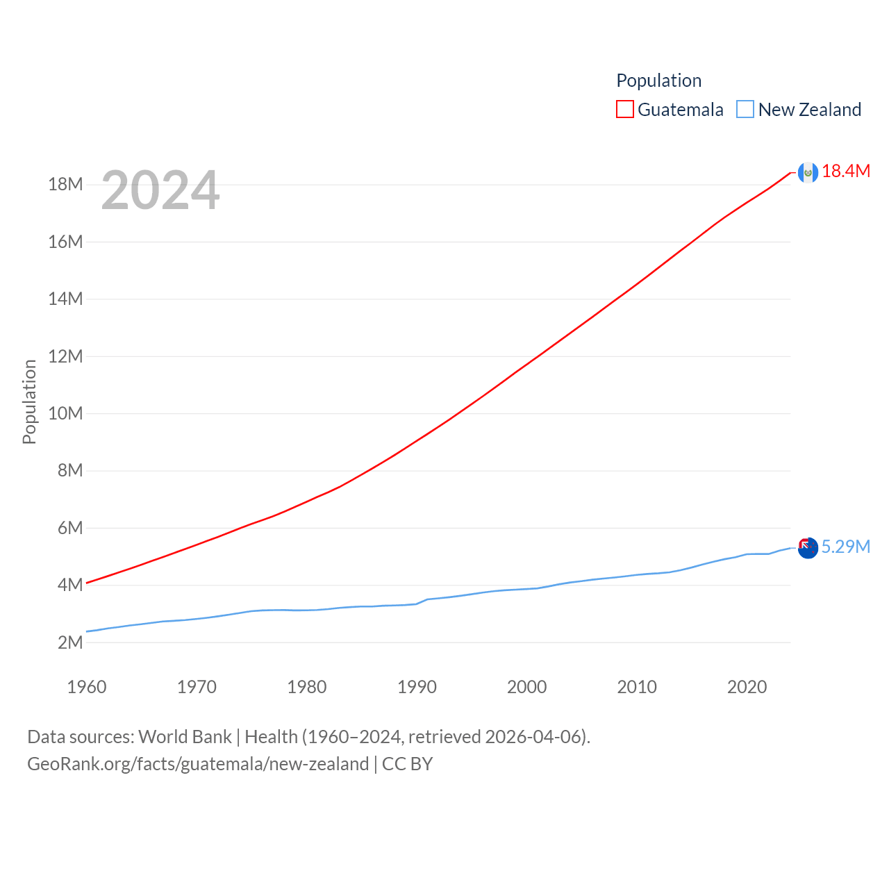 Guatemala has a population of 18.4M (ranked 70/197), compared with 5.29M in New Zealand (ranked 123/197). Guatemala's land area is 41,375 sq mi versus 101,665 sq mi for New Zealand (ranked 102nd vs. 74th).