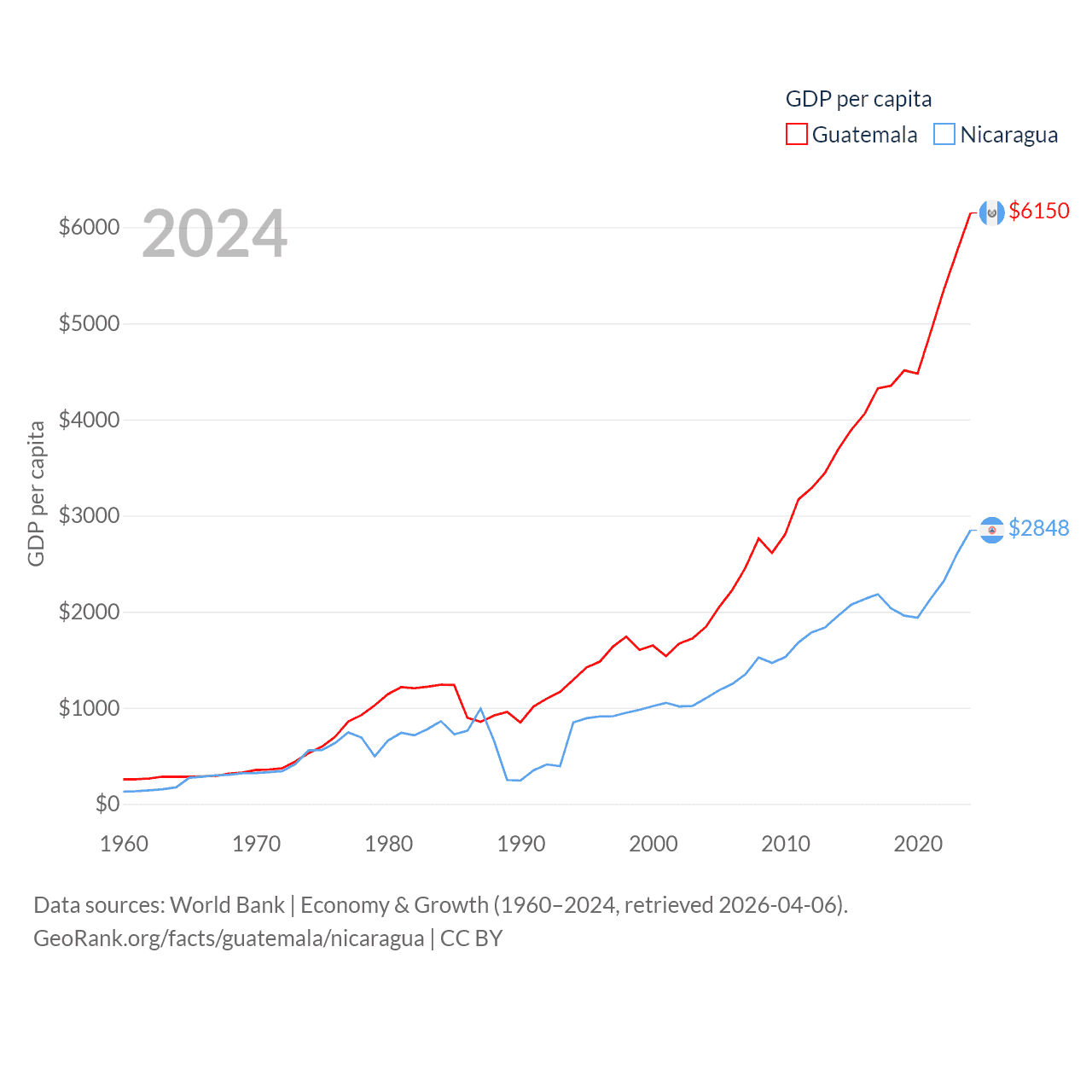 By GDP, Guatemala ranks 68/197 ($113B) and Nicaragua ranks 131/197 ($19.7B). By GDP per capita, Guatemala ranks 112/197 ($6,150), while Nicaragua ranks 141/197 ($2,848).
