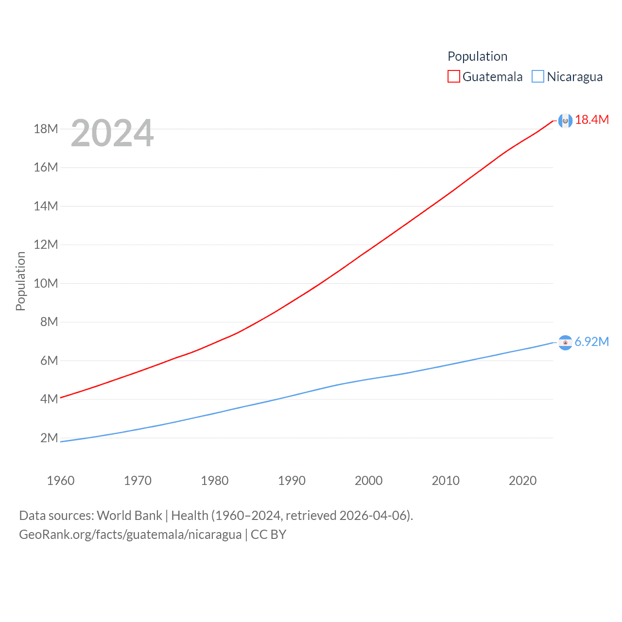 Guatemala has a population of 18.4M (ranked 70/197), compared with 6.92M in Nicaragua (ranked 108/197). Guatemala's land area is 41,375 sq mi versus 46,464 sq mi for Nicaragua (ranked 102nd vs. 98th).