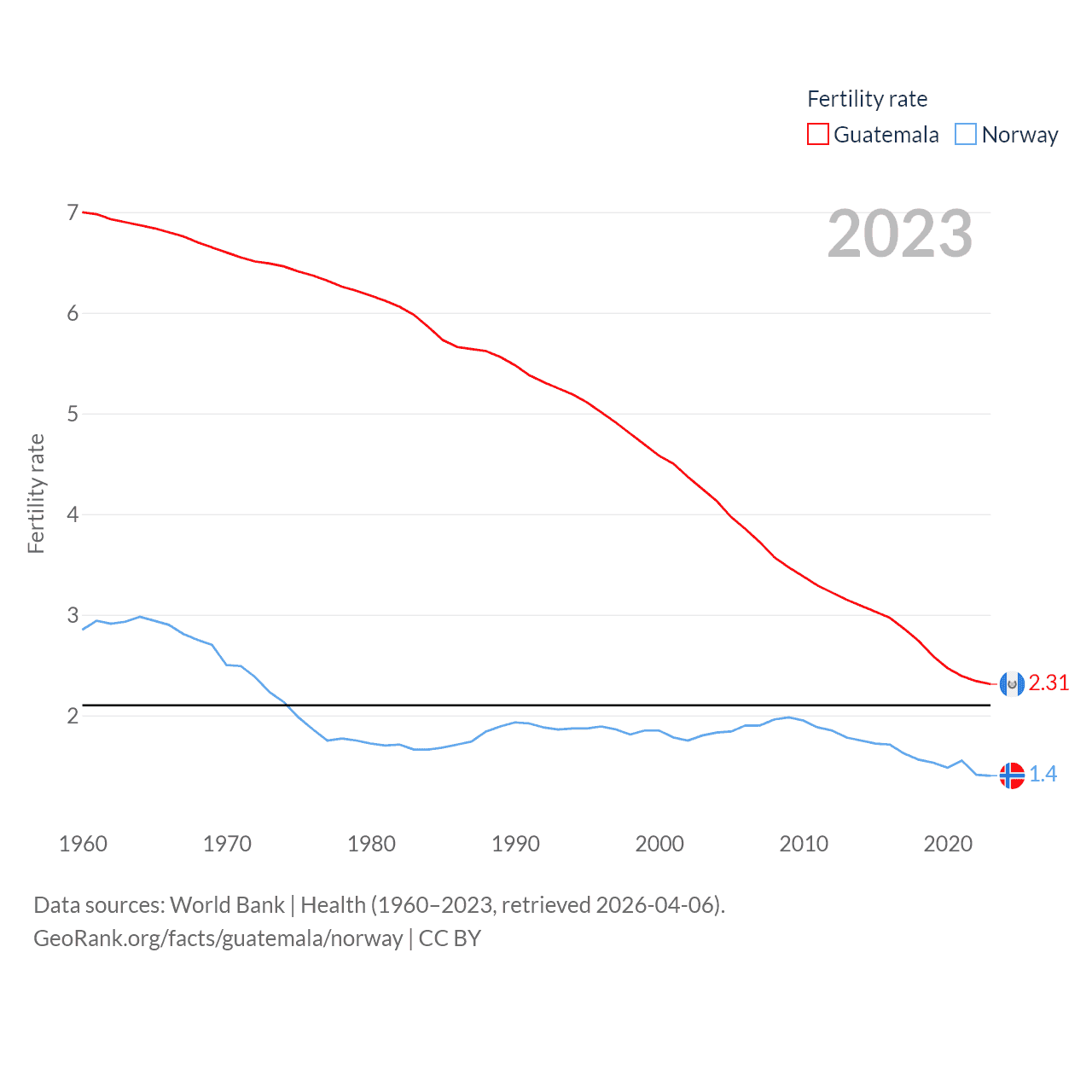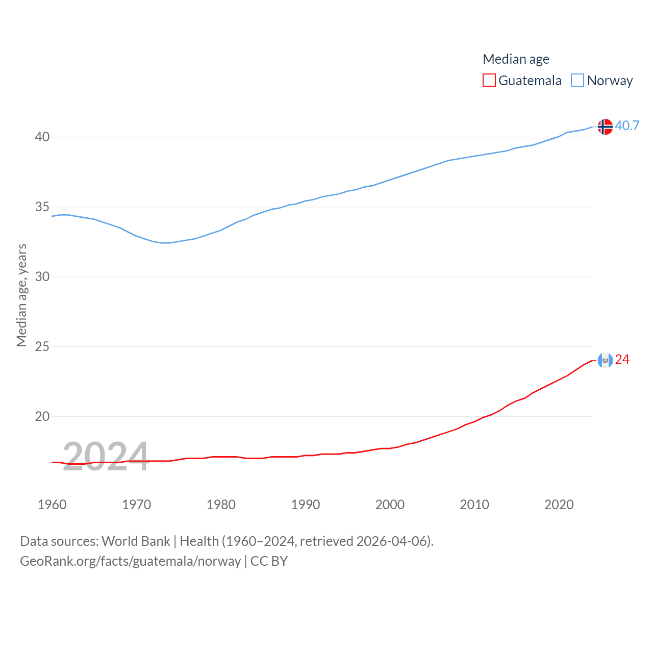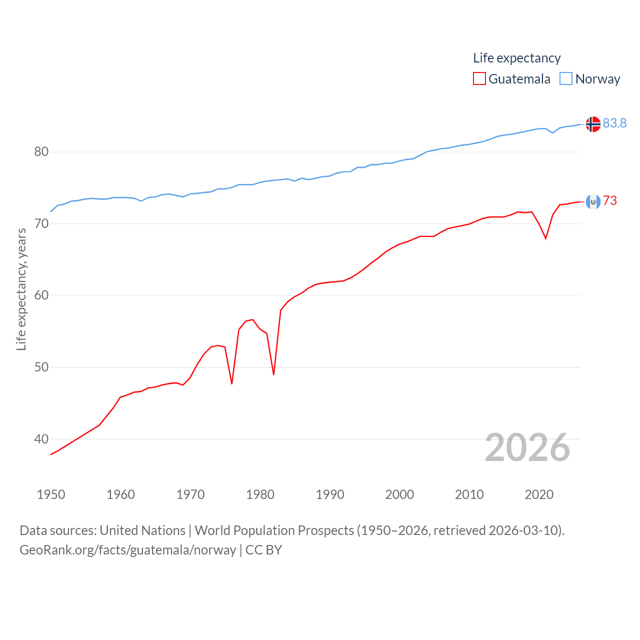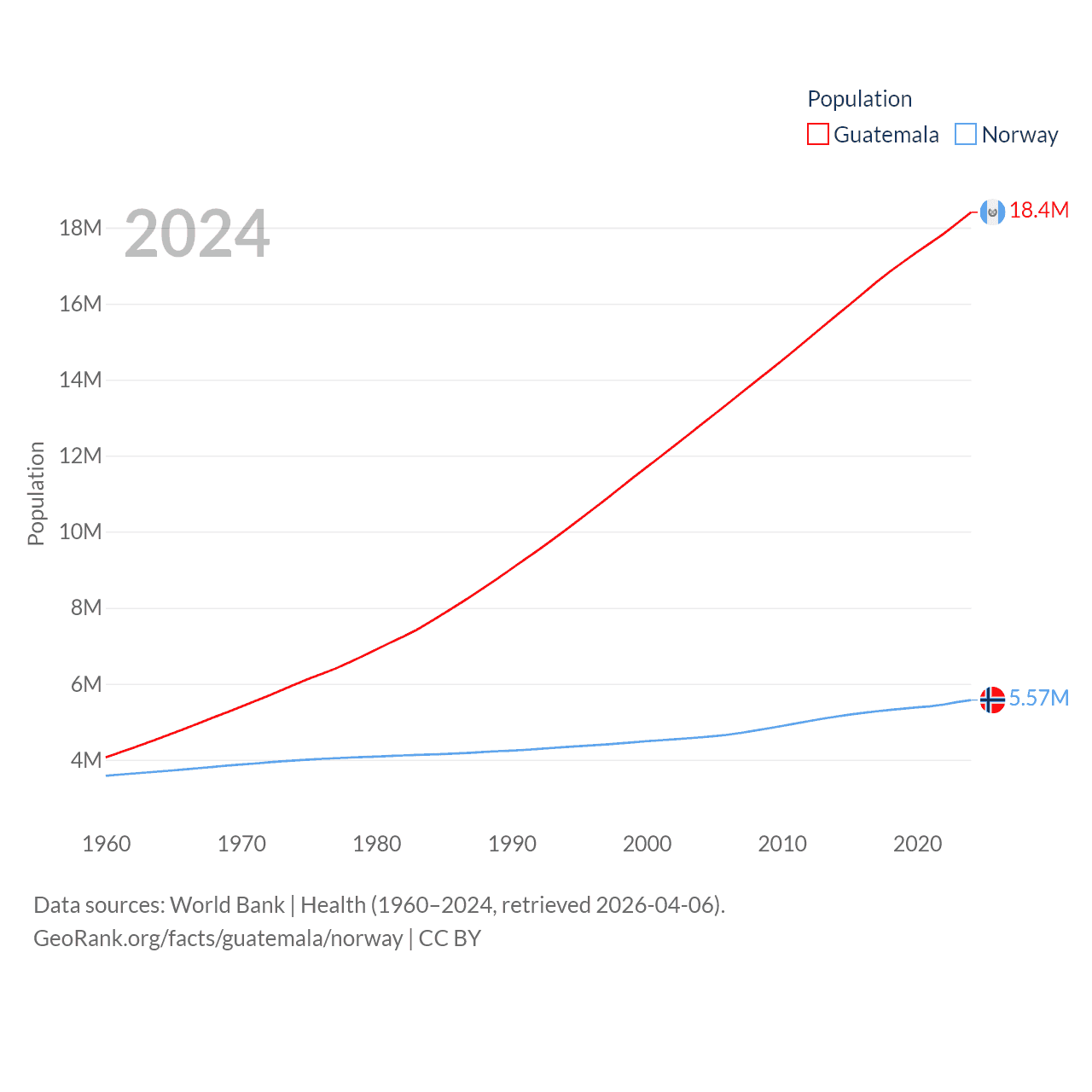 Guatemala has a population of 18.4M (ranked 70/197), compared with 5.57M in Norway (ranked 118/197). Guatemala's land area is 41,375 sq mi versus 140,645 sq mi for Norway (ranked 102nd vs. 62nd).